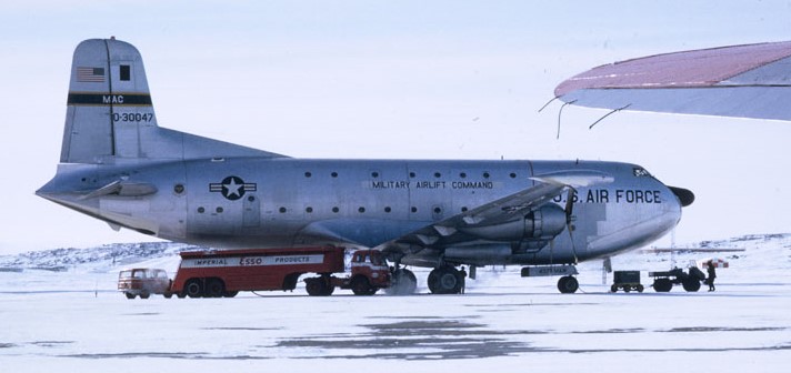 USAF Douglas C-124 Globemaster II (Serial No. 0-30047), heavy-lift cargo aircraft on a northern airfield, March 1968.