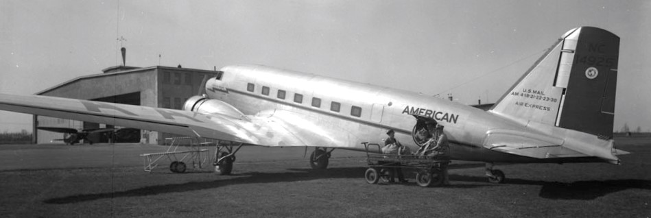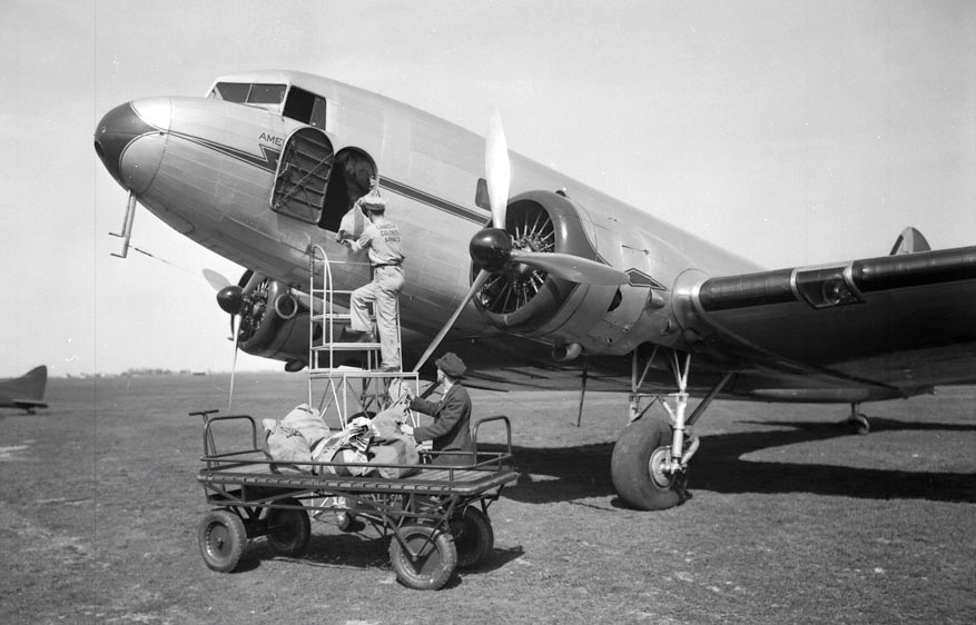 Unloading of airmail from Douglas DC-2 aircraft NC14925 of American Airlines Inc., St. Hubert, P.Q., 1938. The Douglas DC-2 was a 14-passenger, twin-engined airliner that was produced by the American company Douglas Aircraft Company starting in 1934. In 1935, Douglas produced a larger version called the DC-3, which became one of the most successful aircraft in history. (Wikipedia)