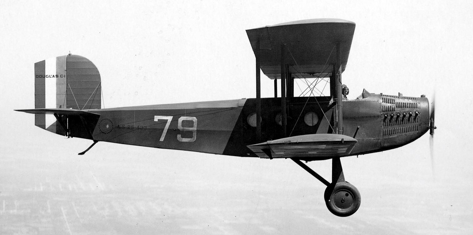 Douglas C-1 No. 79 (S/N 25-433) in flight, taken April 28, 1926. The C-1 was a single-engined cargo/passenger transport aircraft, powered by a 435 hp (324 kW) Liberty V-1650-1 piston engine, accommodation for two crew and six to eight passengers.