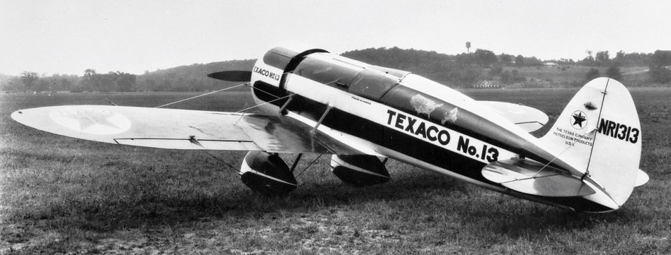 On 13 August 1930 Frank Monroe Hawks flew from Grand Central Air Terminal in Glendale, California, to Curtiss Airport, Valley Stream, Long Island, New York, in a record-breaking elapsed time of 12 hours, 25 minutes, 3 seconds. His airplane was a Travel Air Type R “Mystery Ship” named Texaco No. 13. It carried civil registration NR1313. Hawks’ Texaco No. 13 was the fourth of five specially designed and constructed racing aircraft produced by Travel Air Manufacturing Company of Wichita, Kansas. The company was founded by Walter Beech, Clyde Cessna, and Lloyd Stearman. The “Type R” refers to one of its designers, Herb Rawdon.