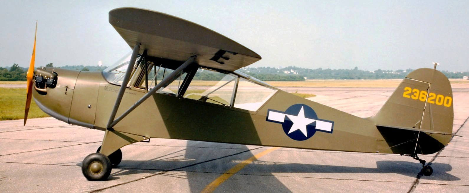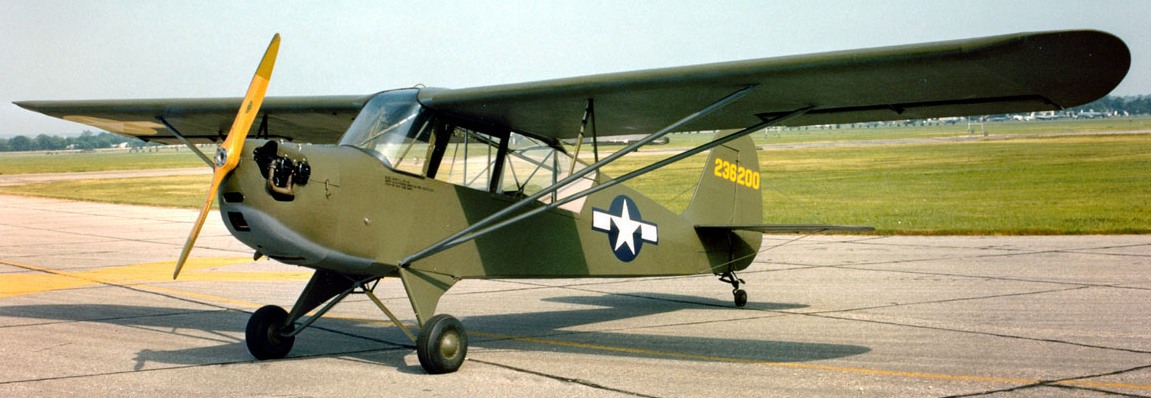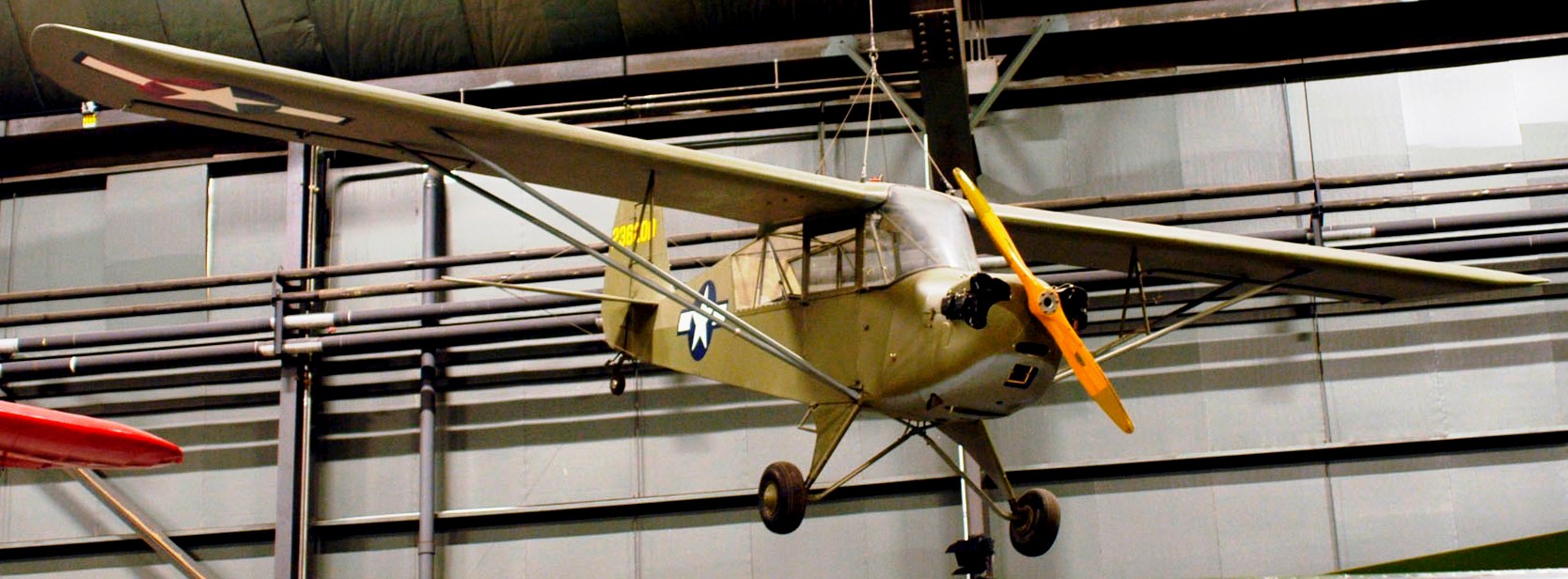 Aeronca L-3B Grasshopper (Serial No. 42-36200). Built during the Second World War, the L-3B on display in the NMUSAF found its way into private hands as surplus after the war. Completely restored by its previous owner, Paul Grice of Waynesville, Ohio, the airplane was flown to the museum in 1984.