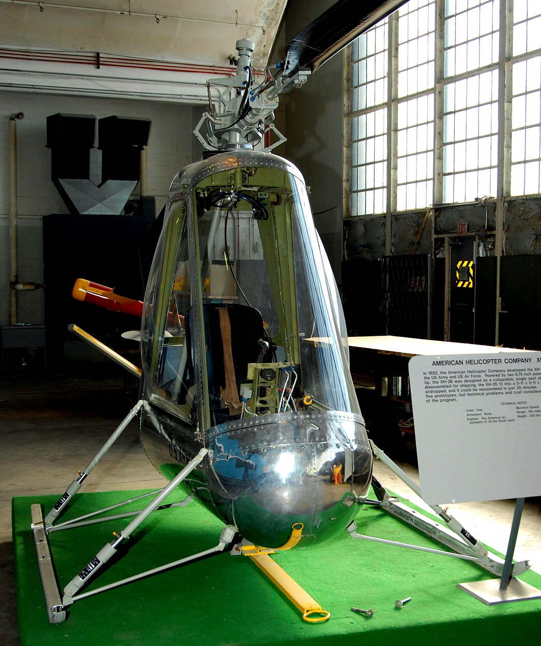 American Helicopter Co. XH-26 Jet Jeep (Serial No. 01841). The XH-26 is a one-man, pulsejet-driven helicopter powered by two pulsejets on the end of each rotor blade tip. American Helicopter chose the name “Jet Jeep” because the XH-26 would be used like an aerial Jeep. When collapsed, its storage container fit on a trailer towed by the one-quarter ton Jeep. If stripped for air drop, the Jet Jeep weighed less than 300 pounds, and it could be assembled by two men in just 20 minutes. It could also burn the same fuel as a Jeep. The Army and USAF evaluated five prototype Jet Jeeps, and they performed well. Unfortunately, the pulsejets were so loud that the Army found the aircraft unsuitable, and cost considerations forced the cancellation of the program.