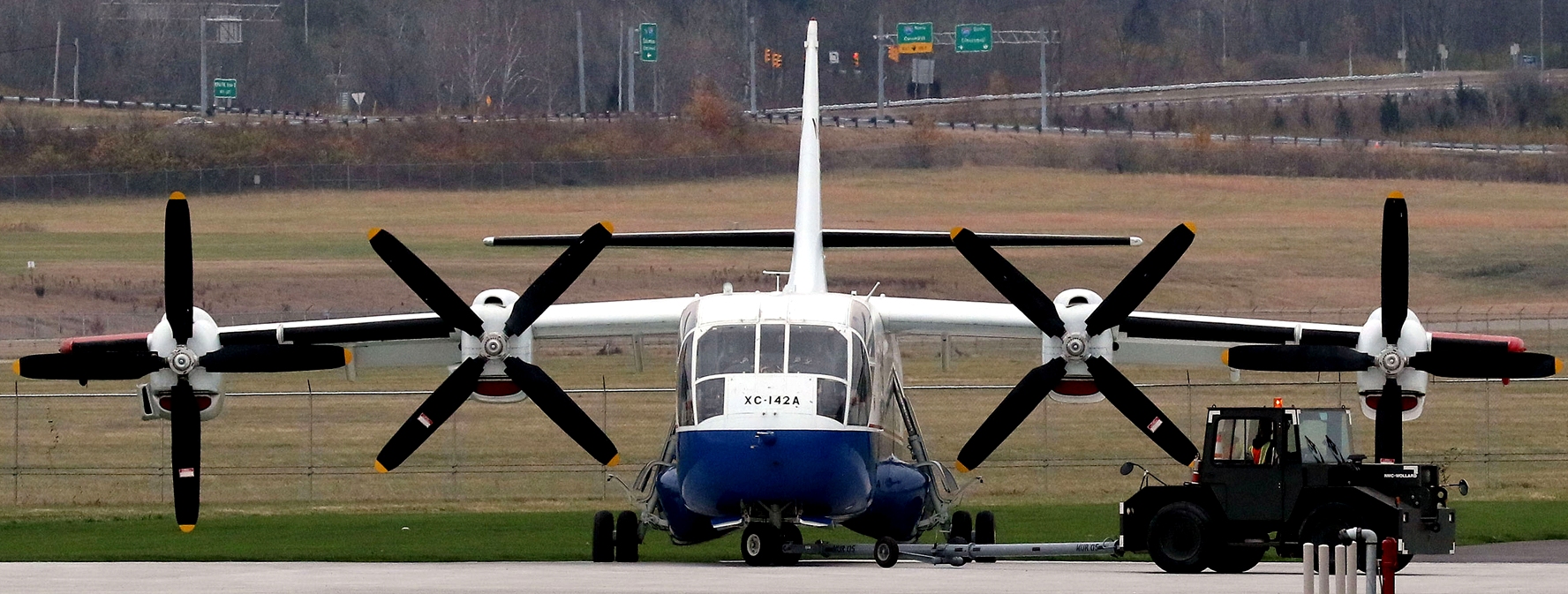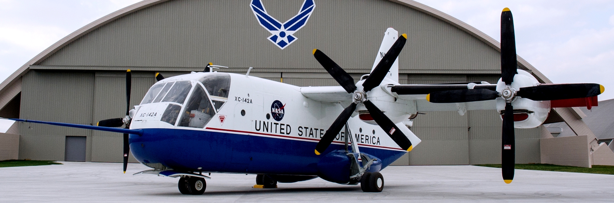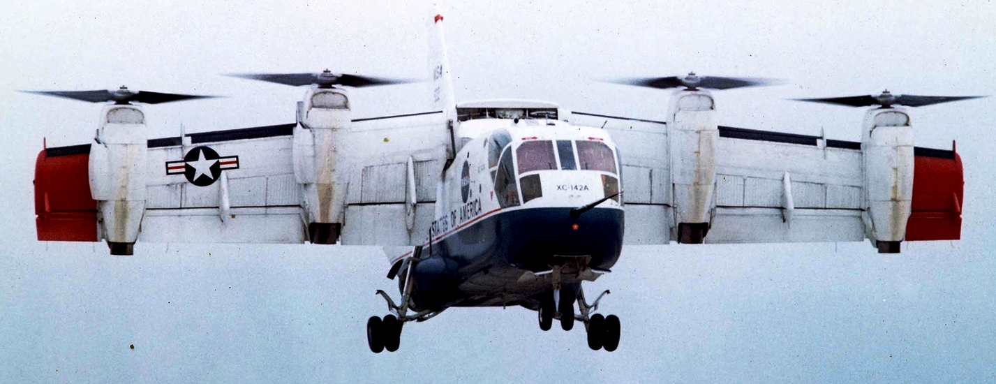 Chance-Vought/LTV XC-142A (Serial No. 62-5924). Five tilt-wing XC-142As were built in the 1960s to explore the suitability of Vertical/Short TakeOff and Landing (VSTOL) transports. VSTOL transports permit rapid movement of troops and supplies into and out of unprepared areas. XC-142As were tested extensively by the US Army, US Navy, USAF and NASA. An XC-142A first flew conventionally in September 1964 and performed its first transitional flight (vertical takeoff, changing to forward flight, and landing vertically) in January 1965 . In tests, XC-142As were flown from airspeeds of 35 mph backwards to 400 mph forward. Although the XC-142A did not go into production, it foreshadowed future operational VSTOL transports like the V-22 Osprey. The aircraft on display in the NMUSAF, the only remaining XC-142A, was flown to the museum in 1970.