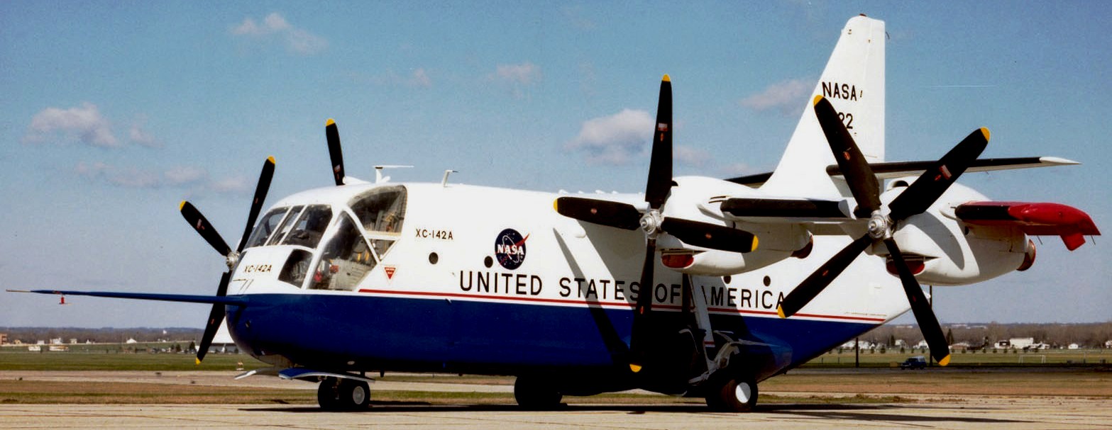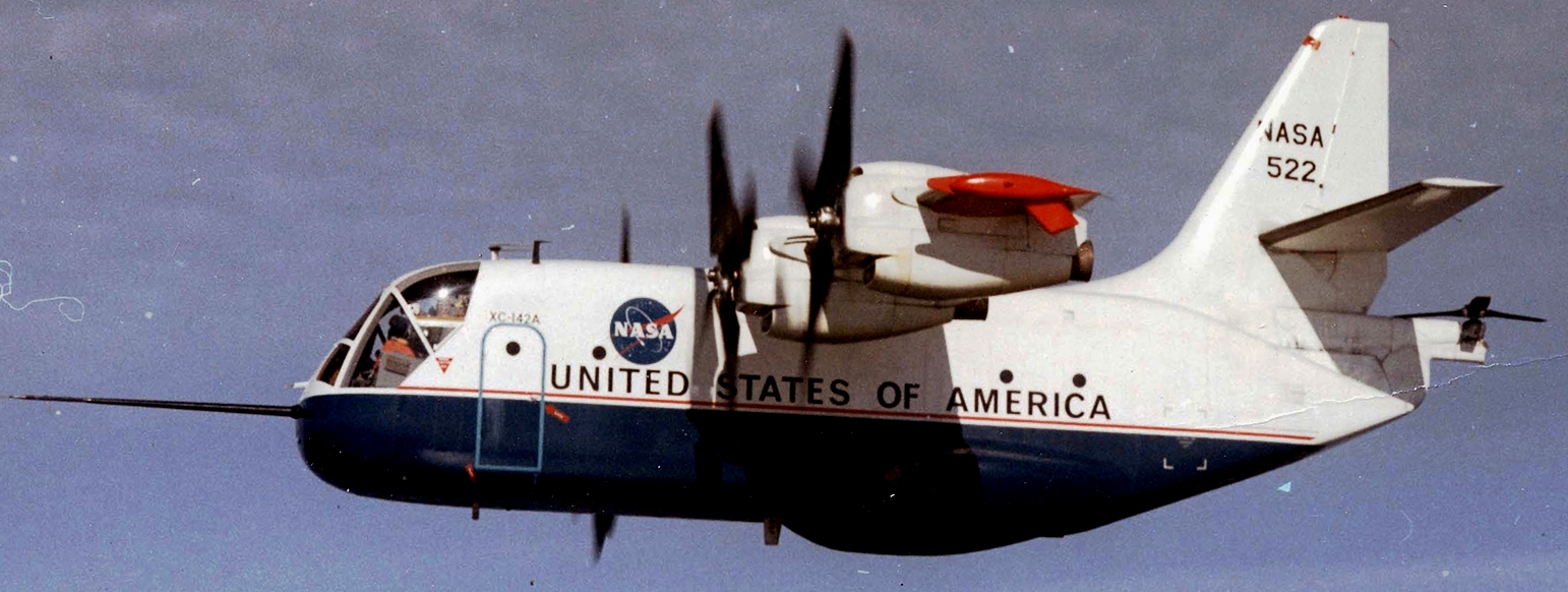 Ling-Temco-Vought XC-142A tested at the NASA Langley Research Cente, 17 Jan 1969. A tilt-wing prototype used in vertical takeoff and landing (VTOL) studies. After vertical takeoff with the wing pivoted upward, the wing pivoted horizontally and the craft would fly as a conventional airplane.” Langley was extensively involved in wind-tunnel testing of XC-14A models, and in the actual flight evaluations of the actual airplane.