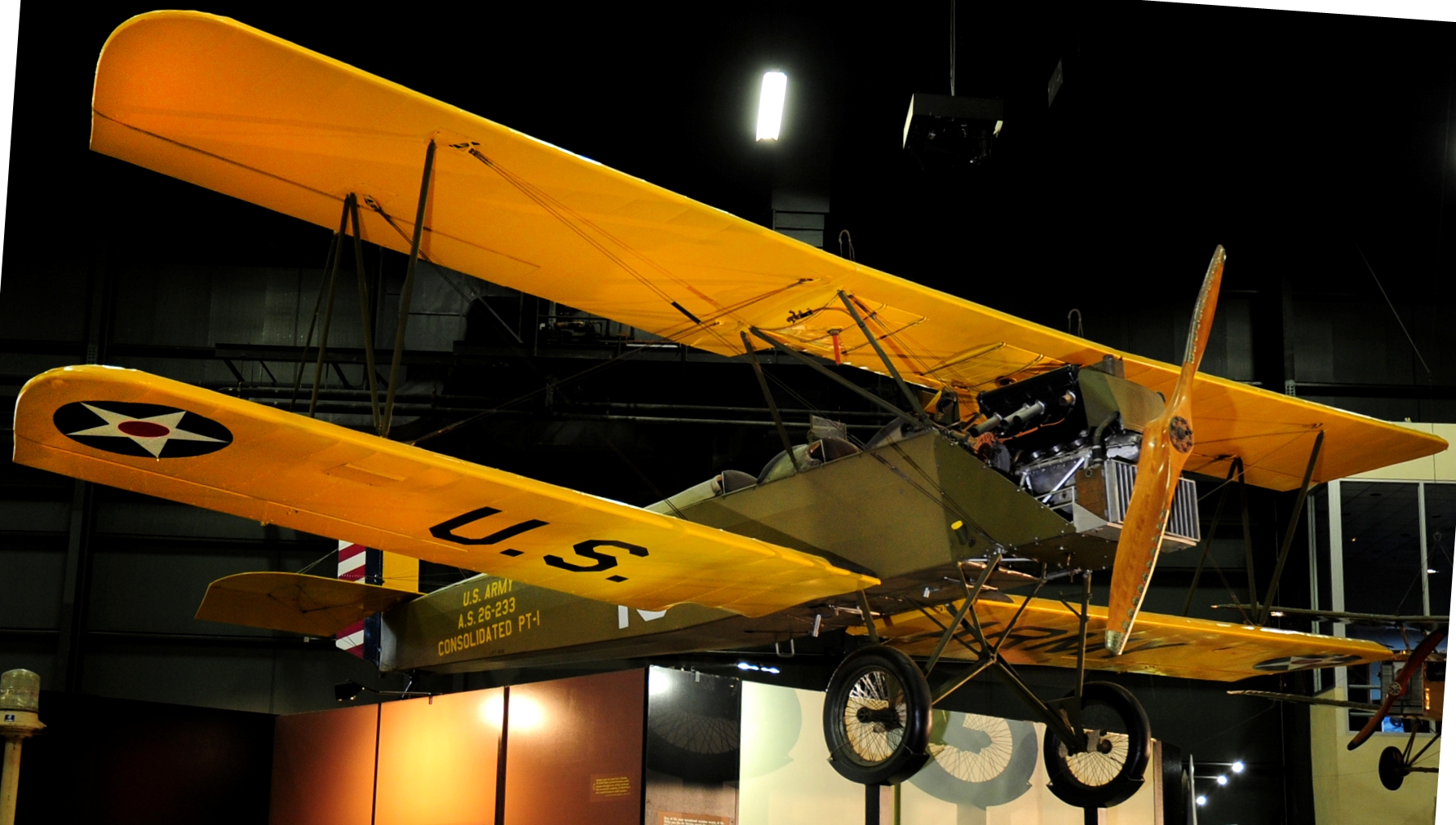 Consolidated PT-1 Trusty (Serial No. 26-233). The PT-1 featured a welded fuselage framework of chrome-molybdenum steel tubing. A departure from the all-wood structures found in other trainers, the structure proved so sturdy and dependable that the PT-1 earned the nickname “Trusty“. Easy to fly, the Trusty made some students overconfident, and they received a shock when they advanced to faster airplanes with more difficult handling characteristics. The museum obtained the airplane on display from The Ohio State University in 1957.