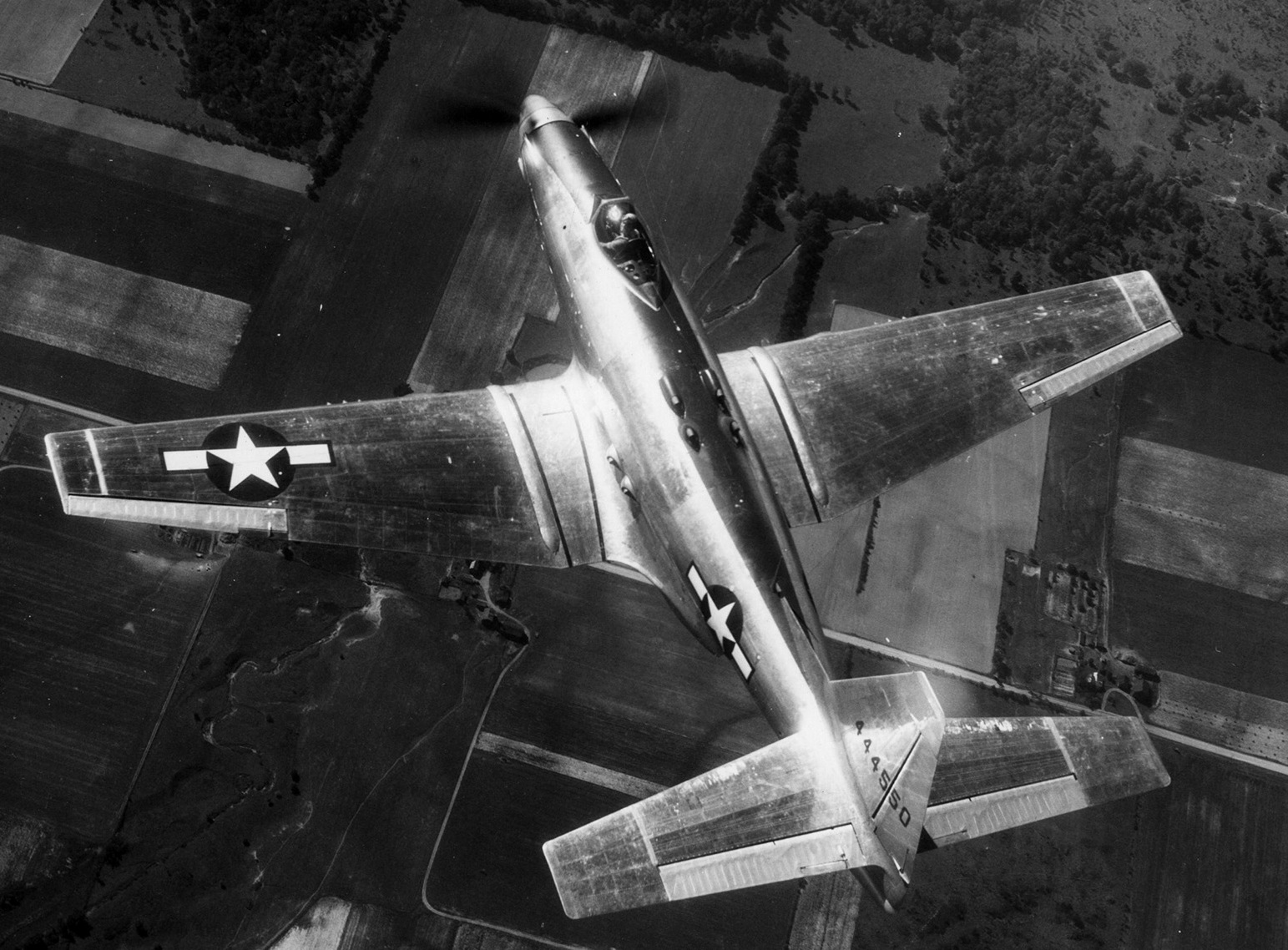 Fisher P-75A (Serial No. 44-44550) overhead view in flight.