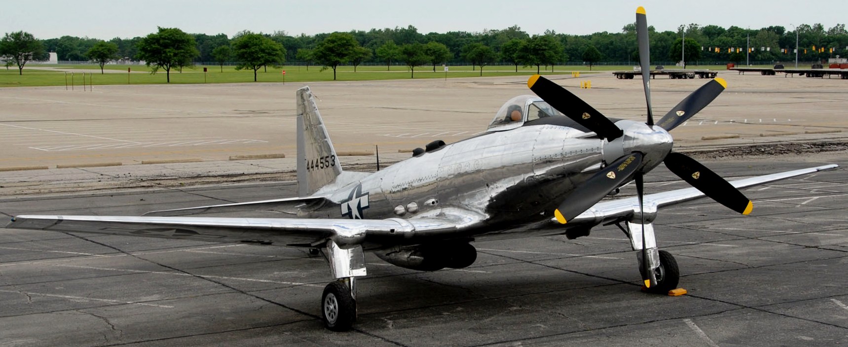 Fisher P-75A Eagle (Serial No. 44-44553).  The Fisher Body Division of General Motors developed the P-75 Eagle to fill an urgent need for an interceptor early in the Second World War.  The original P-75 design incorporated the most powerful inline engine available and components from other aircraft as a way to expedite production.  Flight tests in late 1943 revealed unsatisfactory performance with the first two XP-75 prototypes . At the same time, the Eagle’s mission was changed to long-range escort. Ultimately, the idea of using other aircraft components had to be abandoned.  Fisher continued development of the design with the heavily-modified P-75A.  By the fall of 1944, however, the U.S. Army Air Forces already had capable escort aircraft like the P-51 Mustang and P-47 Thunderbolt, and it canceled the order for 2,500 P-75As.  Only eight XP-75s and six P-75As were built.