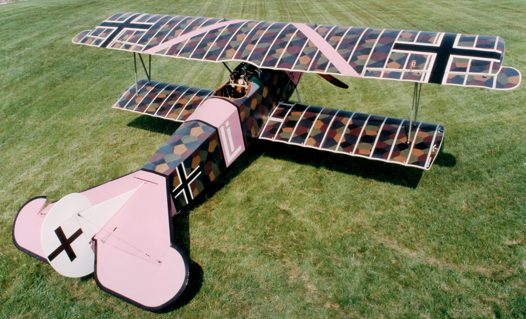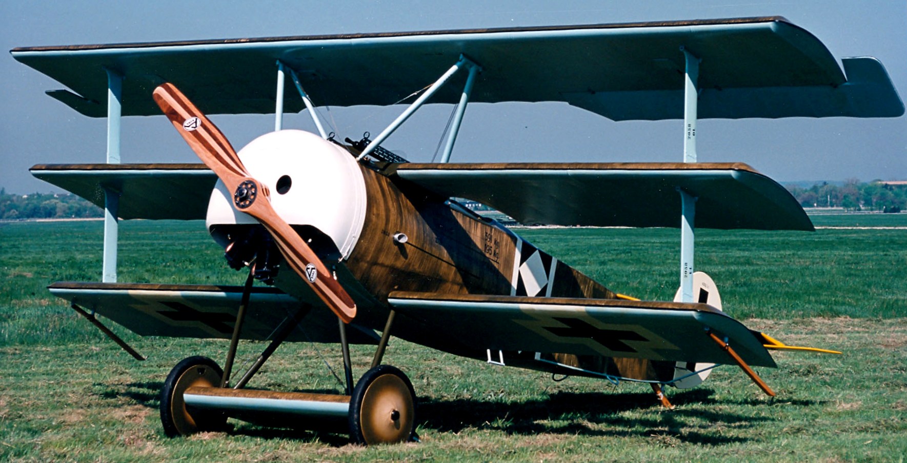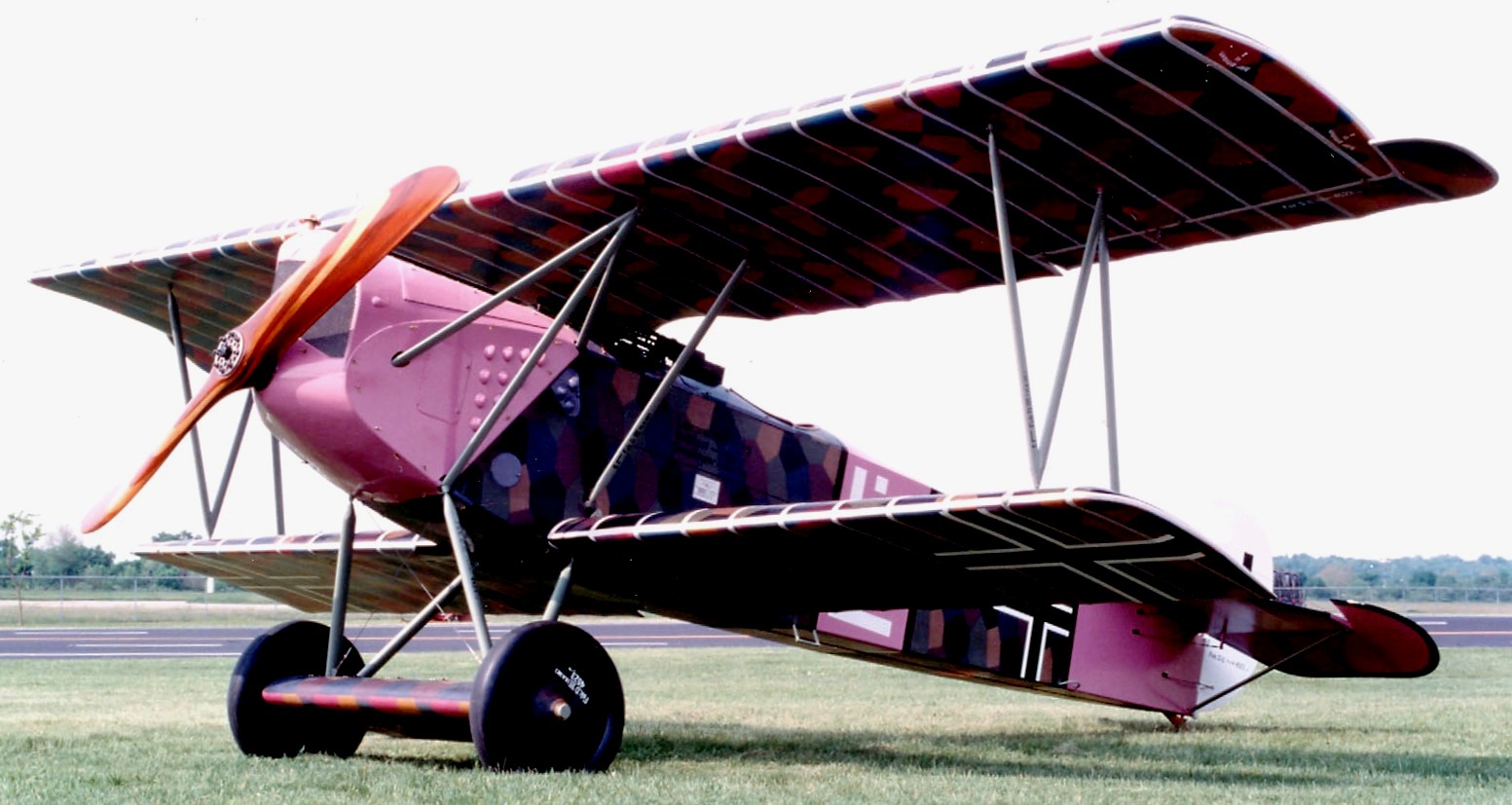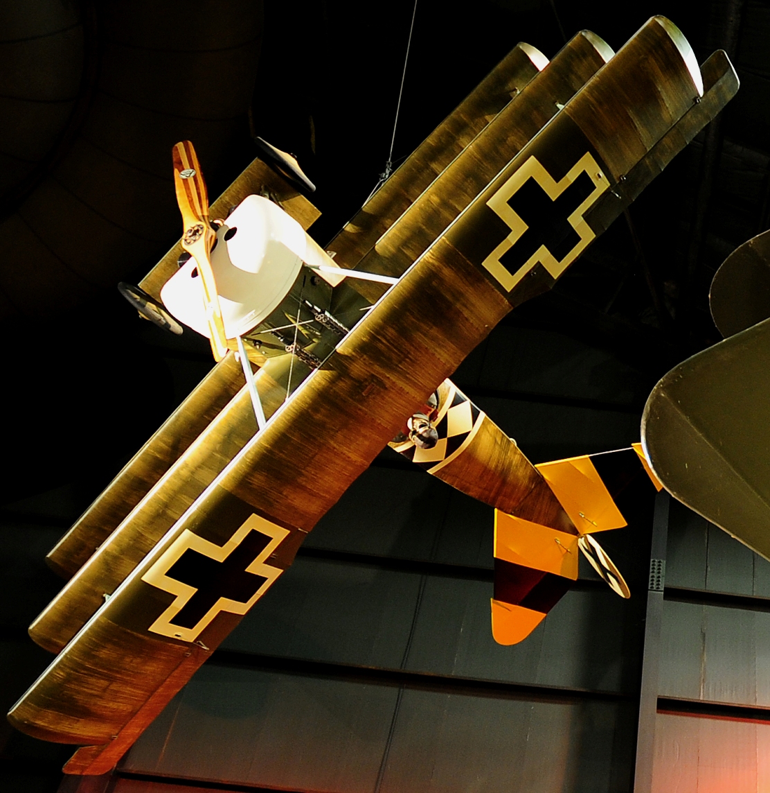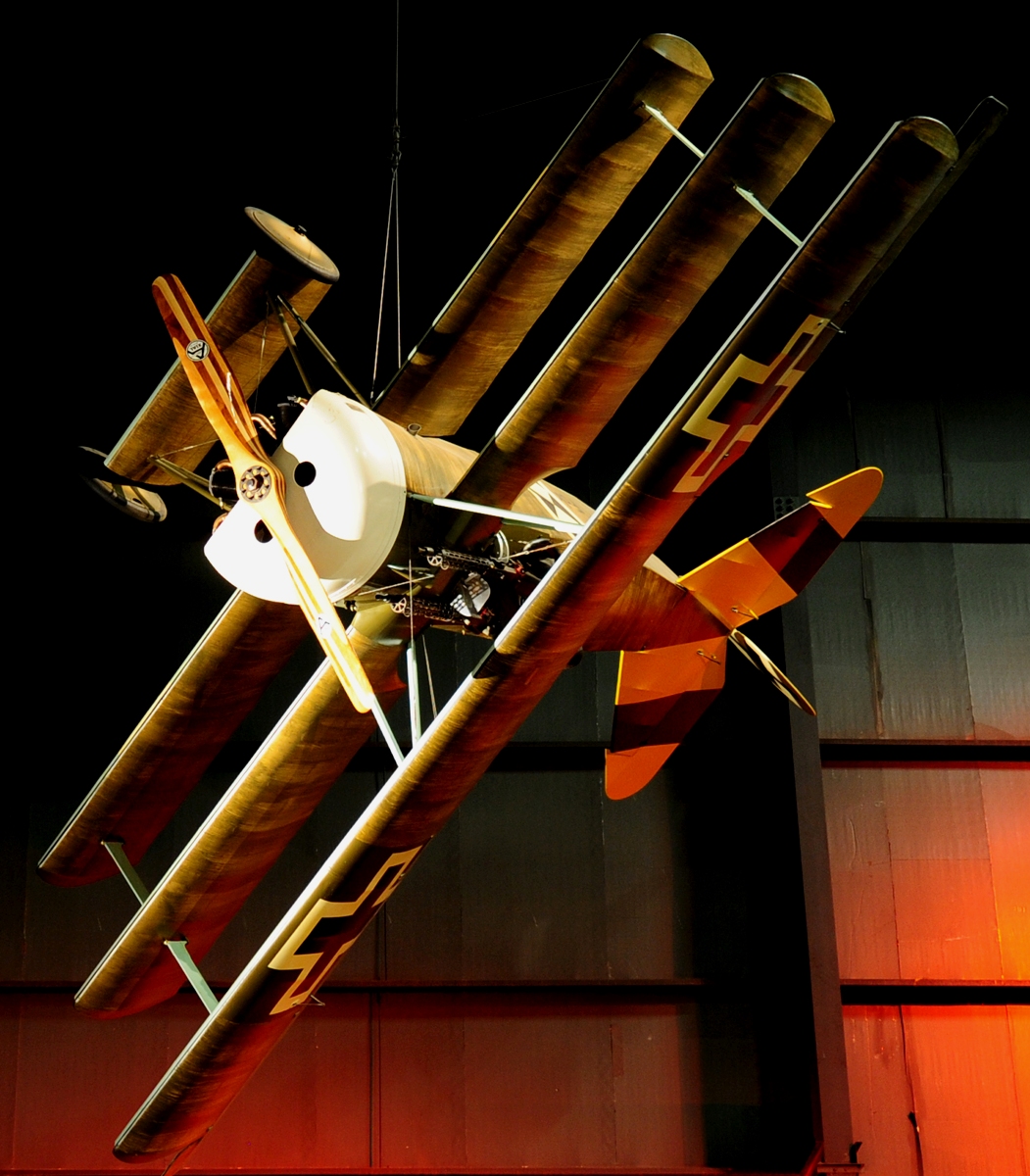 Fokker Dr. I Triplane (Serial No.1).  Suspended from the ceiling.  This reproduction is painted to represent the aircraft flown by Lt. Arthur Rahn in April 1918 when he served with Jagdstaffel 19.  Lt. Rahn is credited with six confirmed victories.  The aircraft was placed on display in the NMUSAF in April 1994.
