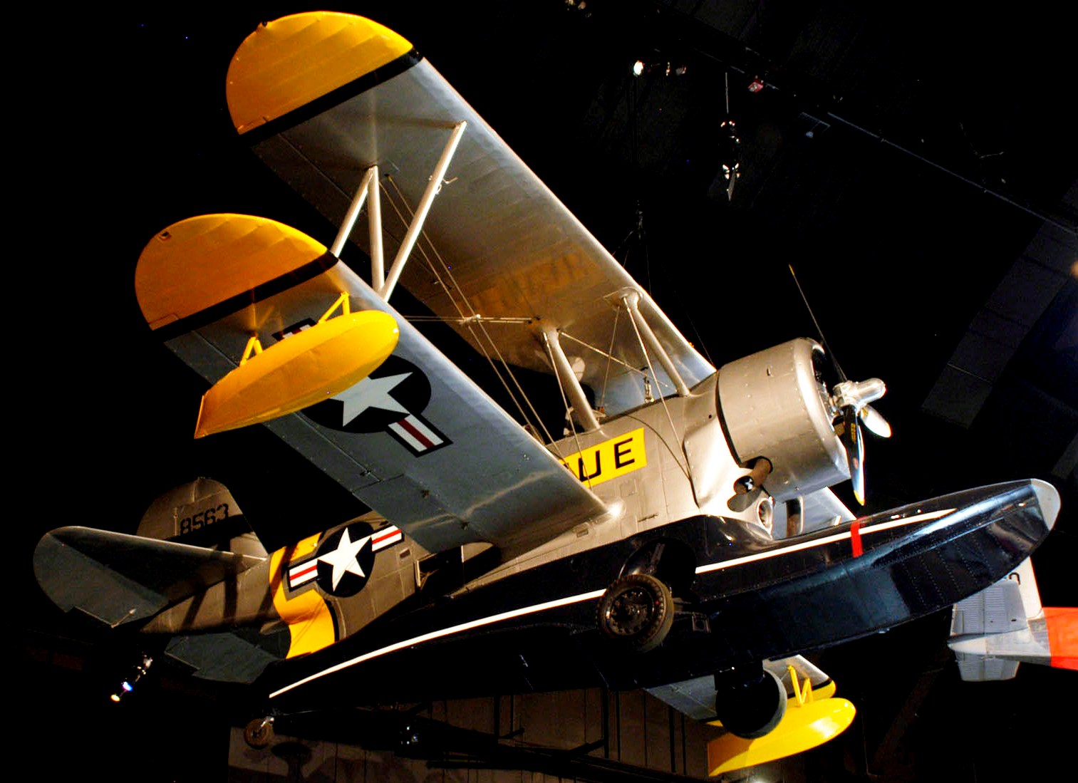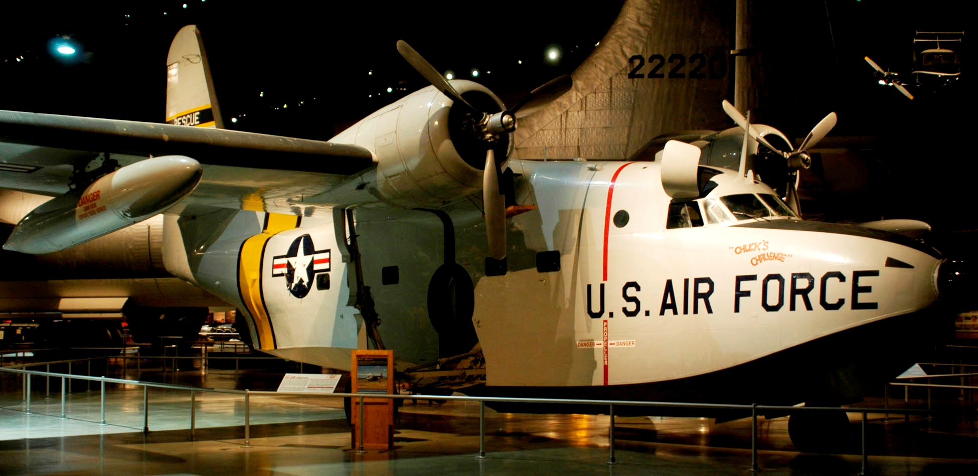 Grumman OA-12 Duck, Reg. No. N67790, (Serial No. 33587), painted as 48-0563. The OA-12 Duck was the USAF version of the Navy J2F-6 amphibian. After the Second World War, the USAF’ Air Rescue Service needed special aircraft for overwater missions, and in 1948 the USAF acquired eight surplus Navy J2F-6s. Designated the OA-12, five of these aircraft went to Alaska for duty with the 10th Air Rescue Squadron. The Columbia Aircraft Corp. of Valley Stream, New York, built the Grumman-designed J2F-6 Duck on display in the NMUSAF. it was delivered to the U.S. Coast Guard on 9 June1945, and became surplus in 1946. It served with a series of civilian owners and “starred” in several films, including “Murphy’s War” of the early 1970s. This aircraft is painted to represent one of the rescue OA-12s the USAF acquired in 1948.