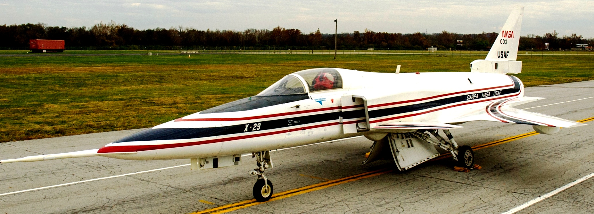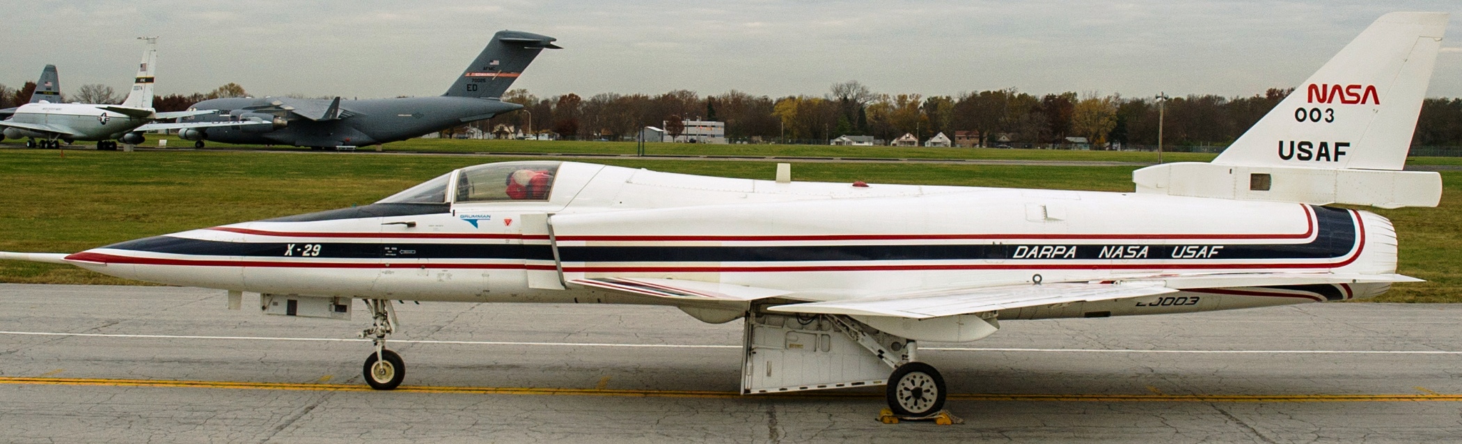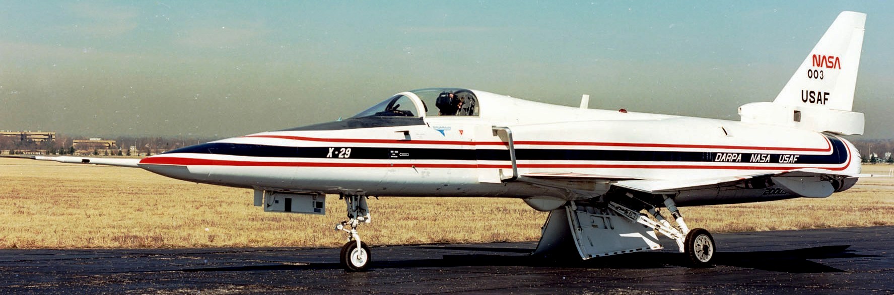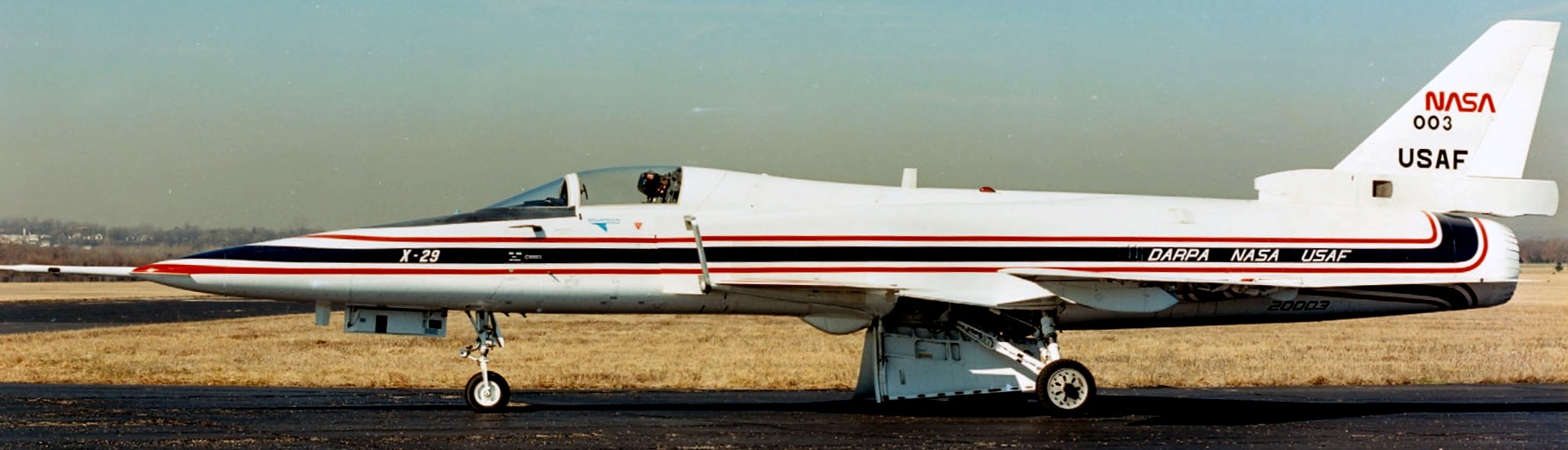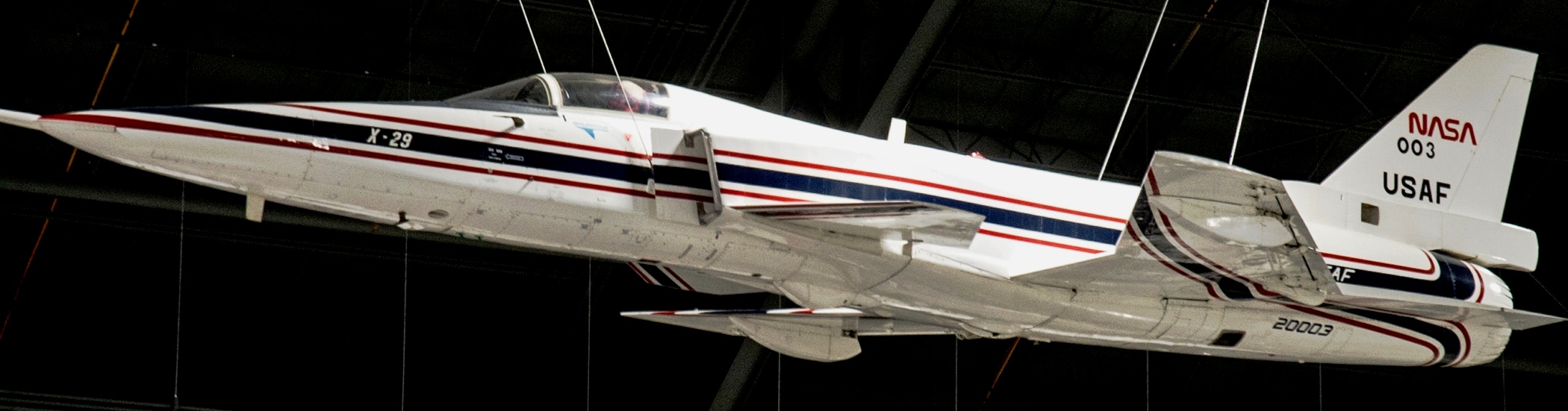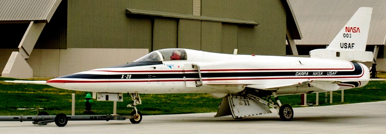 Grumman X-29A (Serial No. 82-0003). In 1985 the X-29A on display became the world’s first forward-swept aircraft to fly supersonically. The X-29A program explored cutting-edge aircraft design features, including forward-swept wings, advanced materials, a forward-mounted elevator (or canard) and a computerized flight control system. It was managed by the USAF and funded by DARPA (Defense Advanced Research Projects Agency), the USAF and NASA. During the Second World War, Germany and the United States experimented with forward-swept wings, but both encountered problems with the metal wings bending dangerously at higher speeds. As stronger composite materials became available in the 1970s, however, wing structures could be both lightweight and very rigid. The NMUSAF’s aircraft is the first of two X-29As built by Grumman, and it made its first flight in December 1984. The second X-29A first flew in 1989 and continued to perform test flights into the early 1990s. After successfully completing the test program, the X-29A on display was retired to the museum in late 1994.