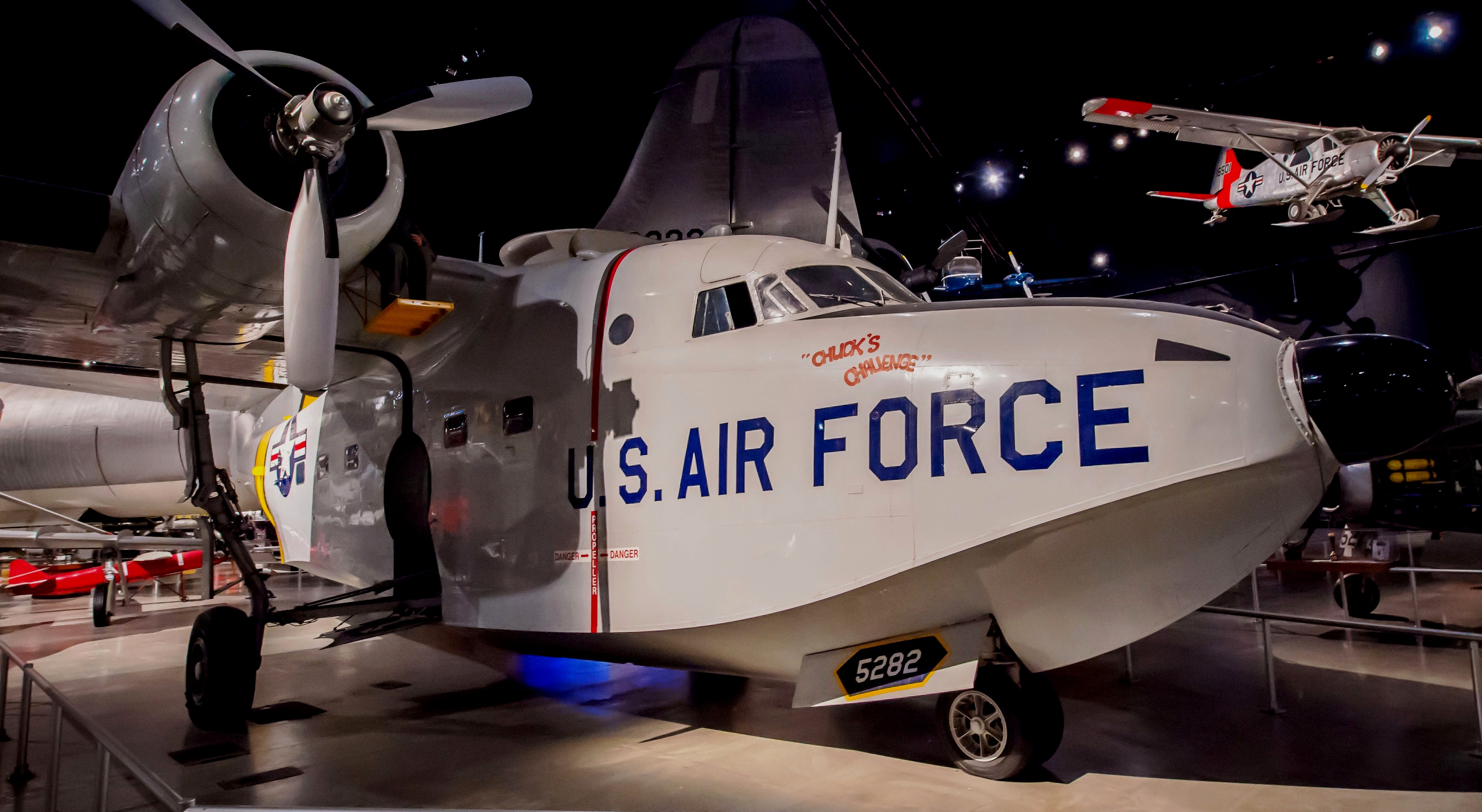 Grumman HU-16B Albatross (Serial No. 51-5282), C/N G-163. The HU-16 on display in the NMUSAF was one of the last operational USAF Albatrosses. The aircraft established a world altitude record for twin-engine amphibians when it reached 32,883 feet on 4 July 1973. Two weeks later, the aircraft was retired and flown to the museum.