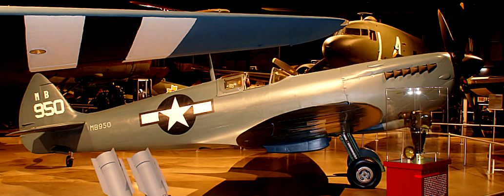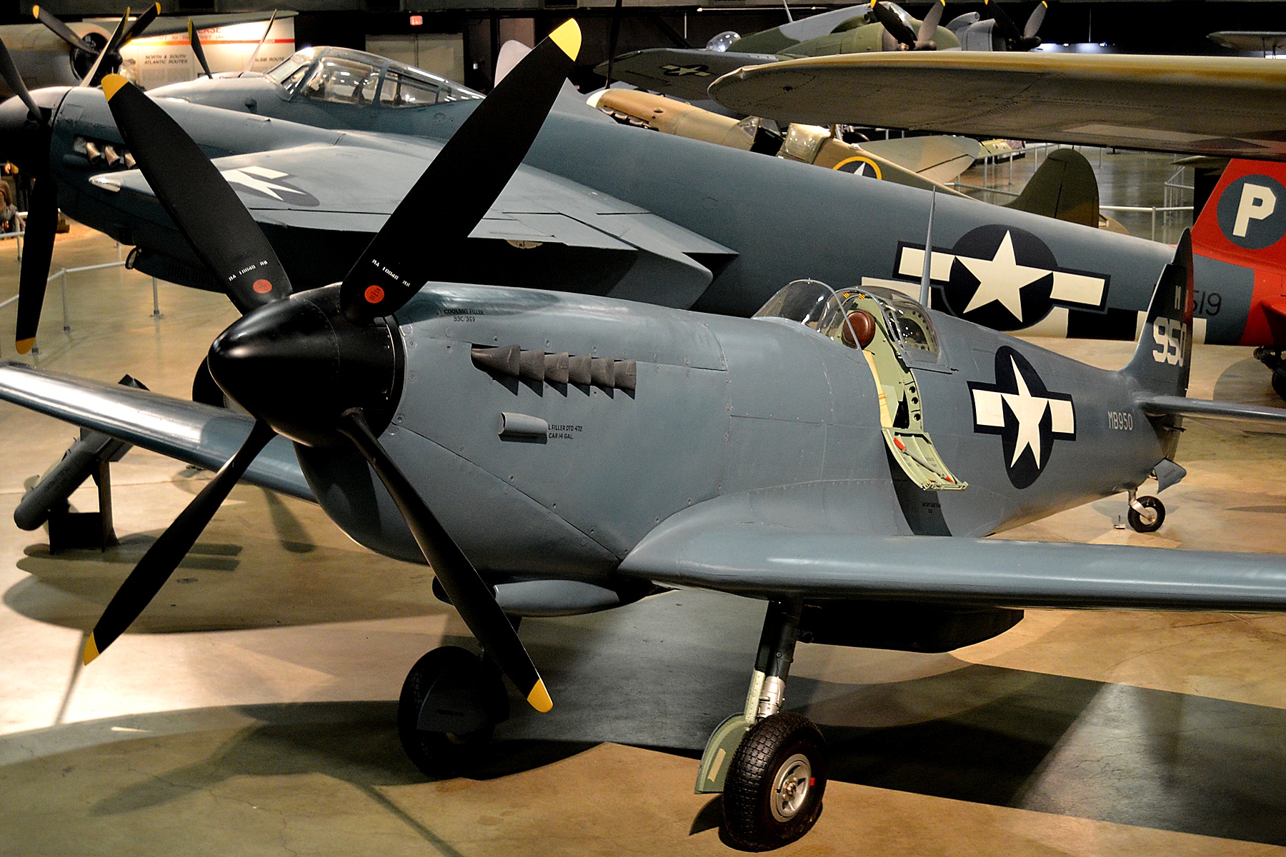 Supermarine Spitfire PR Mk. XI, RAF (Serial No. PA908).  This aircraft on display in the NMUSAF is painted in an overall photo-reconnaissance (PR) Blue colour scheme marked to represent one of the U.S. Army Air Forces’ 14th Photographic Squadron of the 8th Air Force which operated Spitfire Mark XIs from November 1943 to April 1945, flying hazardous long-range reconnaissance missions over mainland Europe from Mount Farm airfield in England..  It was placed on display in the NMUSAF in 1993.