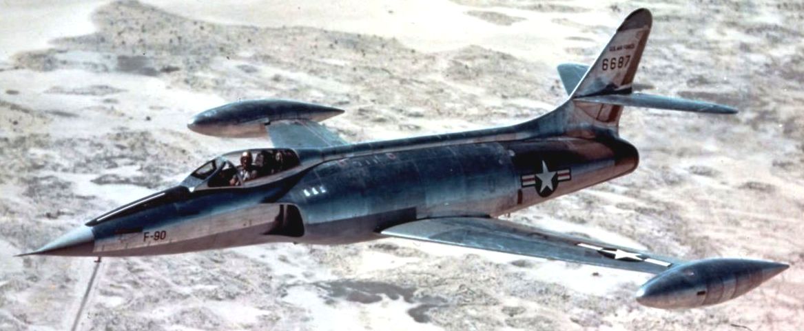 Lockheed XF-90 (Serial No. 46-688), c/n 090-1002. The Lockheed XF-90 was built in response to a USAF requirement for a long-range penetration fighter and bomber escort. The same requirement produced the McDonnell XF-88 Voodoo. Lockheed received a contract for two prototype XP-90s (redesignated XF-90 in 1948). The design was developed by Willis Hawkins and the Skunk Works team under Kelly Johnson. Two prototypes were built (Serial Nos 46-0687 and 46-0688). Developmental and political difficulties delayed the first flight until 3 June 1949, with Chief Test Pilot Tony LeVier at the controls. The XF-90 was the first USAF jet with an afterburner and the first Lockheed jet to fly supersonic, albeit in a dive . It also incorporated an unusual vertical stabilizer that could be moved fore and aft for horizontal stabilizer adjustment. Partly because Lockheed’s design proved underpowered, it placed second to McDonnell’s XF-88 Voodoo which won the production contract in September 1950, before the penetration fighter project was abandoned altogether. Upon Lockheed losing the production contract, the two prototypes were retired to other testing roles. The first aircraft (Serial No. 46-0687) was shipped to the NACA Laboratory in Cleveland, Ohio in 1953 for structural tests. It was no longer flyable, and its extremely strong airframe was tested to destruction. The second aircraft (Serial No. 46-688) survived three atomic blasts at Frenchmen Flat within the Nevada Test Site in 1952. In 2003, the heavily damaged hulk was recovered from the Nevada test site and moved to the NMUSAF, where it is currently undergoing minor restoration in one of the Museum’s restoration facility hangars. Its wings have been removed, and its nose is mangled from the nuclear blasts. During the decontamination process, all the rivets had to be removed to remove radioactive sand. At present, the museum plans to display the XF-90 in its damaged, mostly unrestored condition, to demonstrate the effects of nuclear weaponry.