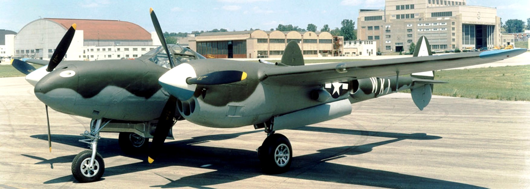 Lockheed P-38L Lightning (Serial No. 44-53232), painted as (Serial No. 42-67855), a P-38J of the 55th Fighter Squadron, based in England in 1944. The P-38L was donated to the museum in 1961 by the Kaufmann Foundation, Philadelphia, Pennsylvania. The top hats on the left side of the aircraft represent the nine bomber escort missions flown by its pilot, 2nd Lt. Royal D. Frey, with the yellow hat signifying five and the white hats one each.