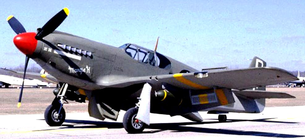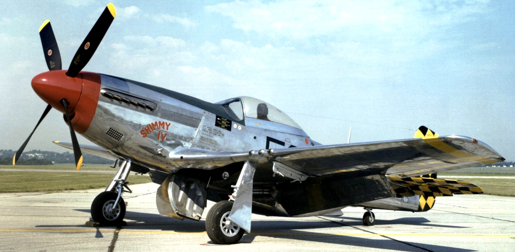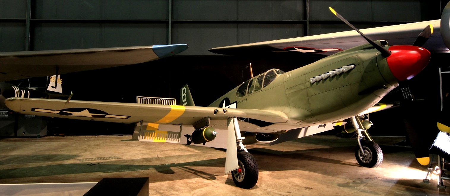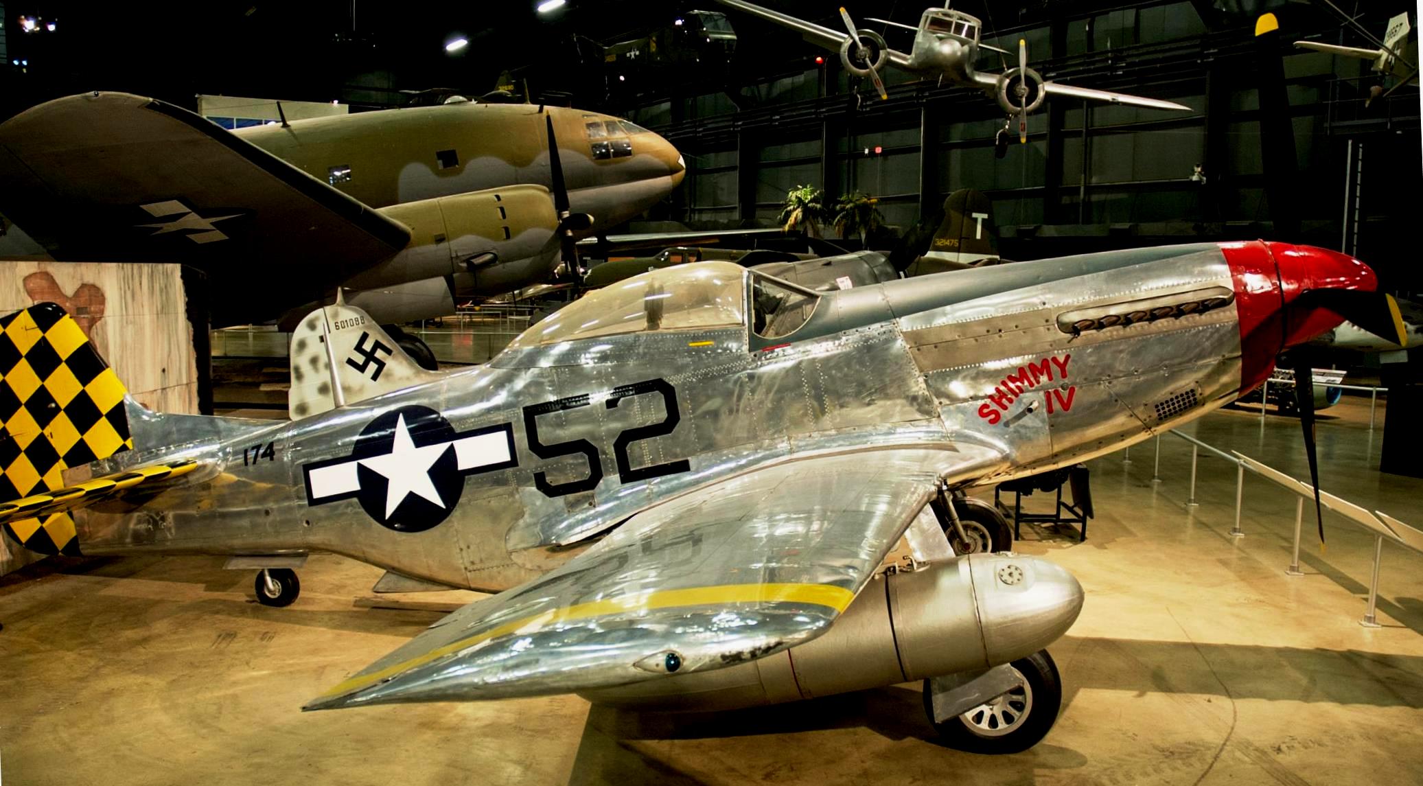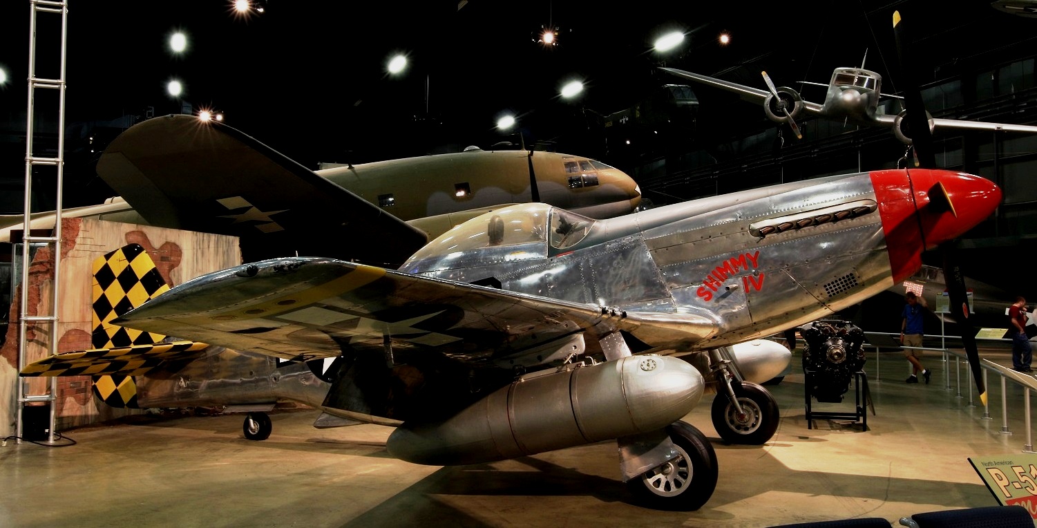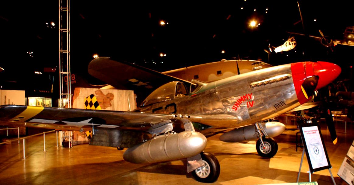 North American P-51D Mustang (Serial No. 44-74936), 52, C/N 122-41476, “Shimmy IV“.  The NMUSAF P-51D on display was the last Mustang assigned to a USAF tactical unit.  It is painted as P-51D (Serial No.44-15174), as flown by Col C.L. Sluder, Commander of the 325th Fighter Group, 15th Air Force in North Africa and Italy in 1944.  The name of this aircraft, Shimmy IV, is derived from the names of his daughter, Sharon, and his wife, Zimmy.