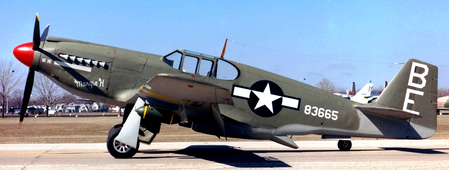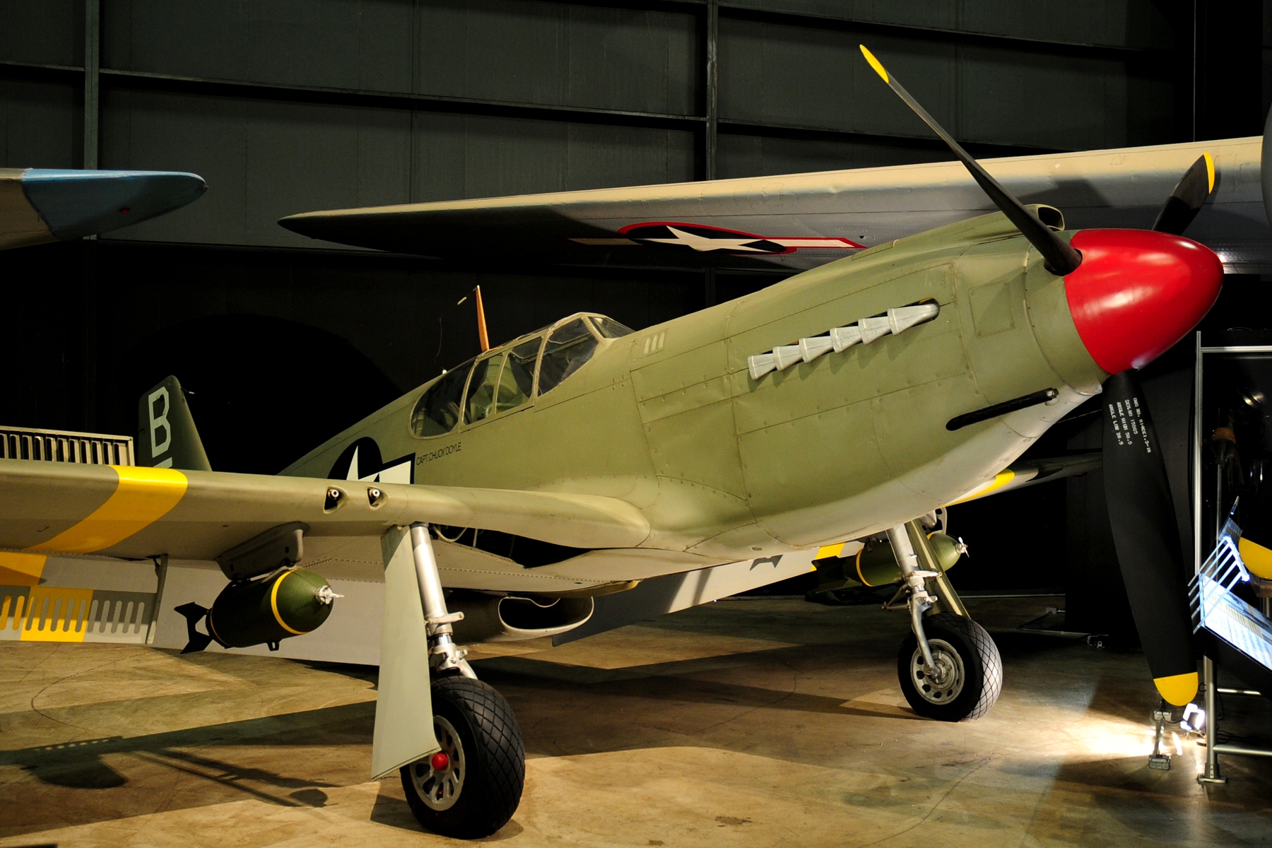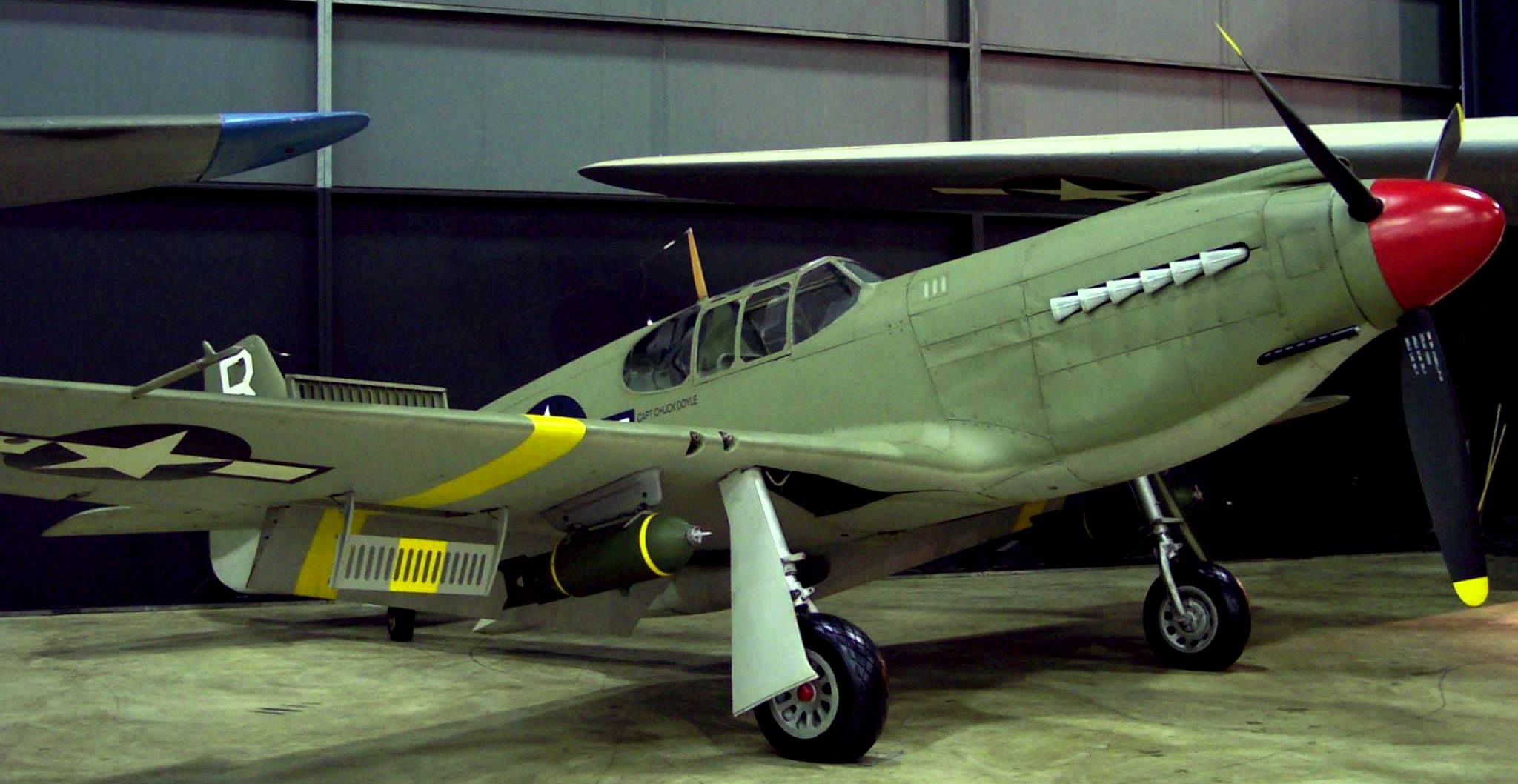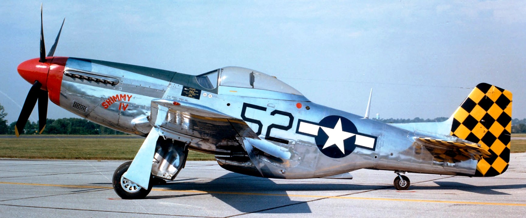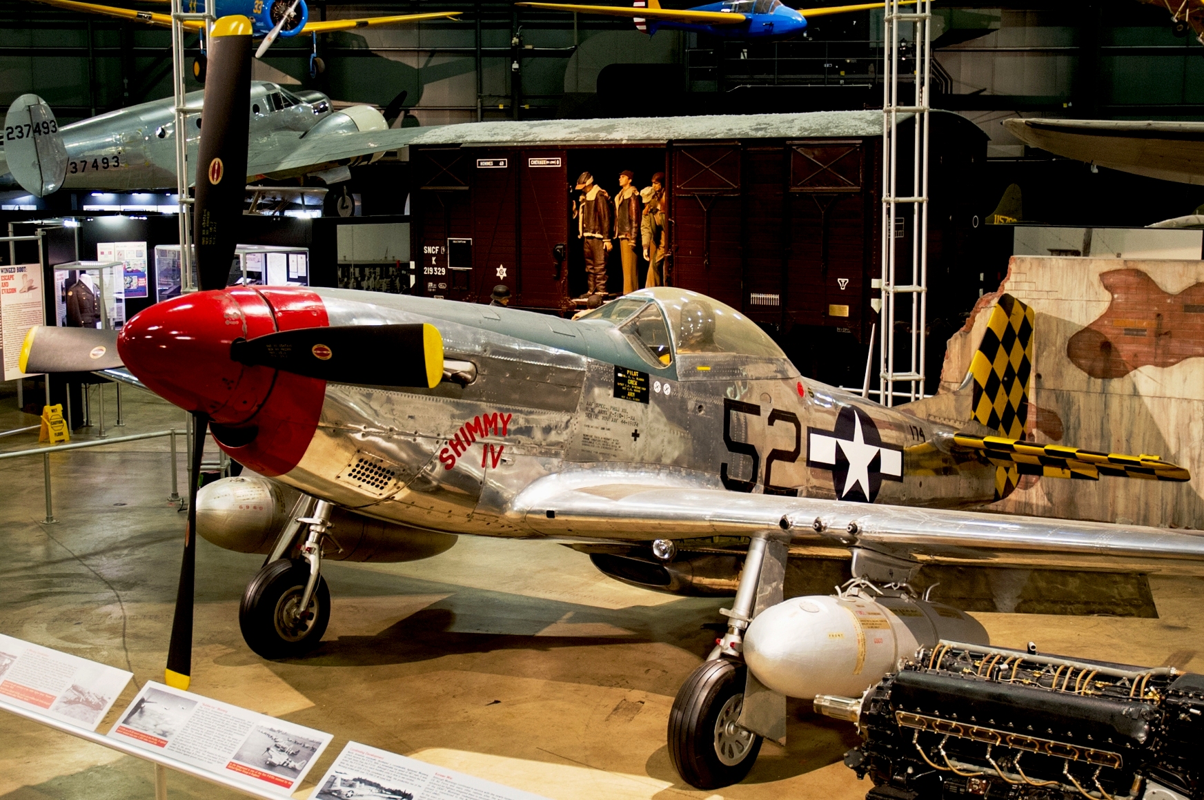 North American P-51D Mustang (Serial No. 44-74936), 52, C/N 122-41476, “Shimmy IV“.  The NMUSAF P-51D on display was the last Mustang assigned to a USAF tactical unit.  It is painted as P-51D (Serial No.44-15174), as flown by Col C.L. Sluder, Commander of the 325th Fighter Group, 15th Air Force in North Africa and Italy in 1944.  The name of this aircraft, Shimmy IV, is derived from the names of his daughter, Sharon, and his wife, Zimmy.