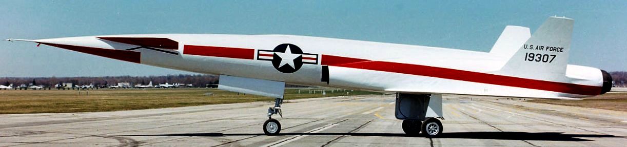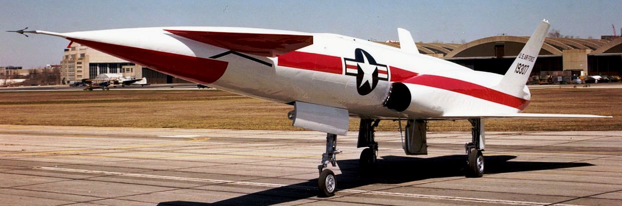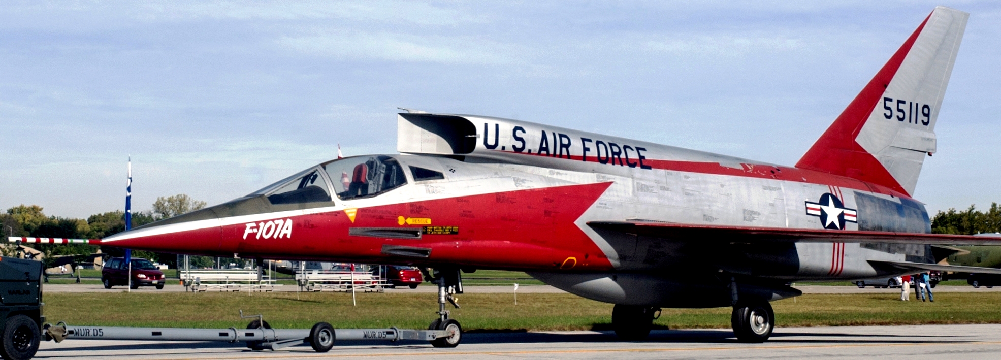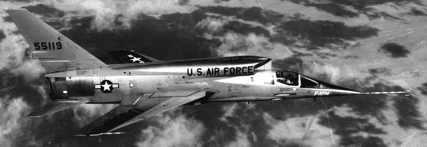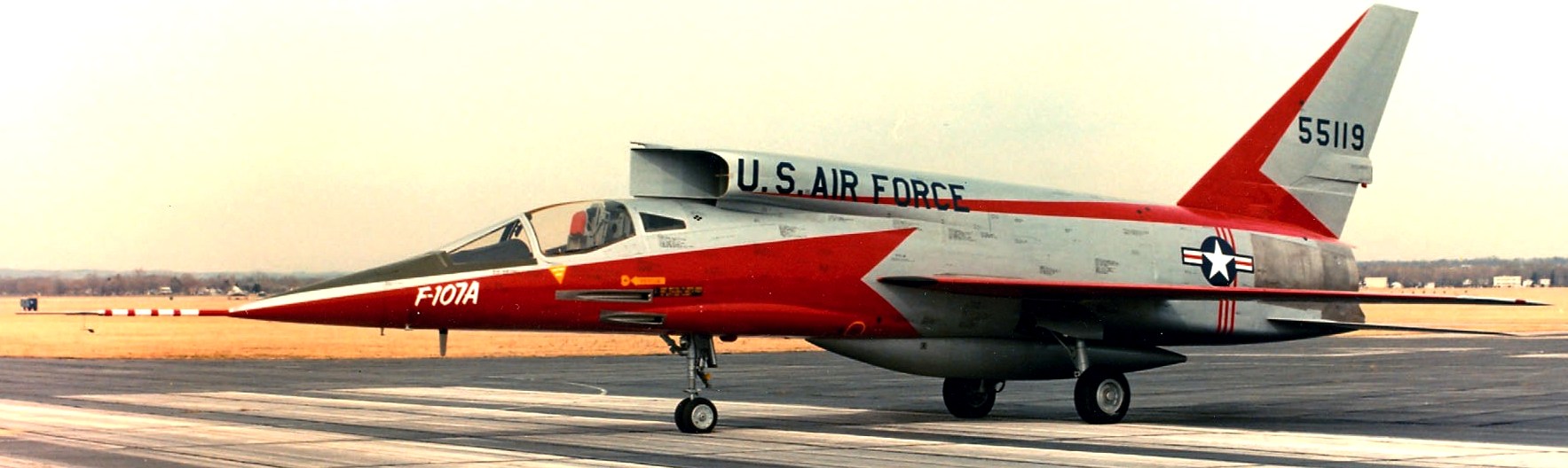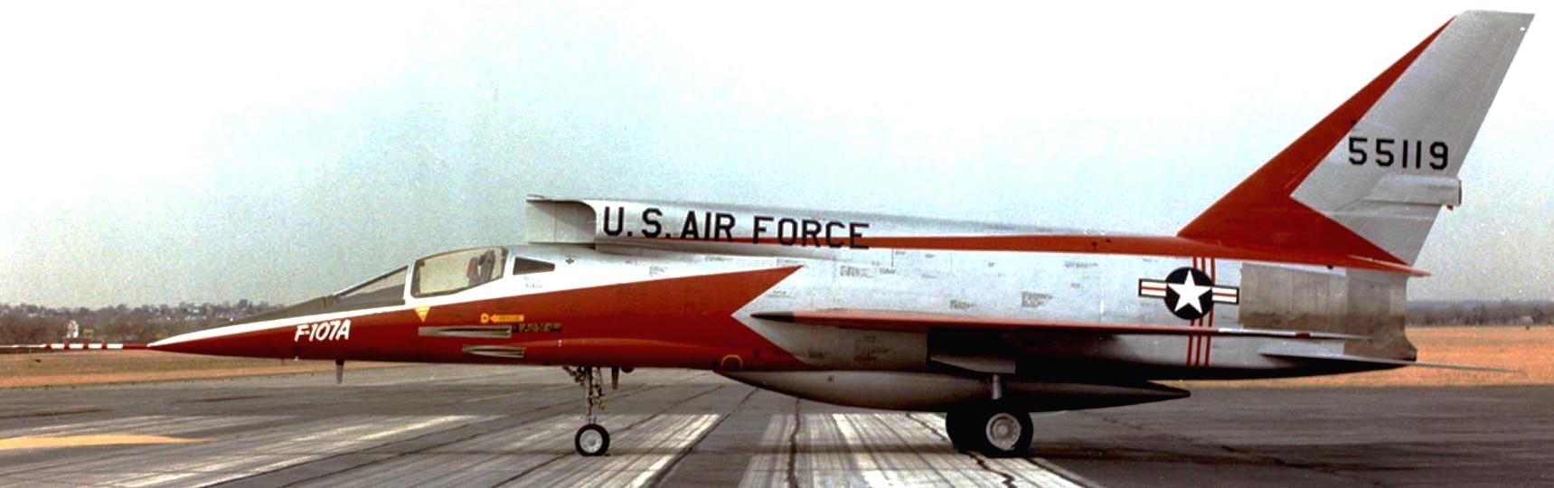 North American YF-107A (Serial No. 55-5119), C/N 212-2.  The F-107A was a mid-1950s development of the successful F-100 Super Sabre . Special features of the F-107A included an engine air intake above the cockpit, an all-moving vertical fin, and a system (called a Variable Area Inlet Duct) that automatically controlled the amount of air fed to the jet engine.  The first of three prototype F-107As flew in September 1956, attaining Mach 1 (Mach 1 is the speed of sound).  A few months later, an F-107 flew at Mach 2 (twice the speed of sound).  The following year, after seriously considering the production of the F-107, the USAF instead chose to buy the F-105 Thunderchief.  The first and third F-107A prototypes were then leased to the NACA (National Advisory Committee for Aeronautics), predecessor to NASA (National Aeronautics and Space Administration), for high-speed flight research.  The F-107A on display in the NMUSAF is the second prototype, which was used for weapons testing with both conventional and atomic bombs.  It was flown to the museum when the program ended in 1957.