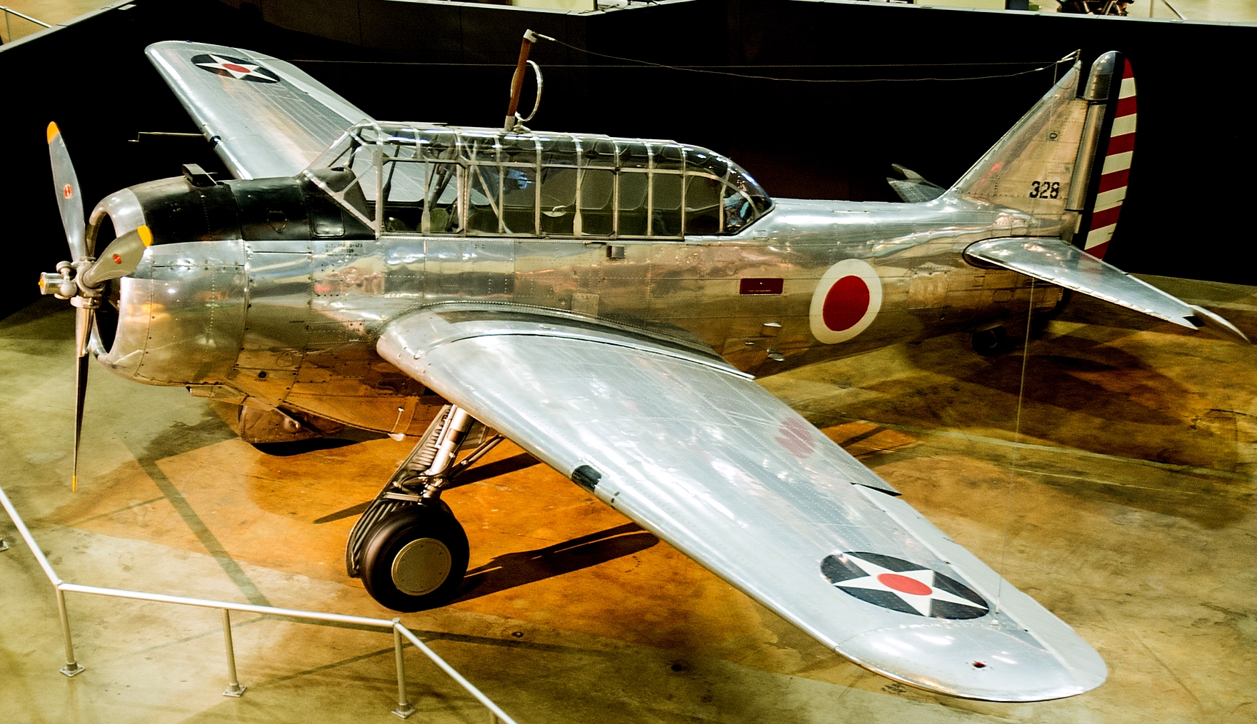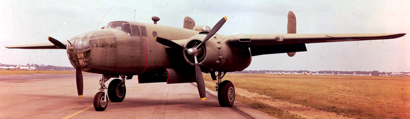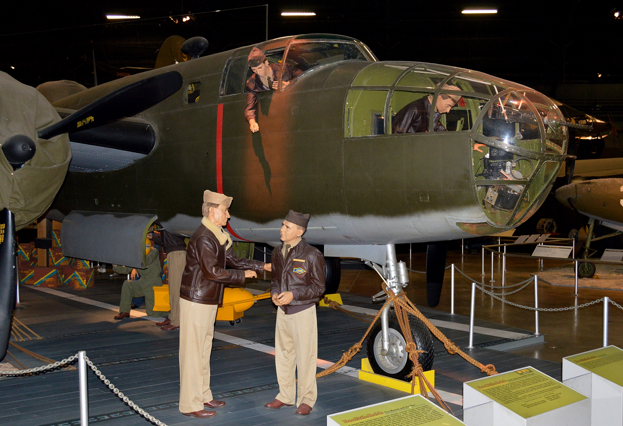 North American B-25B Mitchell (Serial No. 43-3374).  The airplane on display was built as an RB-25D.  It was removed from storage at Tucson, Arizona, and rebuilt by North American Aviation at Inglewood, California, to the configuration of the lead B-25B flown by Lt. Col. Doolittle on the Tokyo Raid.  It was then flown to the museum, arriving in April 1958.