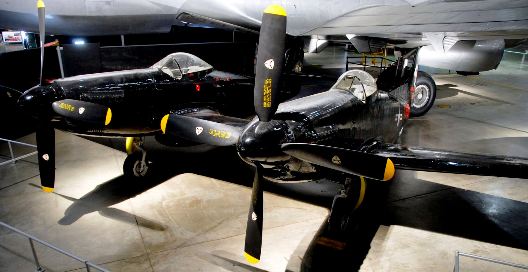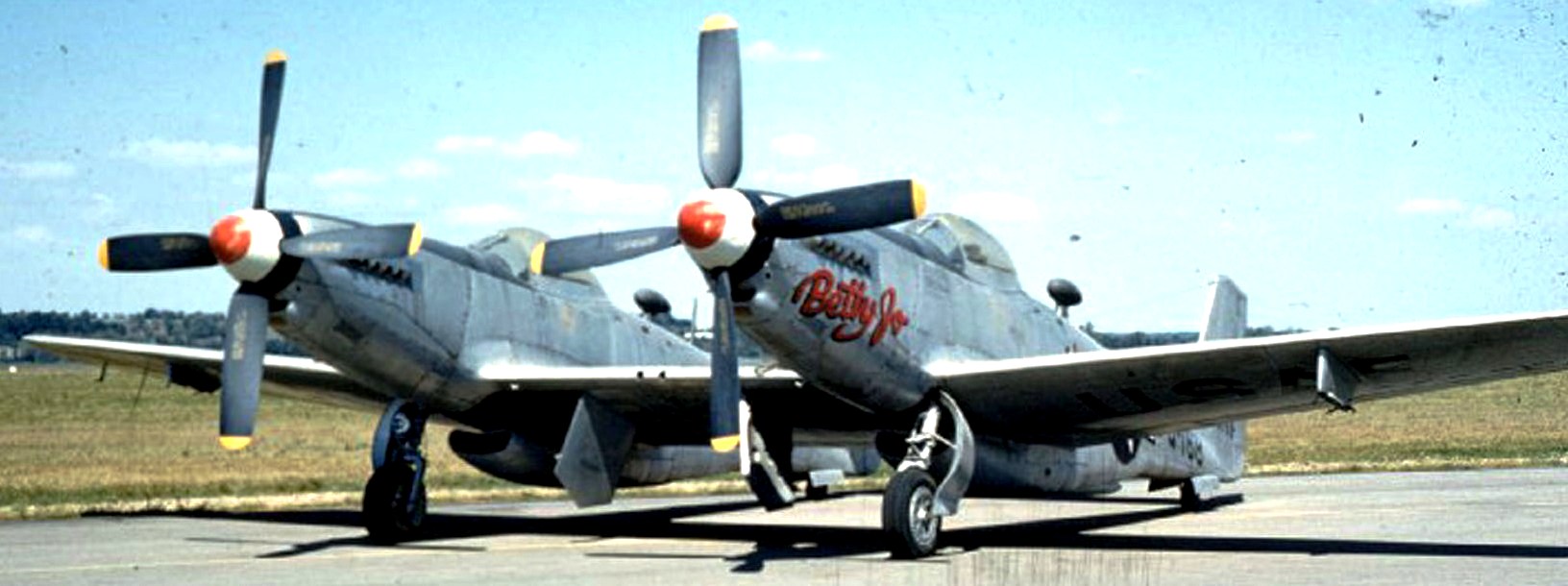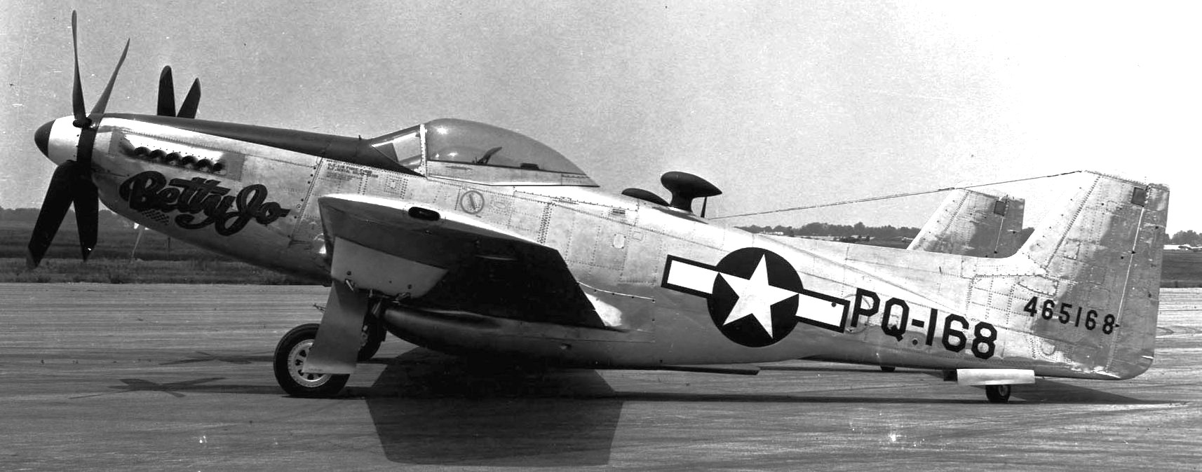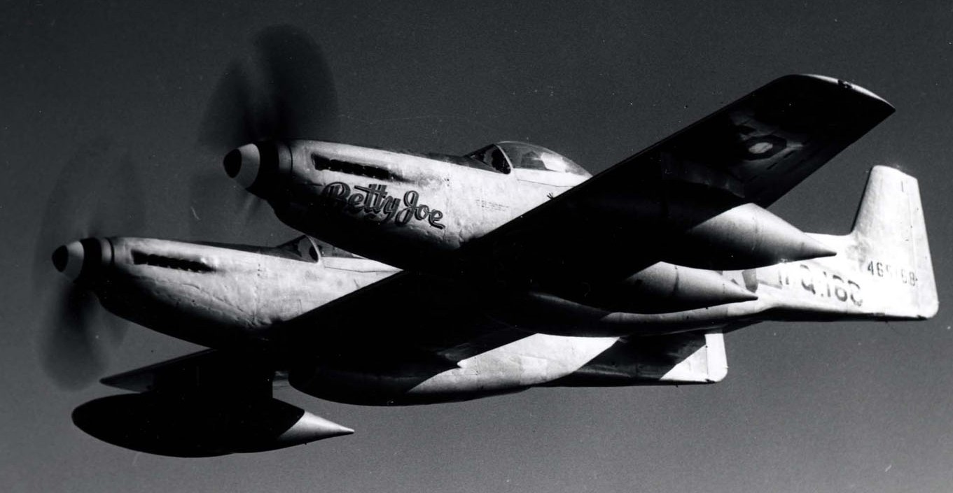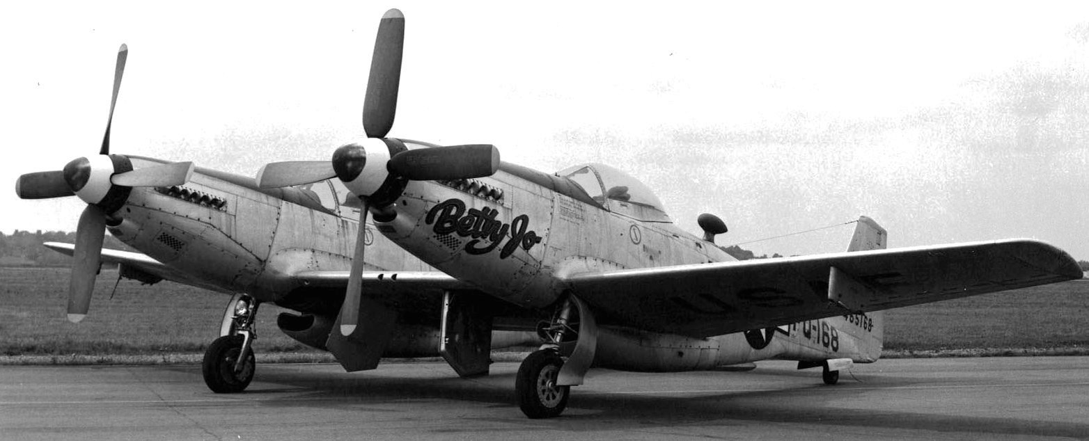 North American F-82B Twin Mustang (Serial No. 44-65168), C/N 123-43754.  â€œBetty Joe”.  The F-82 was the last propeller-driven fighter acquired in quantity by the USAF.  The Twin Mustang carried a pilot and co-pilot/navigator to reduce fatigue on long-range bomber escort missions.  It was produced in time to take part in the Second World War, but after the war, Air Defense Command flew radar-equipped F-82Gs as replacements for the P-61 night fighter.  During the Korean War, Japan-based F-82Gs were among the first USAF aircraft to operate over Korea.   On 27 June 1950, all-weather F-82Gs shot down the first three North Korean airplanes destroyed by U.S. forces.  Of a total of 273 F-82s produced, 20 were F-82Bs.  The F-82B on display, Betty-Jo, flew from Hawaii to New York on 27-28 Feb 1947, a distance of 5,051 miles, the longest non-stop flight ever made by a propeller-driven fighter.  Betty-Jo came to the NMUSAF in 1957.