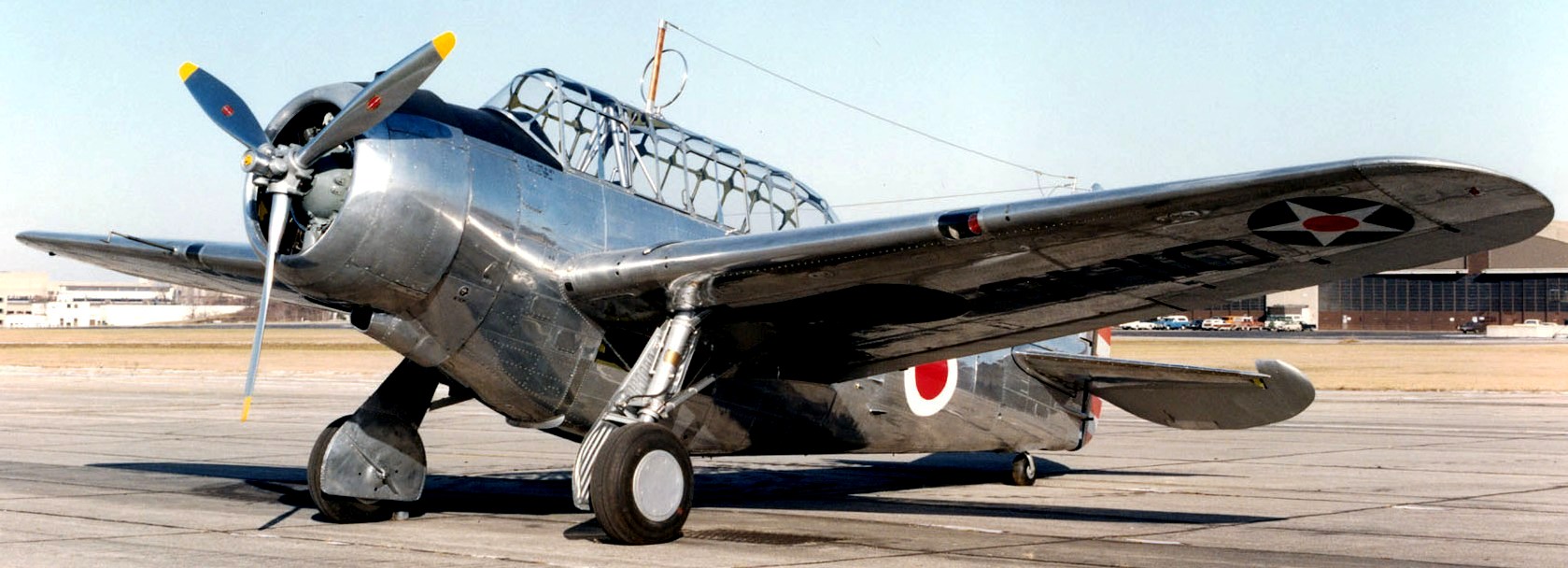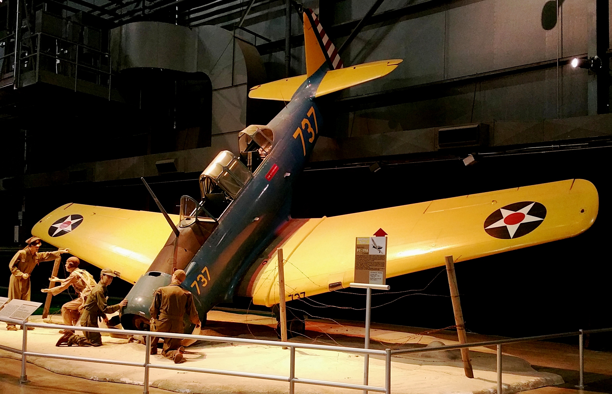 North American BT-14 (Serial No. 737).  Ex-RCAF North American NA-64 Yale painted to represent a USAAC BT-14, in a diorama.  Very similar to the BT-14, this North American NA-64 is one of a group of aircraft originally built for the French. When Germany defeated France in 1940, undelivered NA-64s were diverted to the Royal Canadian Air Force where they served as Yale I flight and radio operator trainers.  In 1974 the aircraft on display was extensively restored, after which it flew in air shows and conducted aerial photography.  In 1978 Challenge Publications Inc. (Air Classics, Air Combat, Air Progress), Mr. Edwin Schnepf, president, donated it to the National Museum of the United States Air Force.