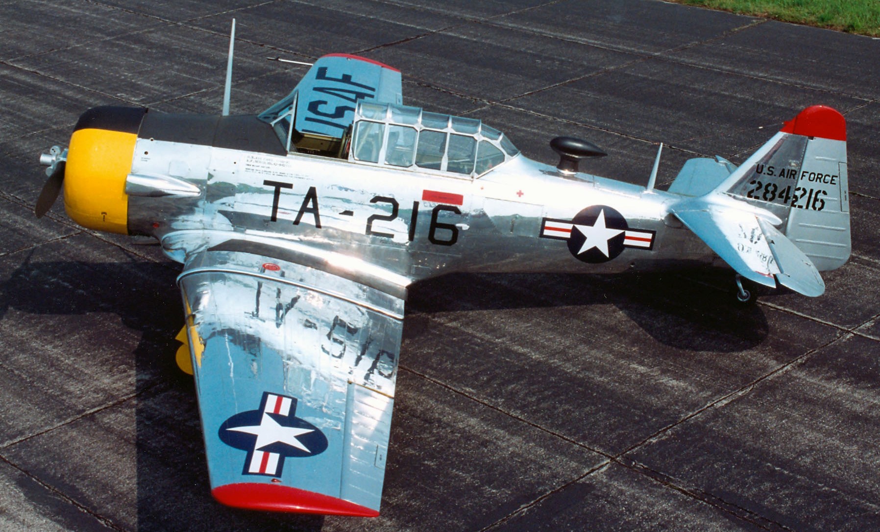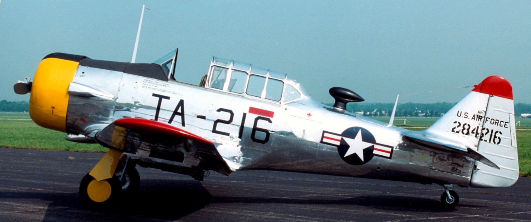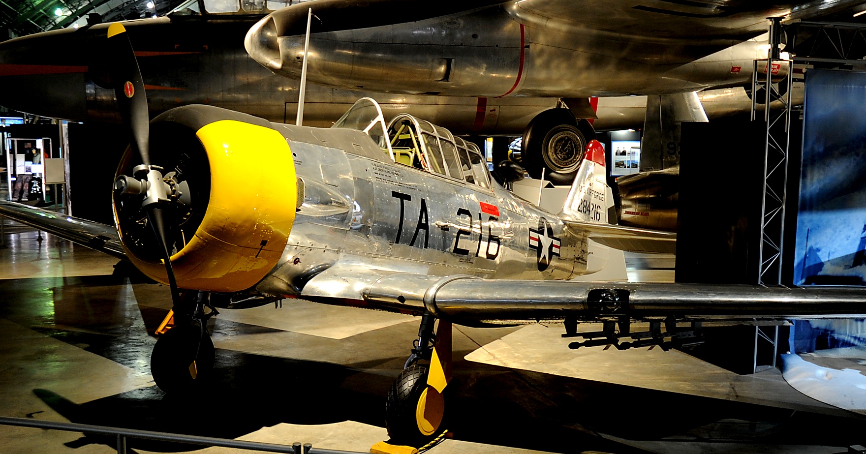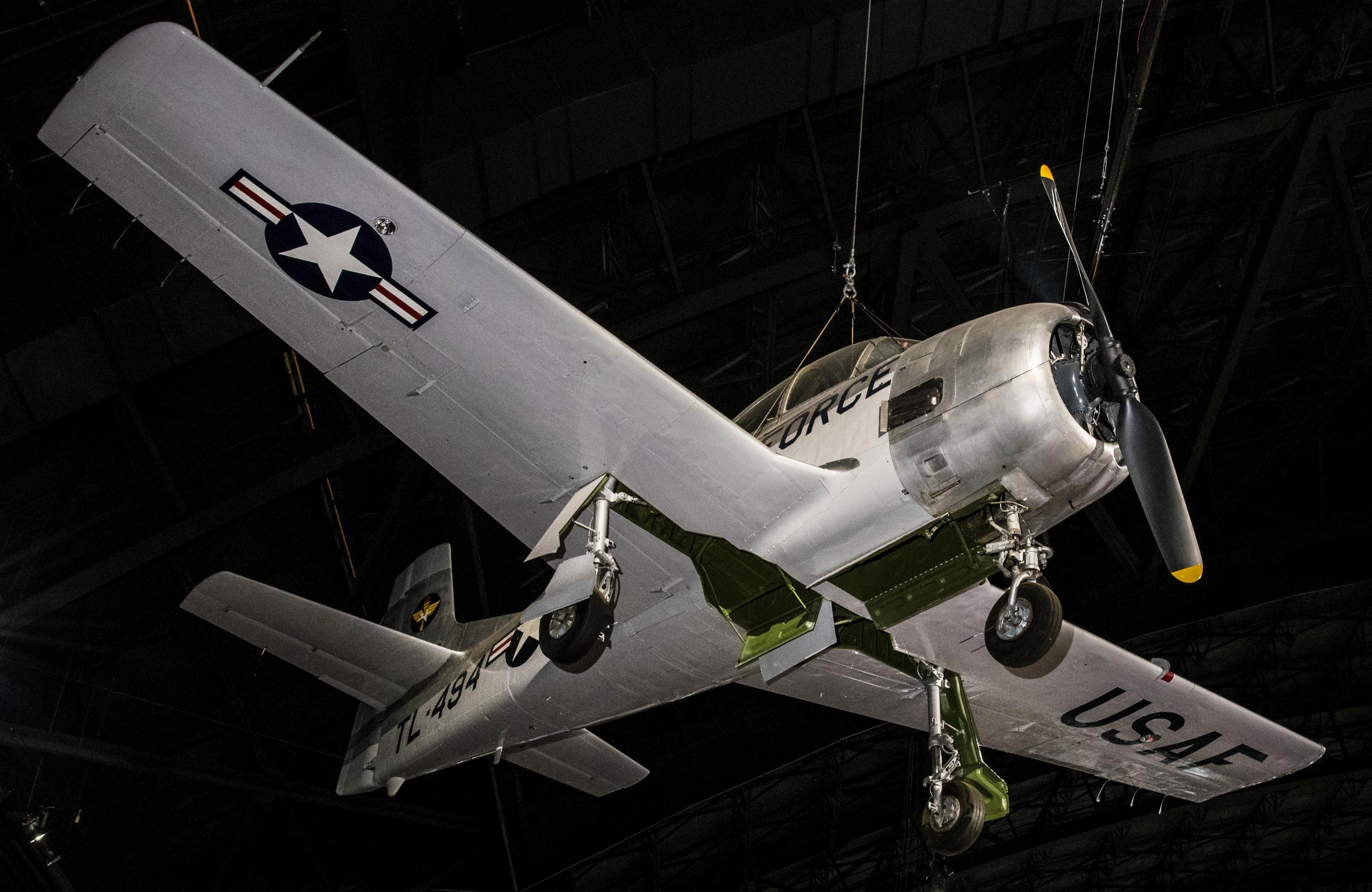 North American T-6D Mosquito (Serial No. 42-84216), TA-216, C/N 88-15997.  The T-6D on display in the NMUSAF flew as an early Mosquito with the 6147th Tactical Air Control Group during the first two years of the Korean War.  Ironically, it was converted to a mosquito spraying aircraft in 1952.  Two years later, the USAF transferred it to the fledgling Republic of Korea Air Force (ROKAF).  After retiring this aircraft, the ROKAF placed it on display outside for several years.  The National Museum of the United States Air Force acquired it in 1995, and after restoration it went on display in 2001.