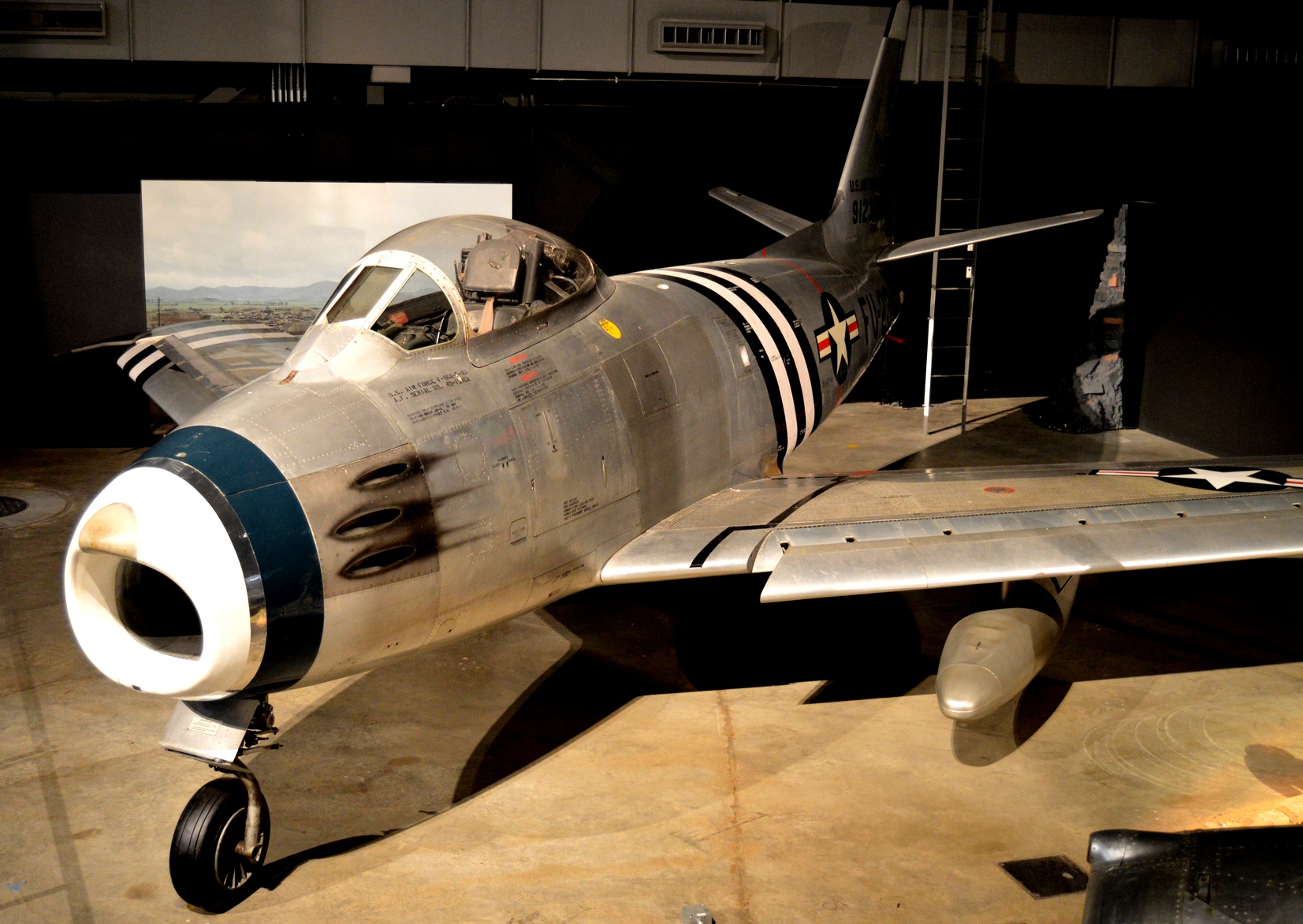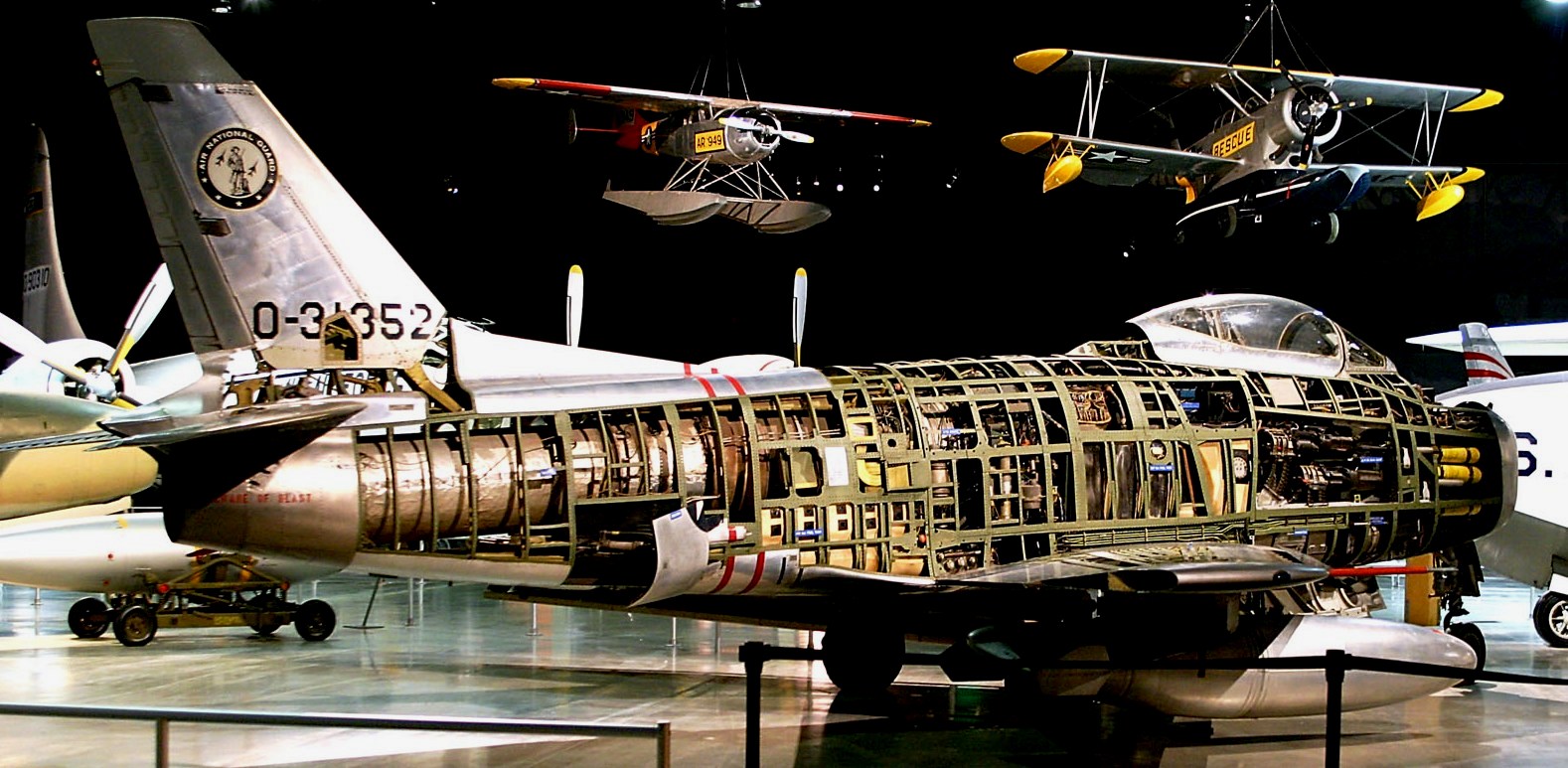 North American F-86H Sabre (Serial No. 53-1352), C/N 203-124.  Cutaway.  The NMUSAF obtained the F-86H on display from the New Jersey Air National Guard in November 1964.  It is exhibited with part of its stressed skin removed to show the internal structure and placement of equipment.