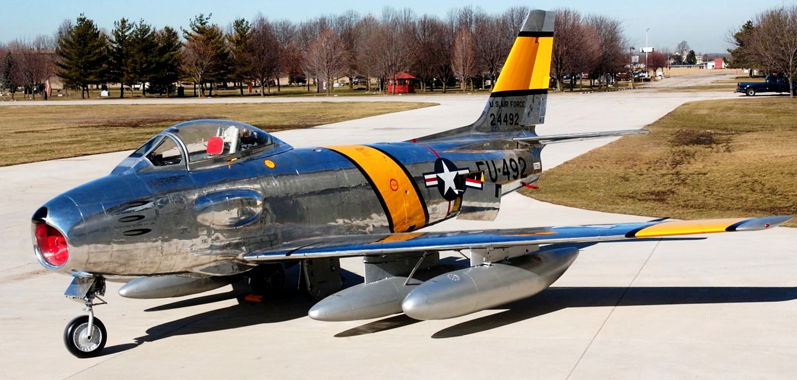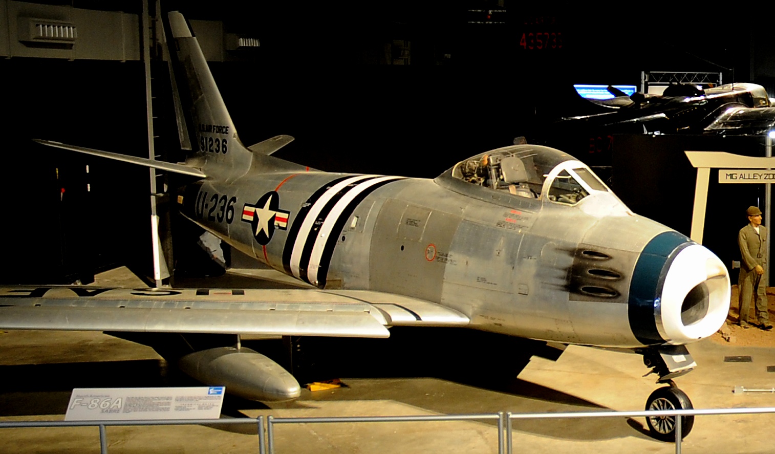 North American F-86A Sabre (Serial No. 49-1067), C/N 161-61, painted as (Serial No. 49-1236).  The F-86A on display in the NMUSAF was flown to the museum in 1961.  It is marked as the 4th Fighter Group F-86A flown by LCol Bruce Hinton on 17 Dec 1950, when he became the first F-86 pilot to shoot down a MiG.