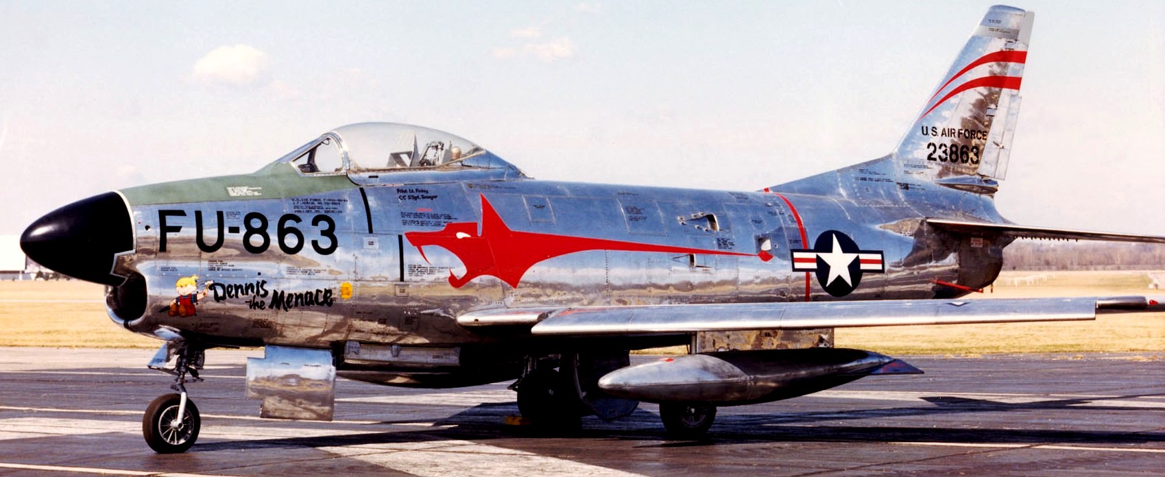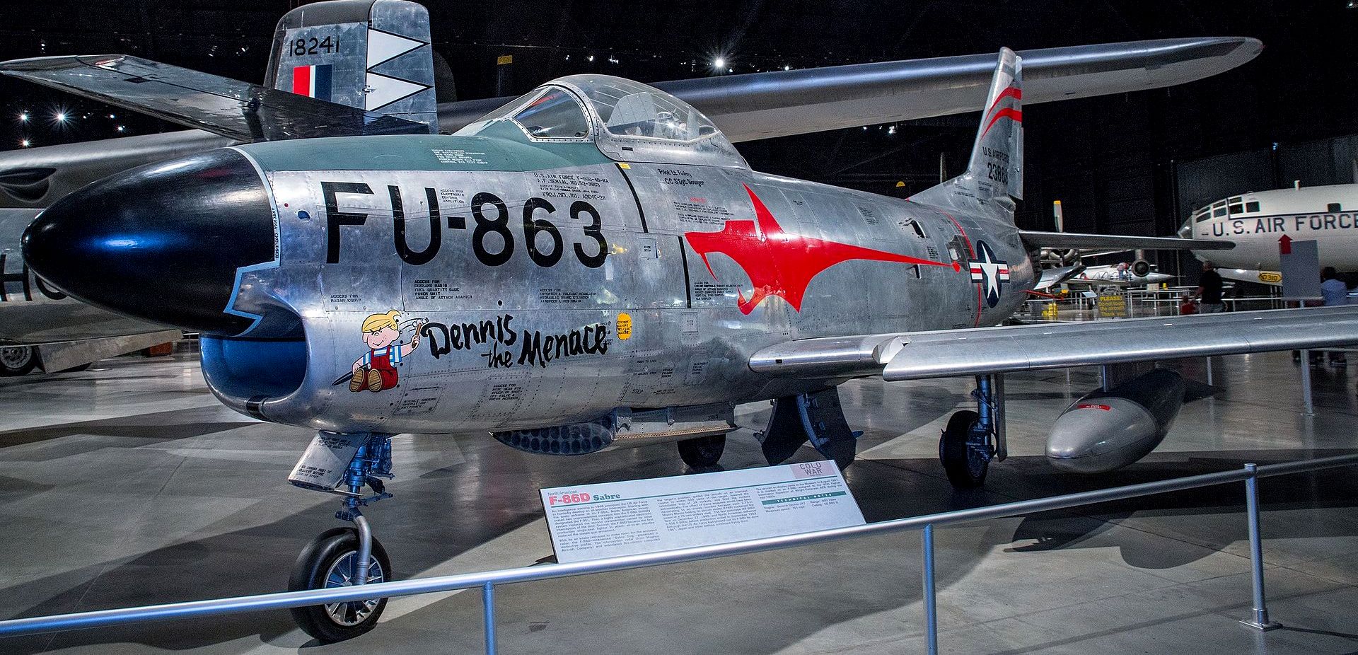 North American F-86D Sabre Dog (Serial No. 50-0477), FU-863, C/N 165-23, painted as (Serial No. 52-3863).  The aircraft on display in the NMUSAF came to the museum in August 1957.  It is marked as an F-86D assigned to the 97th Fighter Interceptor Squadron at Wright-Patterson Air Force Base, Ohio, during the mid-1950s.