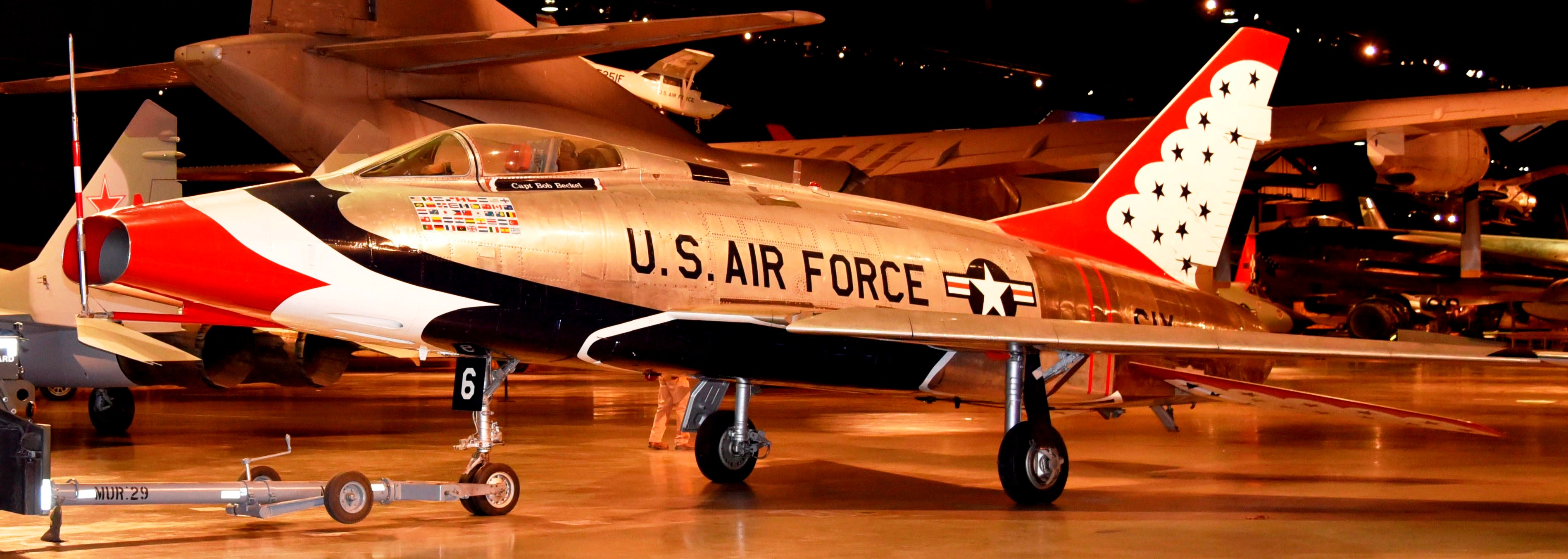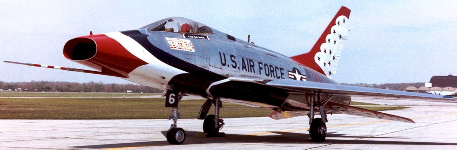 North American F-100D Super Sabre (Serial No. 55-3754), 6, C/N 223-436, Thunderbirds markings.  The aircraft on display in the NMUSAF was used by the Thunderbirds, the official USAF Flight Demonstration Team, from 1964 until 1968.  During that period, the team toured the Caribbean, Europe, Latin America and nearly every state in the United States.  This F-100D was retired from service with the 114th Tactical Fighter Group, South Dakota Air National Guard, in 1977.  It was restored by Thunderbird maintenance personnel at Nellis Air Force Base, Nevada, to its original appearance as a team aircraft.  It was flown to the museum by the Air National Guard, and the Thunderbirds presented the aircraft to the museum on 22 July 1977.