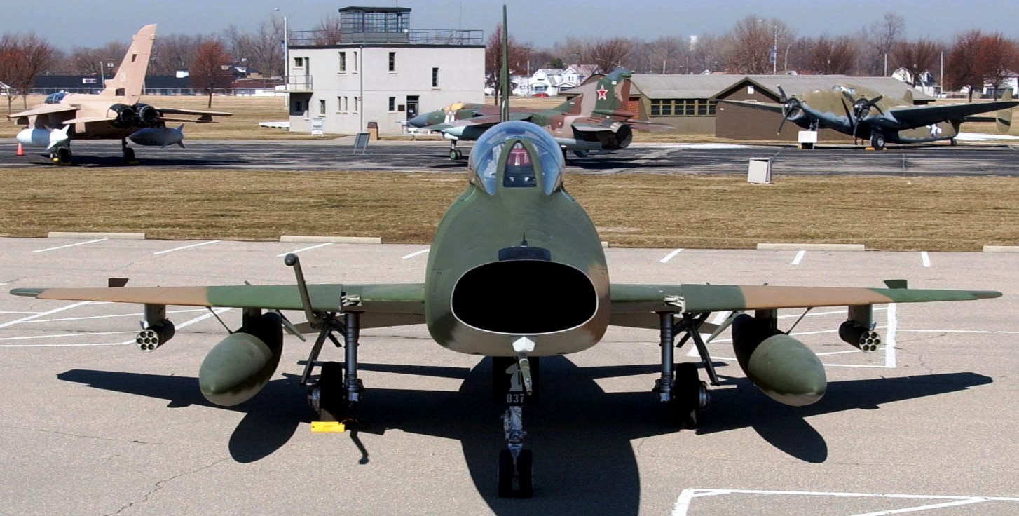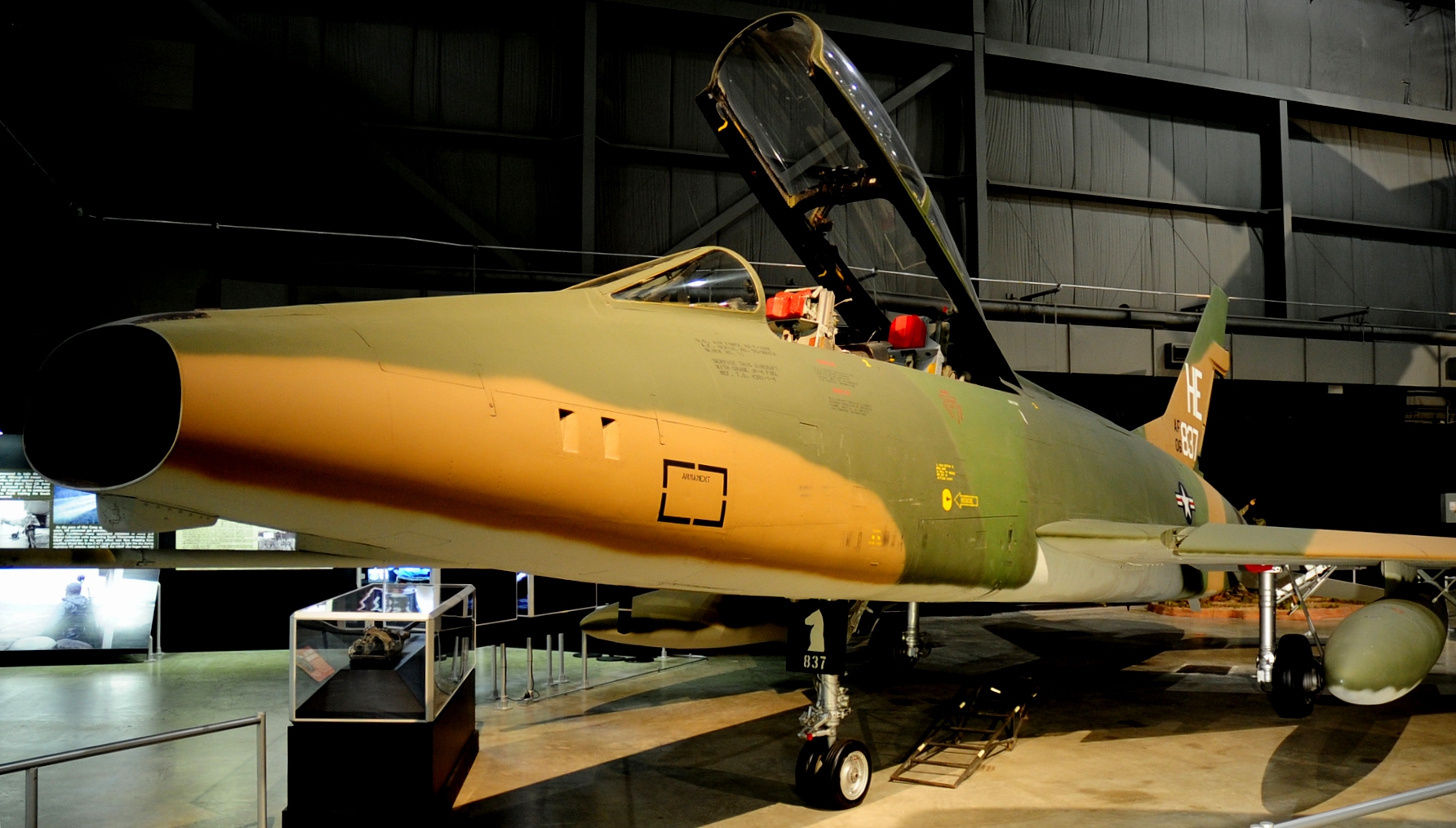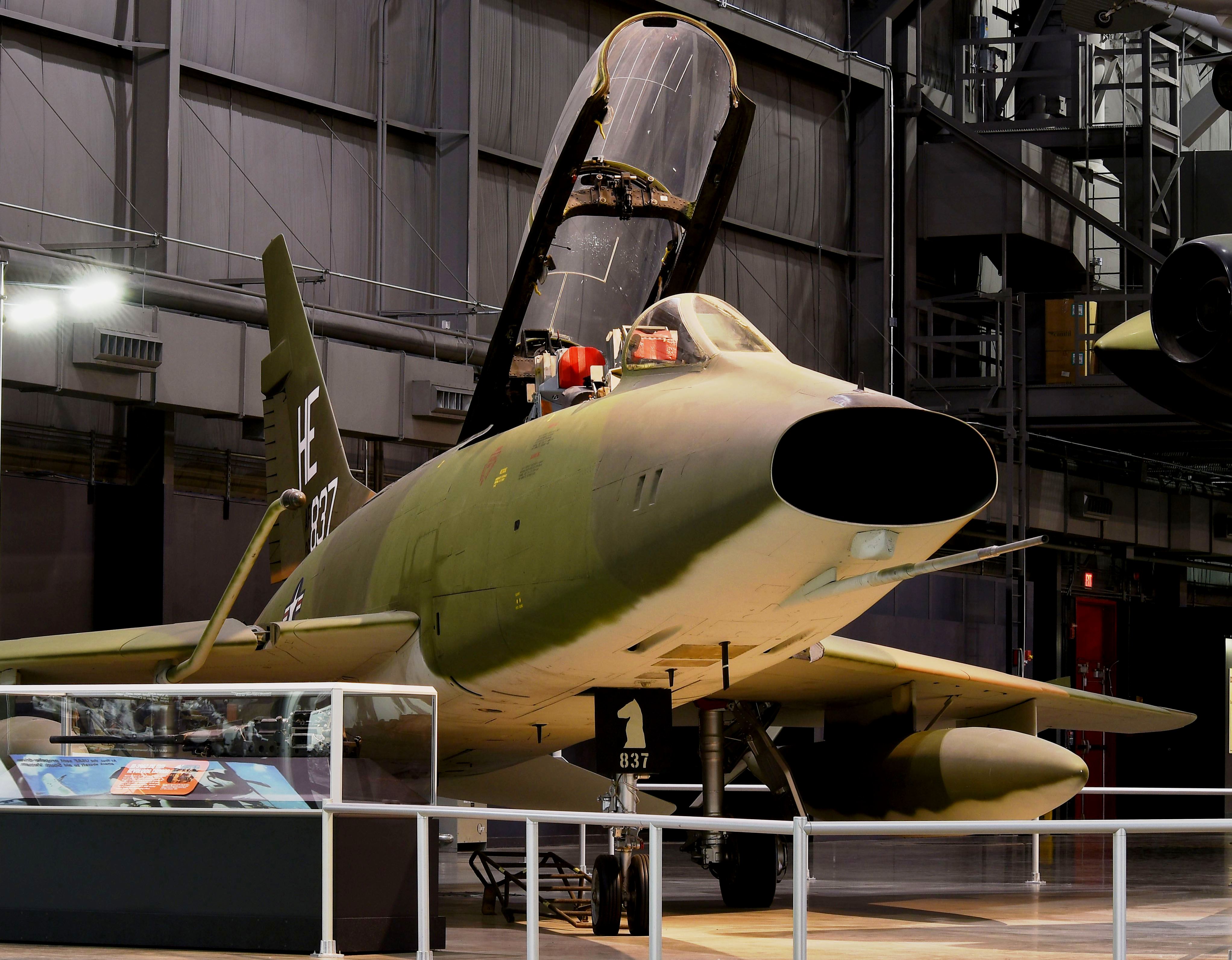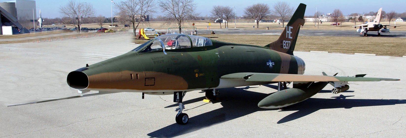 North American F-100F Super Sabre (Serial No. 56-3837), HE, C/N 243-113.  When F-100 units deployed to Southeast Asia, they included a mix of one- and two-seat F-100s, and both types participated in traditional bombing missions in support of ground forces.  As tactics developed, the two-seat F-100F became an important aircraft for two new missions, surface to air missile (SAM) suppression, known as “Iron Hand,” and high-speed forward air control (FAC), known as “Misty FAC.”  The aircraft on display in the NMUSAF was a Misty FAC aircraft assigned to the 37th Tactical Fighter Wing at Phu Cat Air Base, Vietnam.  It was flown in combat by several notable USAF figures, including Gen Merrill McPeak and Gen Ronald Fogleman (former USAF chiefs of staff), and Col Richard Rutan (the chief pilot of the first around-the-world unrefueled flight).  It is painted as it appeared in March 1968, and went on display in 2003.