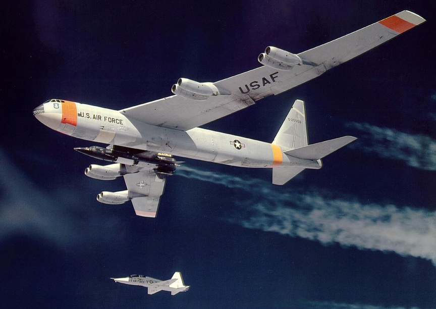 X-15 attached to its B-52 mother ship with a T-38 Talon escort.