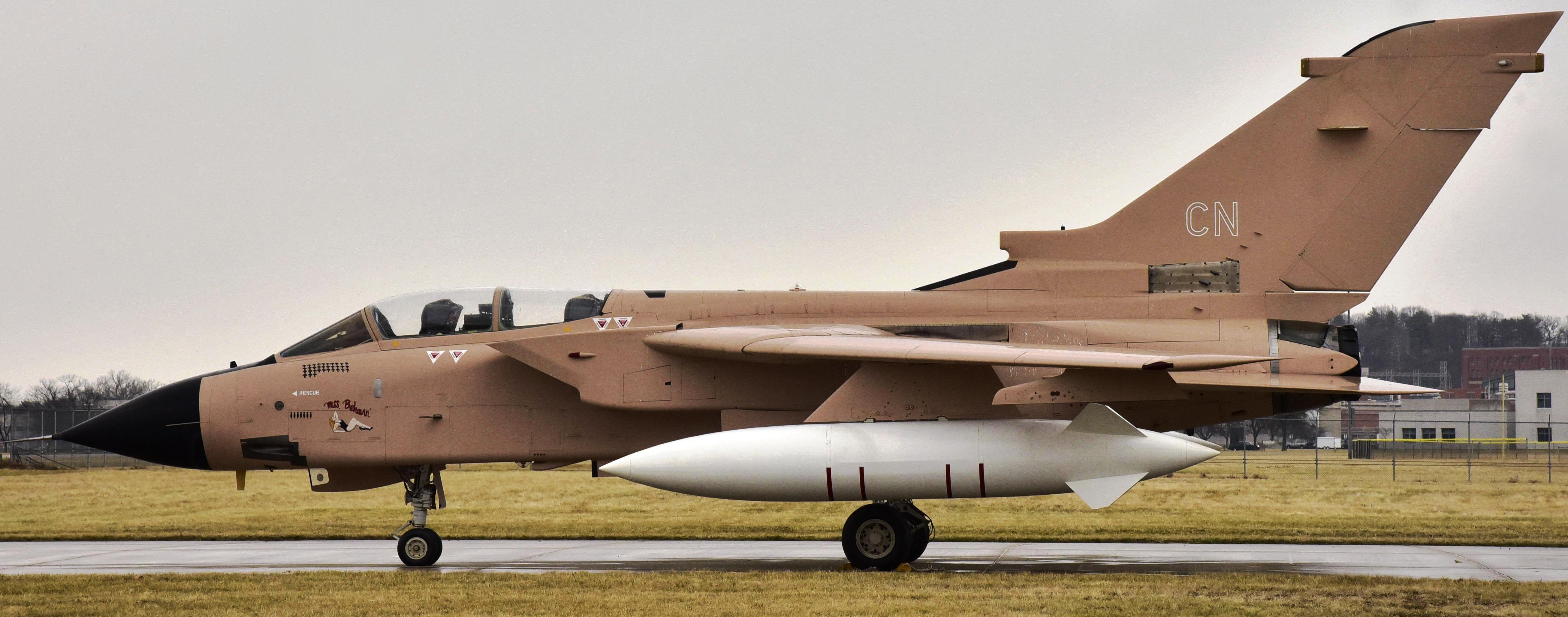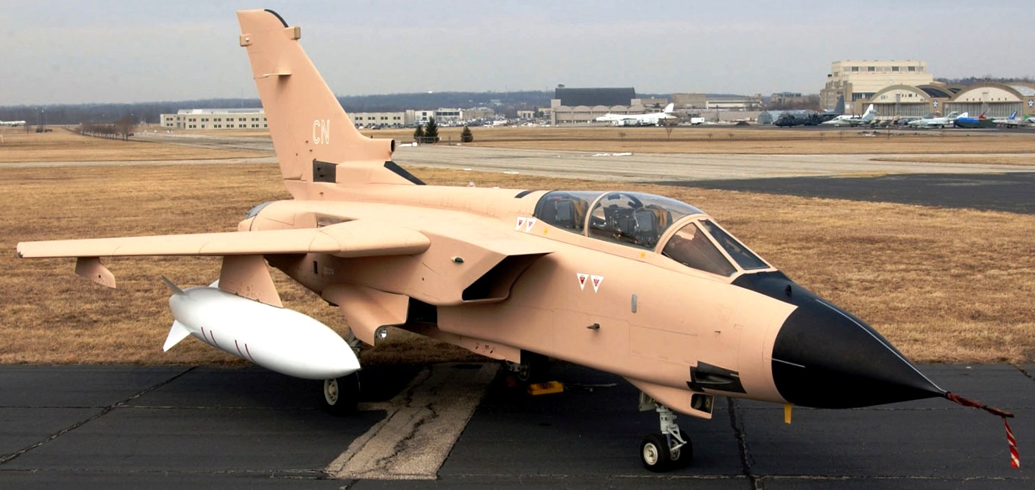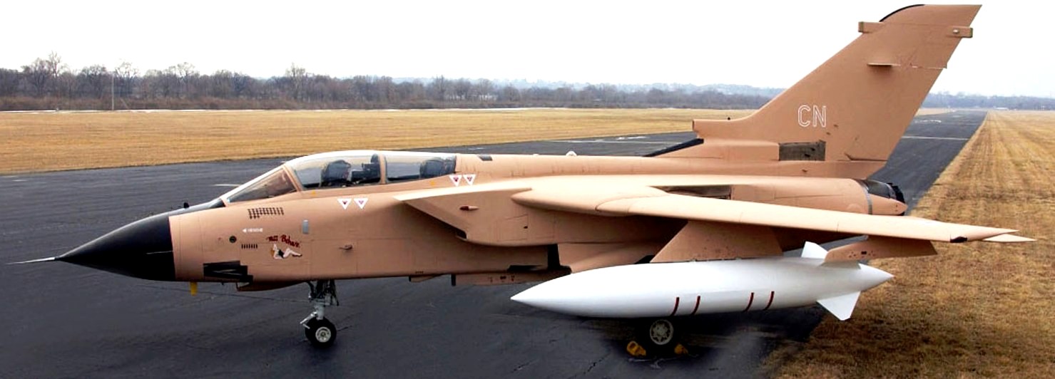 Panavia Tornado GR1 (Serial No. ZA374), CN, C/N 178/BS056/3088. During the 1991 Gulf War, military planners made the elimination of Iraq’s air defenses a top priority. At the start of Operation Desert Storm (called Operation Granby by the British), Royal Air Force (RAF) Tornado GR1 aircraft attacked Iraqi air bases at low-level with Hunting JP233 anti-runway weapons and suppressed enemy air defenses. Afterward, GR1 aircrews flew medium-level missions using 1,000-pound bombs. At the end of the conflict, they used Paveway II laser-guided bombs against other strategic targets. Flying more than 1,500 operational sorties, mostly at night, RAF GR1 aircrews played an important role in forcing the Iraqis out of Kuwait, and the RAF lost six GR1s in combat. Tornados could carry a wide range of weapons, including the Air-Launched Anti-Radar Missile (ALARM) for the Suppression of Enemy Air Defenses (SEAD) and the Paveway II and III laser-guided bombs (LGB). The RAF also modified a number of Tornados to carry the Sea Eagle anti-shipping missile. This variant became the GR1B. The aircraft on display in the NMUSAF flew with the RAF’s 17 Squadron from Dhahran, Saudi Arabia, where it sported desert camouflage and the name Miss Behavin’. The aircraft is currently painted as an aircraft assigned to 617 Squadron. It came to the museum in October 2002 as a donation from the RAF.