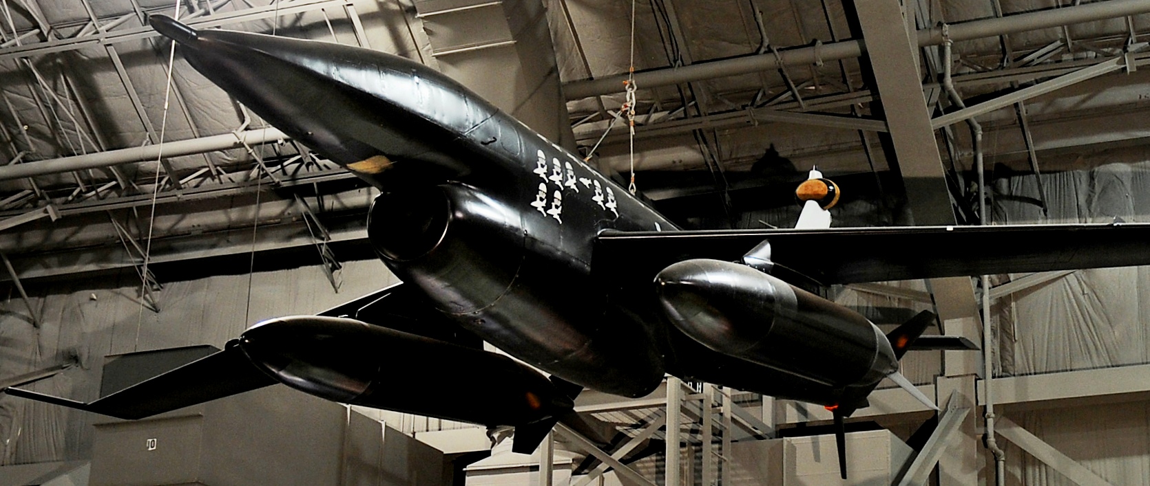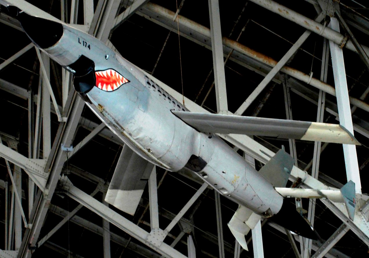 Teledyne-Ryan AQM-34L Firebee (Serial No. L-174). Suspended from the ceiling. The AQM-34L remotely piloted aircraft flew low-level photo-reconnaissance missions over North Vietnam. The AQM-34 series was developed from the unmanned BQM-34A target aircraft. The AQM-34L on display flew more than 30 missions over North Vietnam. On 6 Aug 1972, it was damaged by an SA-2 surface-to-air missile (SAM) and landed by parachute in the South China Sea off the North Vietnamese coas t. Although recovered by a U.S. Navy ship, it was further damaged by salt water beyond economical repair. This AQM-34L’s nickname, M.R. Ling, was a pun on the last name of LCol. Edwin Emerling, who was involved with its early combat missions.
