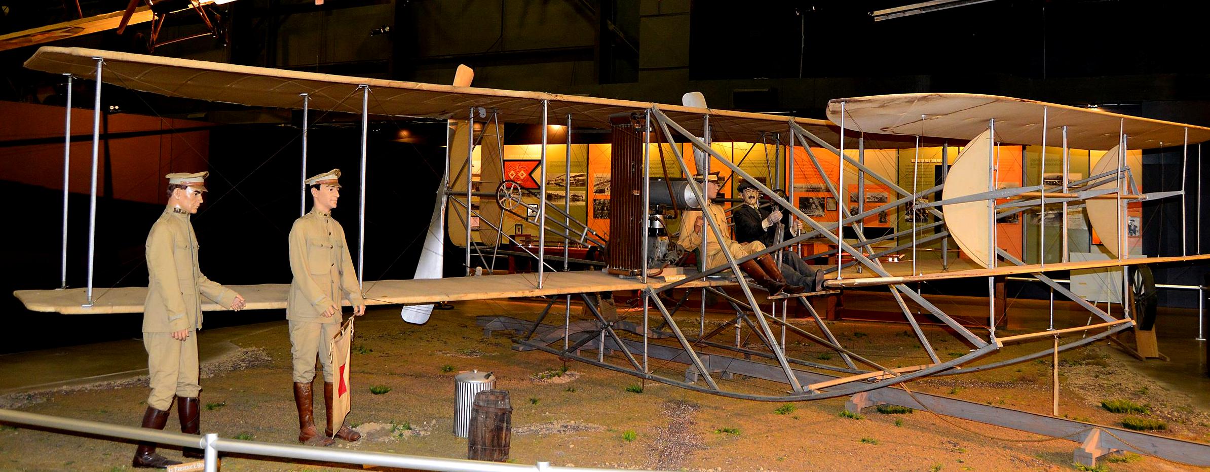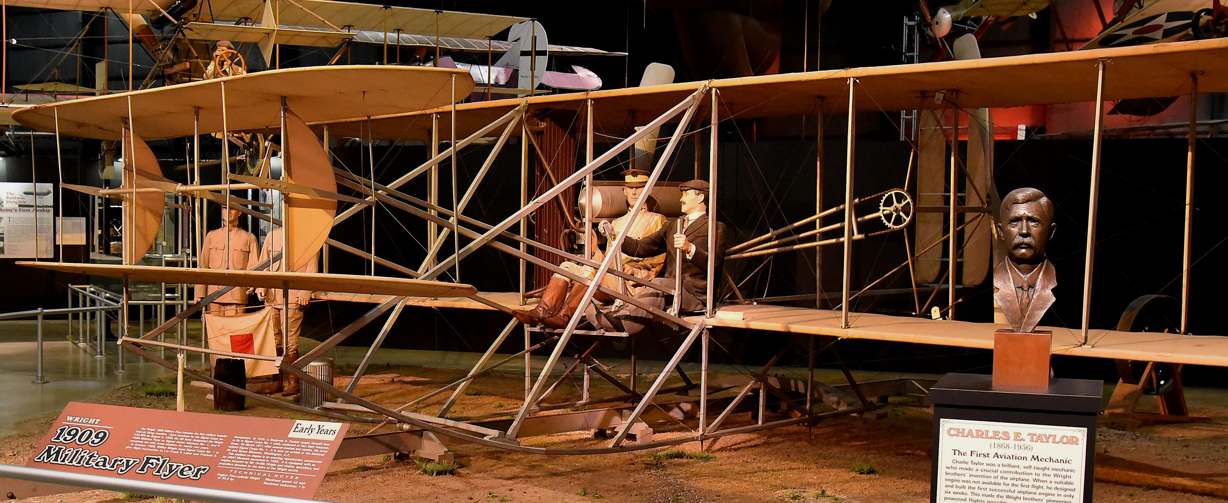 Wright 1909 Military Flyer. The aircraft on display is an exacting reproduction constructed by museum personnel in 1955. It is equipped with an engine donated by Orville Wright and chains, sprockets and propellers donated by the heirs of the Wright estate.