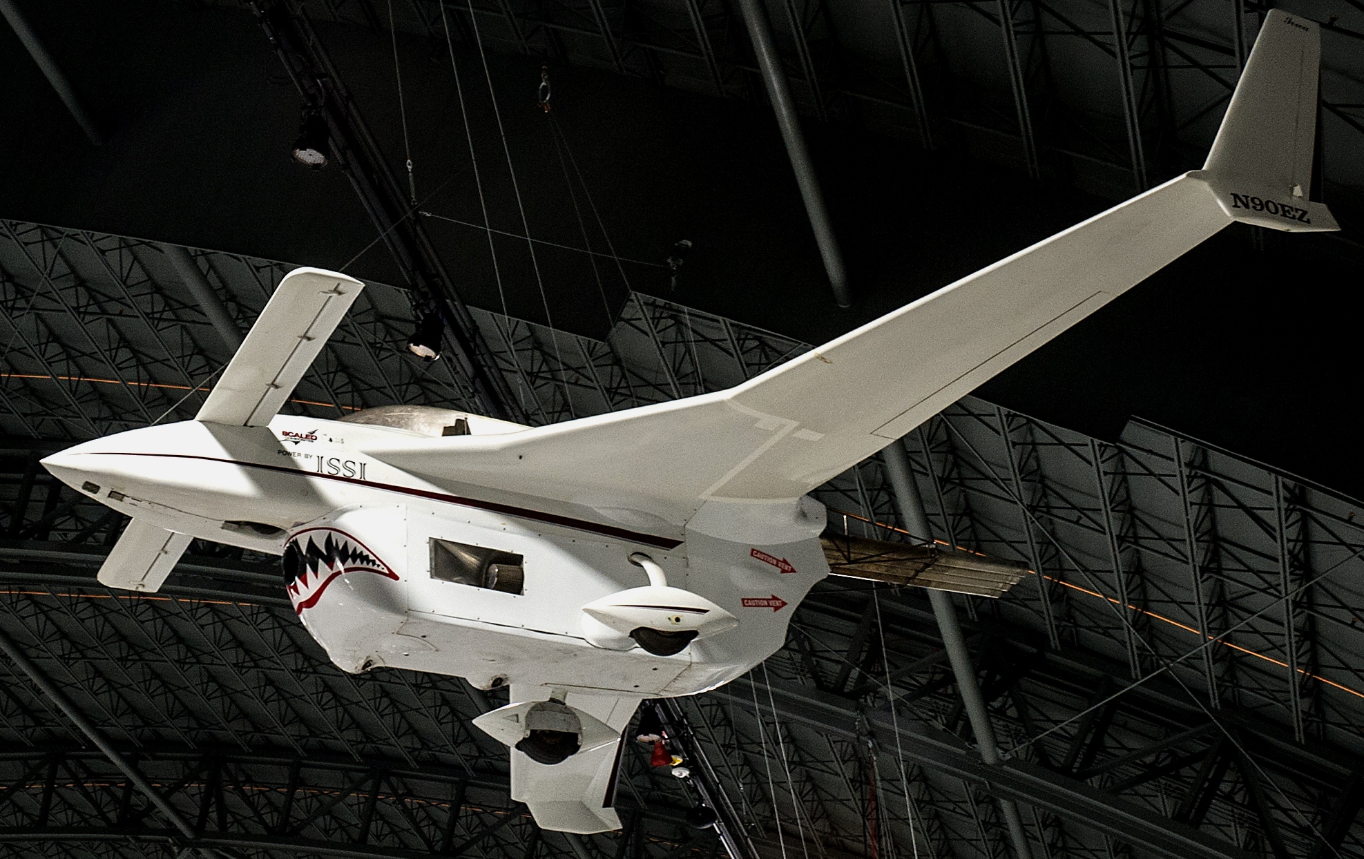 Scaled Composites Long-EZ Borelis. In January 2008, this modified Scaled Composites Long-EZ completed the first manned flight of an aircraft powered by a pulsed detonation engine (PDE). The flight was the result of a five-year cooperative effort between the Air Force Research Laboratory (AFRL) and Innovative Scientific Solutions Incorporated (ISSI). The project used the popular homebuilt Long-EZ designed by Burt Rutan as a platform. Engines normally burn fuel and air at subsonic speeds to provide propulsion. Pulsed detonation engines detonate the fuel-air mixture to produce repeated, controlled explosions. The resulting supersonic shockwaves create thrust. In this PDE, the thrust is expelled through four tubes out the back of the aircraft. Remarkably, the PDE engine in this aircraft was made in part from off-the-shelf automotive parts. Pulsed detonation engines are much less complicated and promise to be less expensive to operate than jet engines. Moreover, they offer a fuel savings of between 5-20 percent over traditional turbojet engines. Although still in development, PDEs may become more common as the technology matures. This aircraft was delivered to the NMUSAF in 2008.