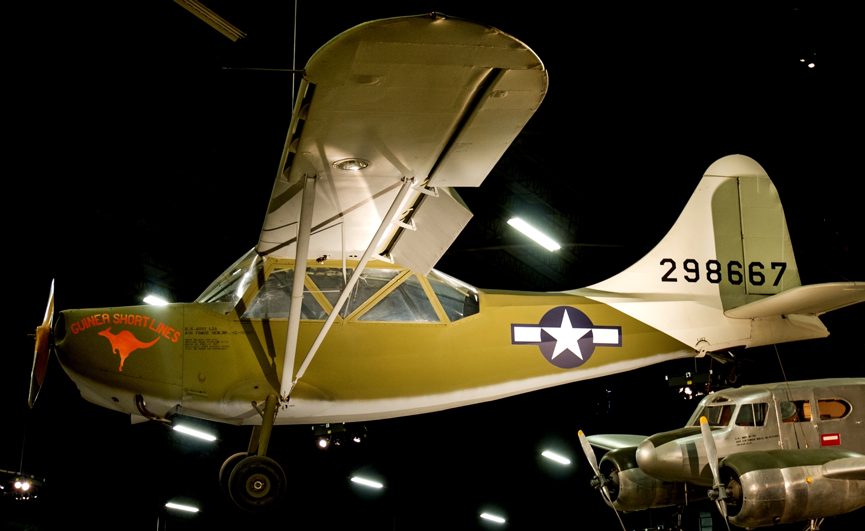 Stinson L-5 Sentinel (Serial No. 42-98667), painted as an L-5 of the 25th Liaison Sq. serving in New Guinea in 1944. The L-5 on display in the NMUSAF was donated by Dr. Robert R. Kundel of Rice Lake, Wisconsin. It was restored by the “Oriole Club” 133rd Tactical Airlift Wing, Minnesota Air National Guard. Delivered to the museum in 1977, it is marked as an L-5 of the 25th Liaison Squadron serving in New Guinea in 1944.