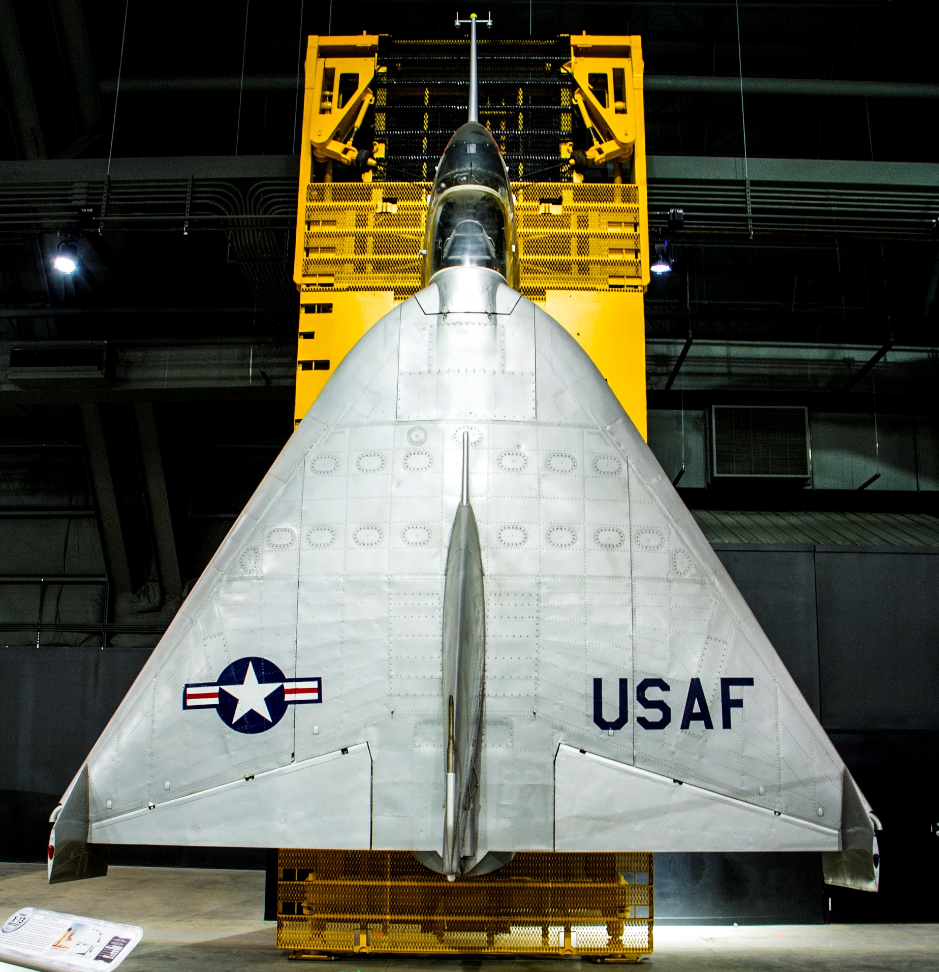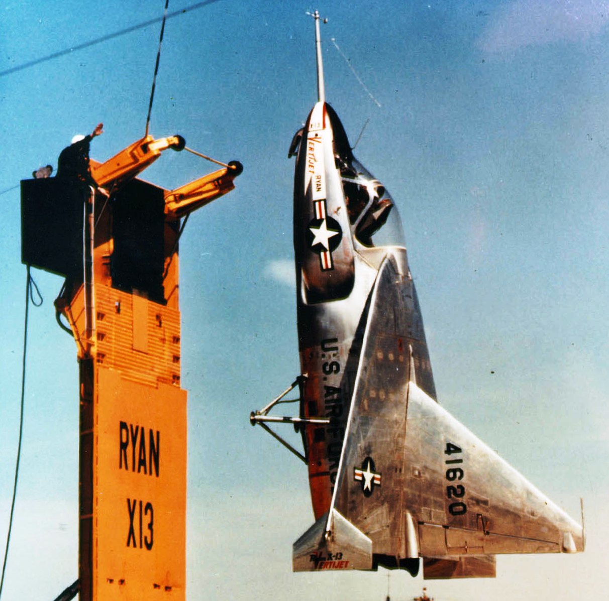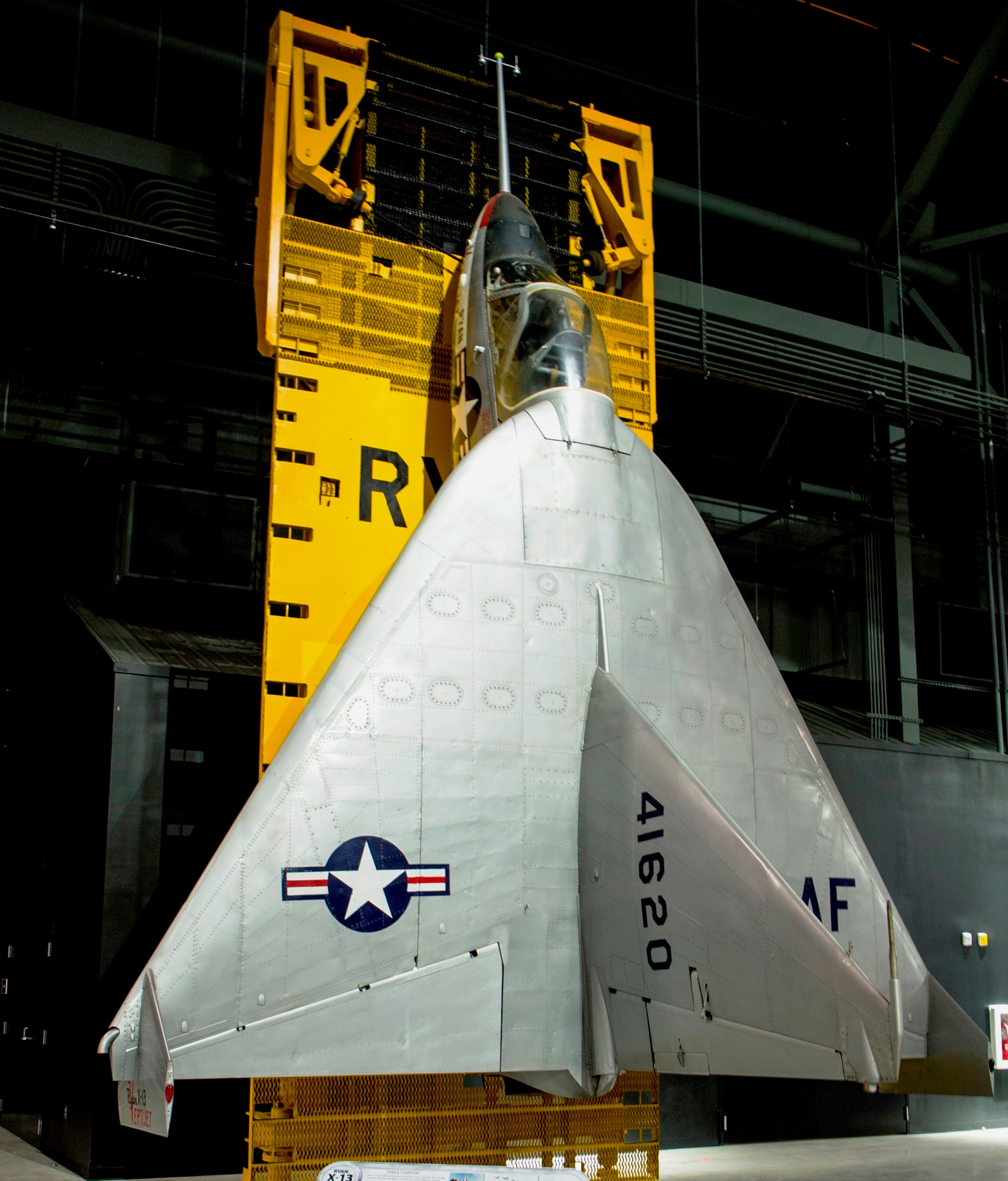 Ryan X-13A Vertijet (Serial No. 54-1620).  Suspended from its launch and recovery tower.  The X-13 was built to prove the concept that a jet could take off vertically, transition to horizontal flight, and return to vertical flight for landing.  Equipped with a temporary tricycle landing gear, the first of two X-13s flew conventionally in December 1955 to test its overall aerodynamic characteristics.  It was then fitted with a temporary “tail sitting” rig, and in May 1956 this X-13 flew vertically to test its hovering qualities.  The second X-13, on display in the NMUSAF, made history in April 1957, when it completed the first full-cycle flight at Edwards Air Force Base, California.  It took off vertically from its mobile trailer, rose into the air, nosed over into a level attitude and flew for several minutes.  Then, it reversed the procedure to vertical flight and slowly descended to its trailer for a safe landing.  This X-13 also made demonstration flights in the Washington, D.C., area later that year.  Even though the X-13 successfully proved the original concept, its design had limited operational potential, and a lack of funding shut down the program in 1958.  The X-13 was transferred to the museum in 1959.