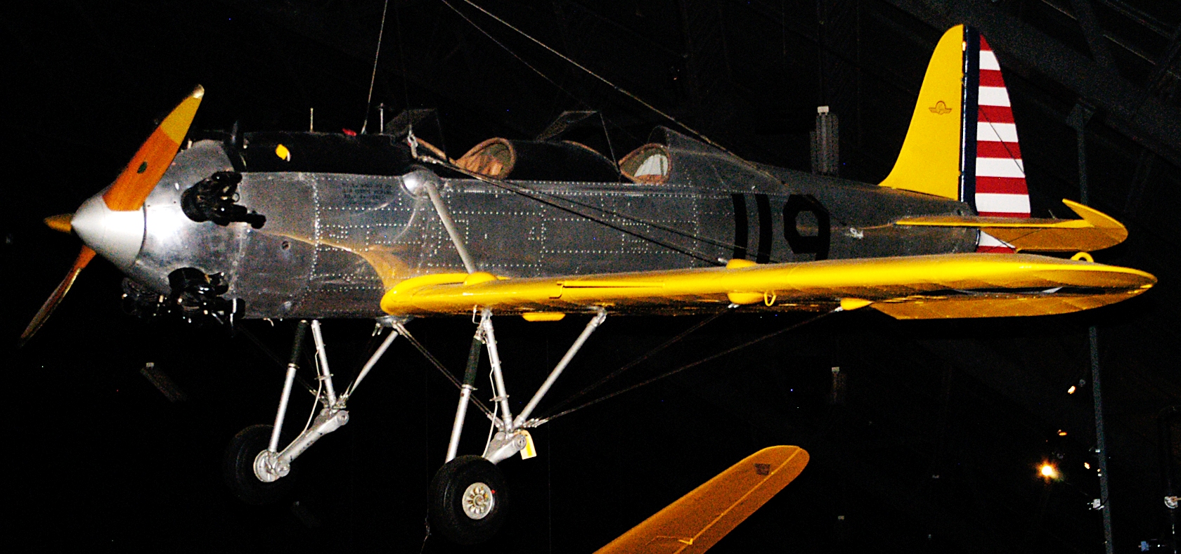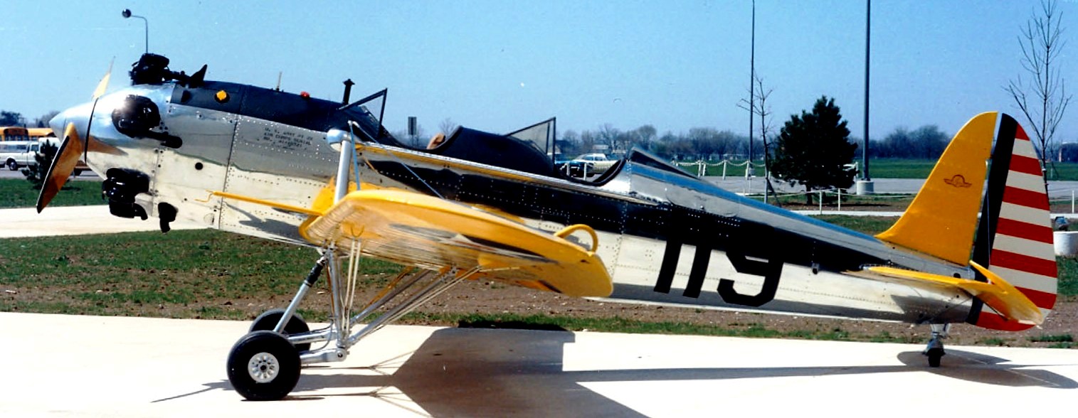 Ryan YPT-16 STA (Serial No. NC 18922), C/N 312.  Suspended from the ceiling.  Acquired by the museum in 1986, the aircraft on display is a Ryan STA withdrawn from the YPT-16 production run.  Never owned by the Air Corps, it flew under civilian registration.  However, the logbook shows that the aircraft participated in demonstrations to Air Corps officials at Wright Field, Ohio, in July 1939.