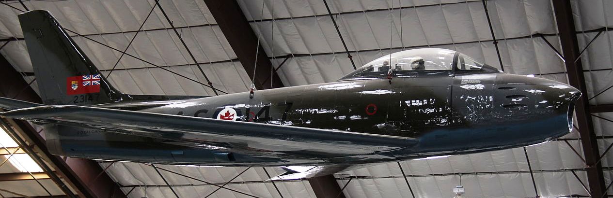 Canadair CL-13A Sabre Mk. IV (Serial No. 23147), wearing RCAF colours, suspended from the museum ceiling.