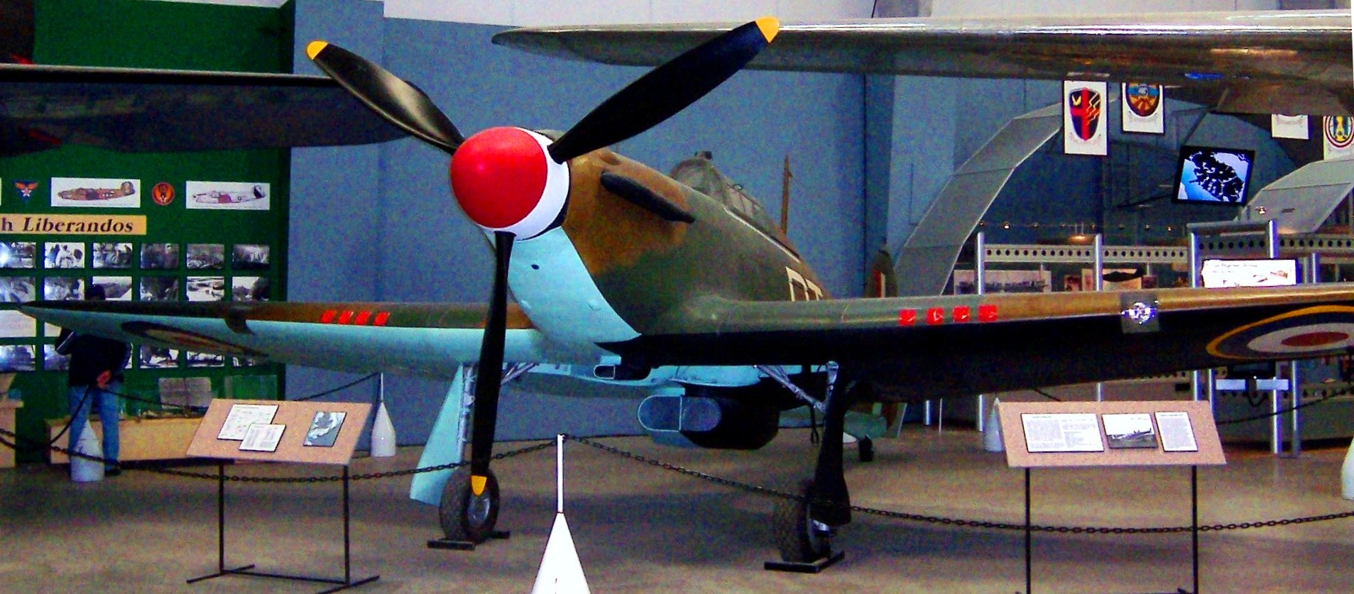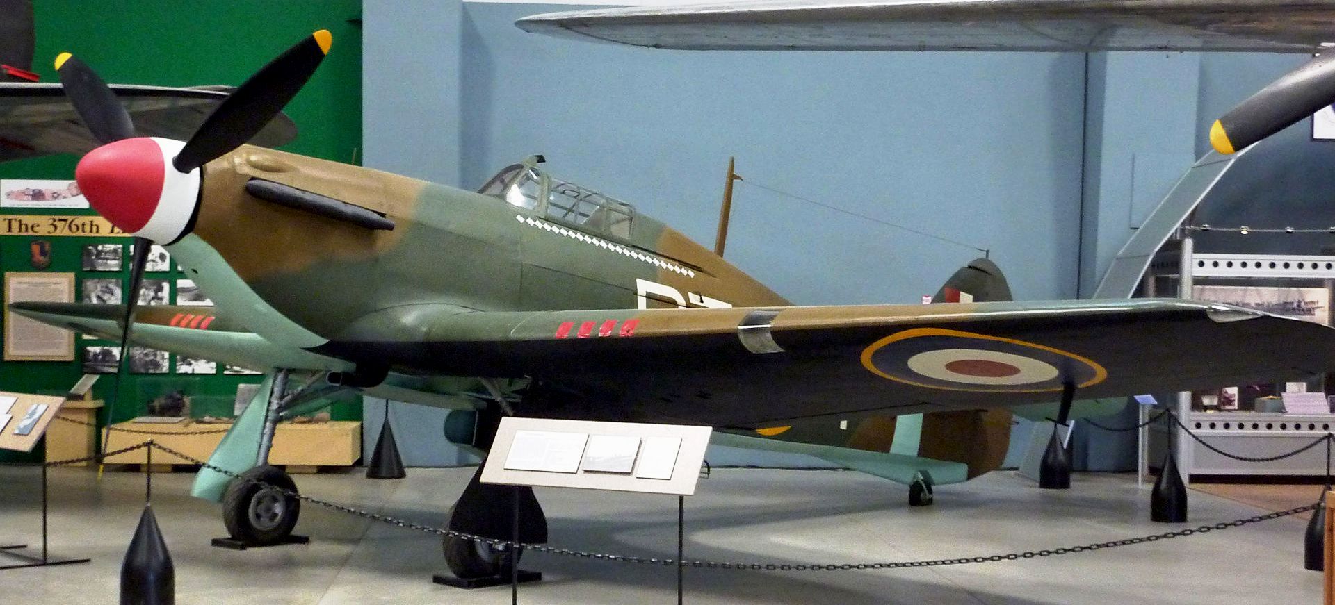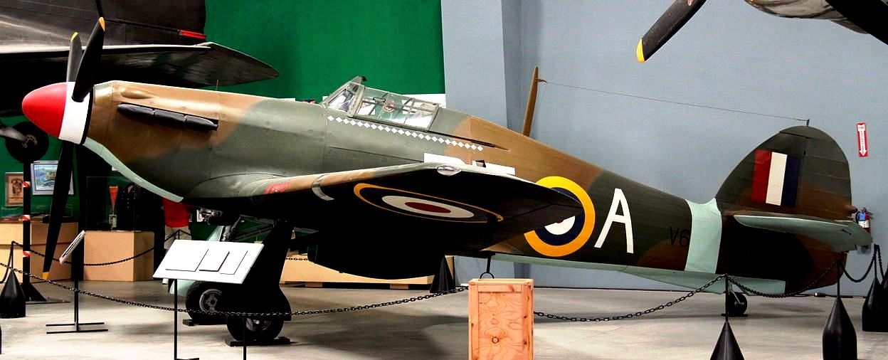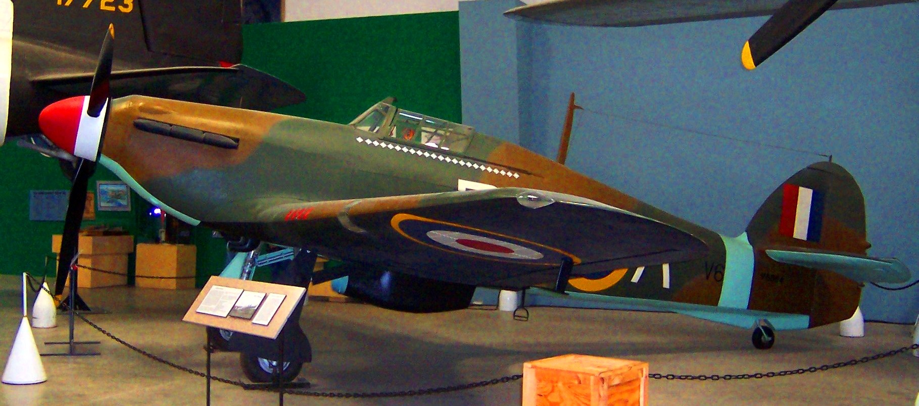 Hawker Hurricane Mk. II (Serial No. V6864).  Ex-RCAF, parts from 5 aircraft.  This fighter was constructed with parts from five Hurricanes, the majority of which were sourced from a Canadian-built aircraft. The aircraft has been modified to represent a Mk. IIb Trop (Serial No. BG974), a fighter flown by US-born pilot Wing Commander L.C. Lance Wade.  He had learned to fly in Tucson, and volunteered for service with the RAF, flying BG974 in North Africa with No. 33 Squadron, RAF in 1942.  He is credited with shooting down 23 aircraft before his death in 1944.  This Hurricane was previously painted in the markings of Robert Stanford Tuck, RAF No. 257 Squadron, summer 1940.