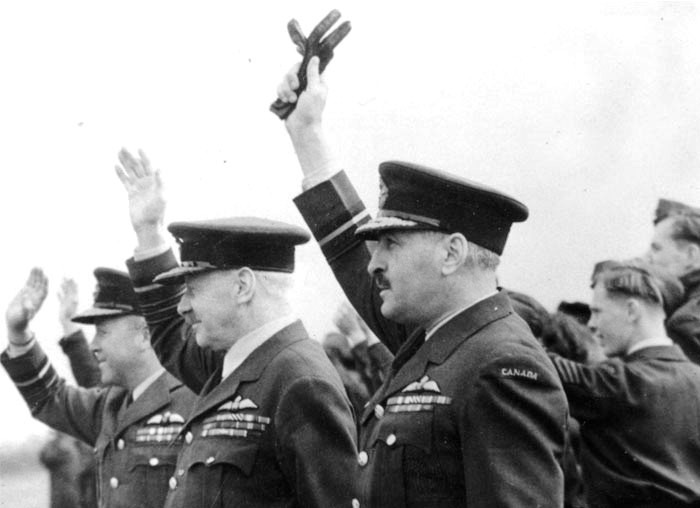 RCAF Air Vice-Marshal Clifford Mackay “Black Mike” McEwen, commander of No. 6 Group, RCAF in the foreground, RAF Air Vice-Marshal Arthur “Bomber” Harris, in the middle, and RCAF AirMarshal G.O. Johnson, AOC RCAF Overseas, in the background, wave goodbye to thefirst of 141 Canadian Lancasters departing for Canada from RAF Middleton St. George, in the UK.