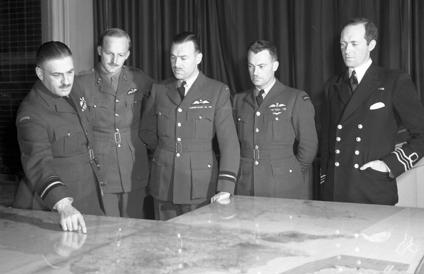 Air Vice Marshal C.M. McEwen, MC, DFC and Bar, Air OfficerCommanding, discusses a point of interest with some of his senior officers.Beside him are, left to right: Major A.K.L. Stephenson, Nelson, BC.; Air Commodore C.R.Slemon, CBE, Winnipeg and Bomanville, Ontario,senior air staff officer; Group Captain J.E. Fauquier, DSO and Bar, DFC, Ottawa, in charge ofoperations; and a Lieutenant-Commander, Royal Navy, 23 May 1944. All branchesof the armed services worked in close harmony as bombing operations againstenemy targets were carefully planned at headquarters of RCAF No. 6 Bomber Groupin the UK.