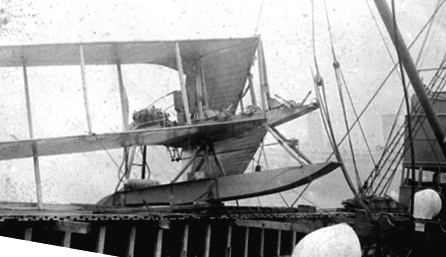 The Burgess-Dunne floatplane, shown here on board the S.S. Athenia, was designed by Englishman J.W. Dunne and constructed by American boat-builder Stirling Burgess. The Burgess-Dunne’s wing span was 47 feet and length was 26 feet from nose to rear floats on the wingtips. It was 11 feet, 6 inches high and had a single float mounted directly under the pilot and passenger seats. Normal cruising speed ranged from 60 to 65 miles per hour.