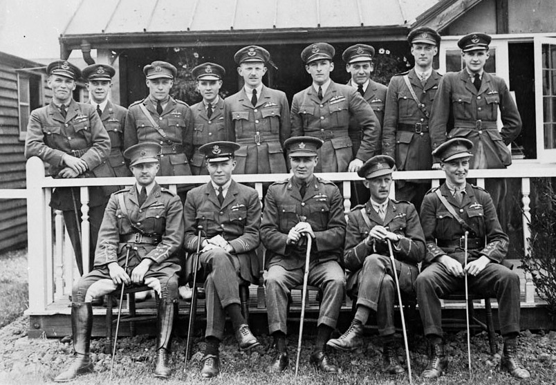 Officers of No. 1 Squadron, Canadian Air Force (CAF), standing left to right: Lt W.L. Rutledge, AFC, MM, Lt P.F. Townley, Lt G.R. Howsam, MC (later Air Vice Marshall), unidentified officer, Lt F.V. Heakes (later Air Vice Marshall), Lt C.M. McEwen, MC, DFC (later Air Vice Marshall), Lt H.A. Marshal, Lt J. Whitfield, and an unidentified officer. Seated left to right: Capt D.R. MacLaren, DSO, MC, DFC, Capt G.O. Johnson, MC (later Air Marshall), Maj A.E. McKeever, DSO, MC, (CO of the squadron), Lt J.T. Verner, Capt C.F. Falkenberg, DFC, 13 June 1919.