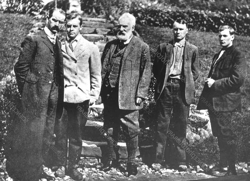 Members of the Aerial Experiment Association in 1907, (left to right): J.A.D. McCurdy, Lt. Thomas Selfridge, Alexander Graham Bell, Frederick ‘Casey’ Baldwin, Glenn H. Curtiss.