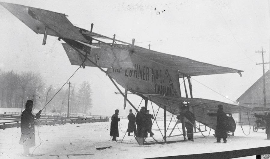 Lohner No. 1 aircraft being prepared for test flight, Rideau Canal, Ottawa, 14 March 1910. A group directed by the German mechanic George Lohner constructed this ungainly-looking glider, which flew at least once. As recorded in the Ottawa Citizen, 22 July 1910, it was towed aloft that day by a motorcar on the grounds of Landsdowne Park. In this winter scene the crowd appears to be getting it ready to be towed aloft.