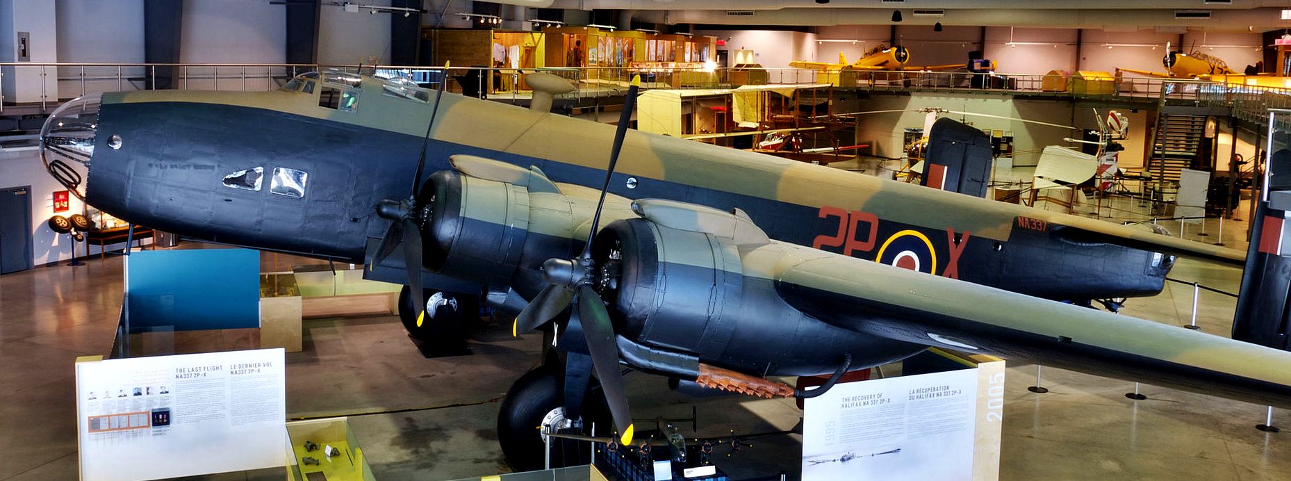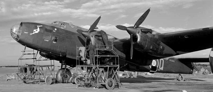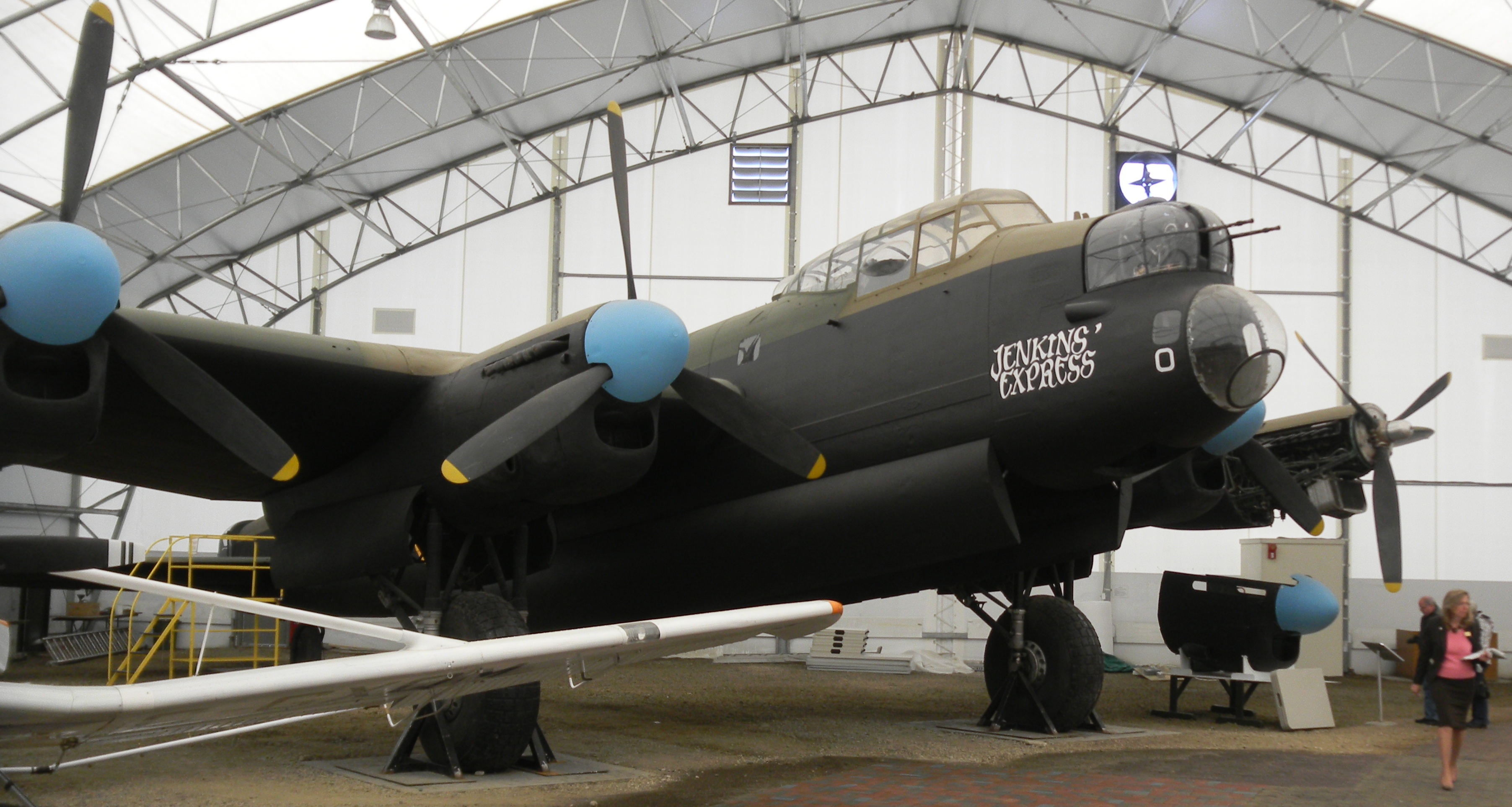 Avro 683 Lancaster Mk. X (Serial No. FM159), F2-T, painted as KX159, restored with all four of its engines in running condition.  FM159, F2-T, is named in honour of Canadian born Ian W. Bazalgette, VC, 635 Squadron, and is currently displayed in the National Bomber Command Air Museum, Nanton, Alberta.