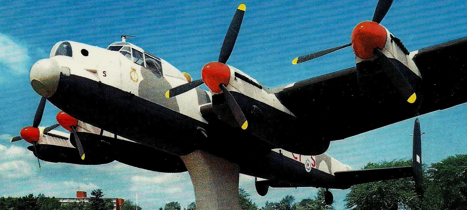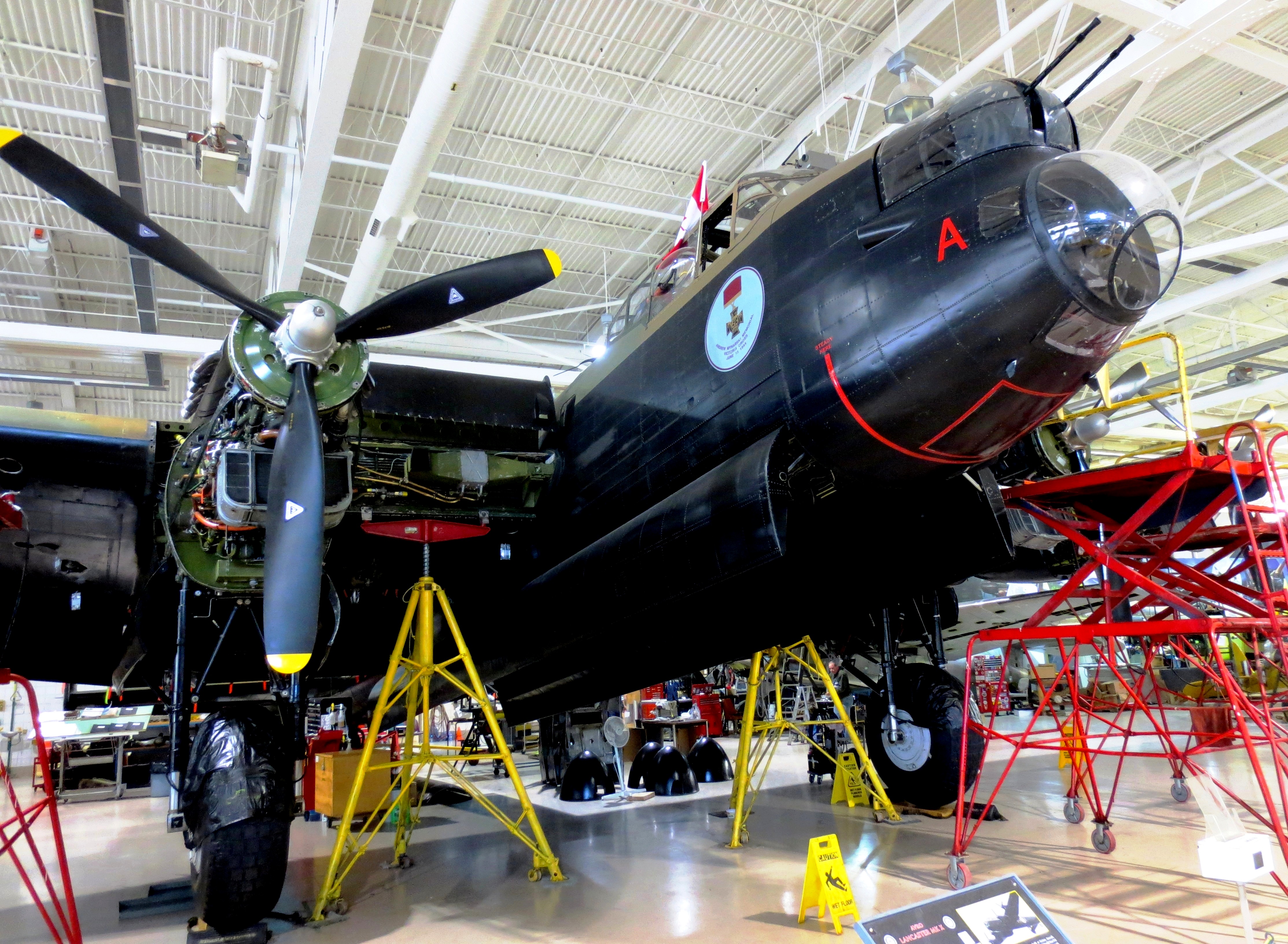 Avro 683 Lancaster Mk. X (Serial No. FM213), C/N 3414, painted as (Serial No. KB726), Reg. No. C-GVRA.  This aircraft was built at Victory Aircraft, Malton in July 1945 and was later converted to an RCAF Mk. 10MR configuration.  In 1952 it has a serious accident and received a replacement wing centre section from a Lancaster that had flown in the air war over Germany.  It served as a maritime patrol aircraft, with No. 405 Squadron, Greenwood, Nova Scotia and No. 107 Rescue Unit, Torbay, Newfoundland for many years, until it was retired from the RCAF in late 1963.  With help from the Sulley Foundation in 1977, it was acquired from the Royal Canadian Legion in Goderich, Ontario, where it had been on outside display.  Eleven years passed before it was completely restored and flew again on 24 Sep 1988.  The Lancaster is dedicated to the memory of P/O Andrew Mynarski, VC, and is referred to as the “Mynarski Memorial Lancaster”.  It is painted in the colours of his aircraft (Serial No. KB726), VR-A, which flew with RCAF No. 419 (Moose) Squadron. Canadian Warplane Heritage Museum, Mount Hope, Ontario.