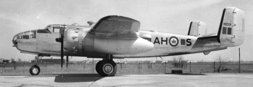 North American B-25 Mitchell, RCAF (Serial No. HD331), AH-S, 3 July 1951.  Built as a B-25D (Serial No. 43-3844), this aircraft served at 5 OTU, Boundary Bay, later with No. 406 Squadron, Saskatoon, where it crashed on 13 August 1954,.  The remains were scrapped