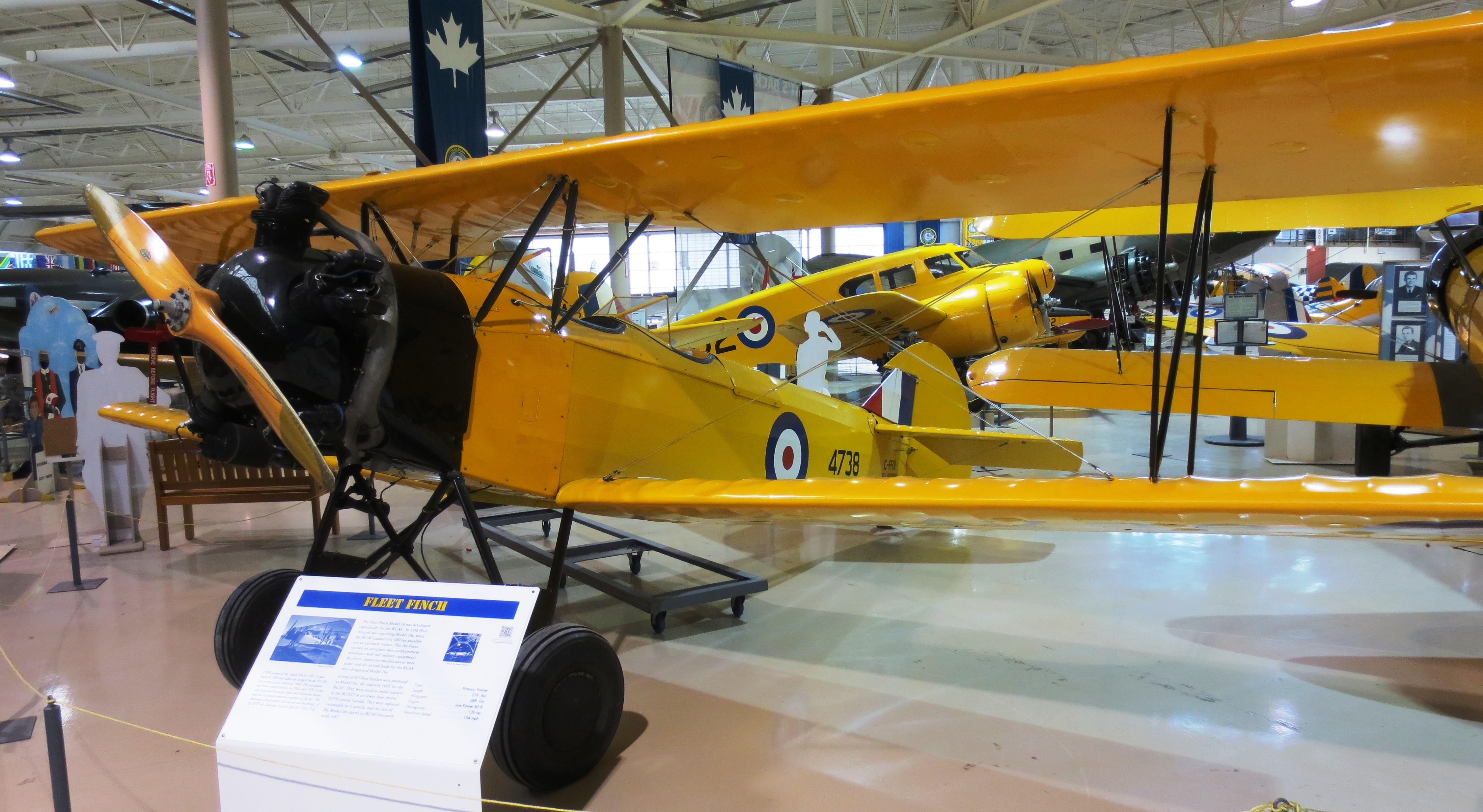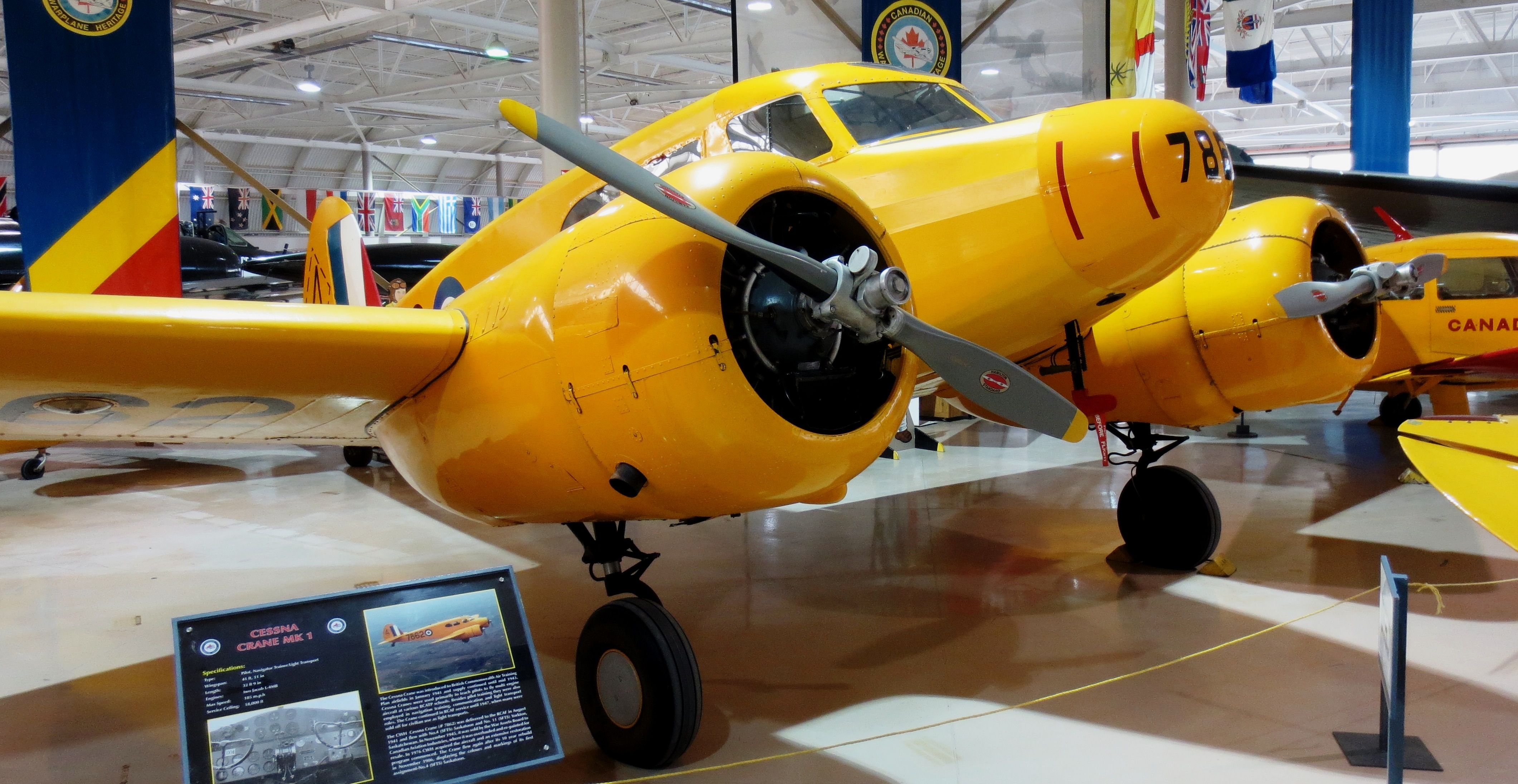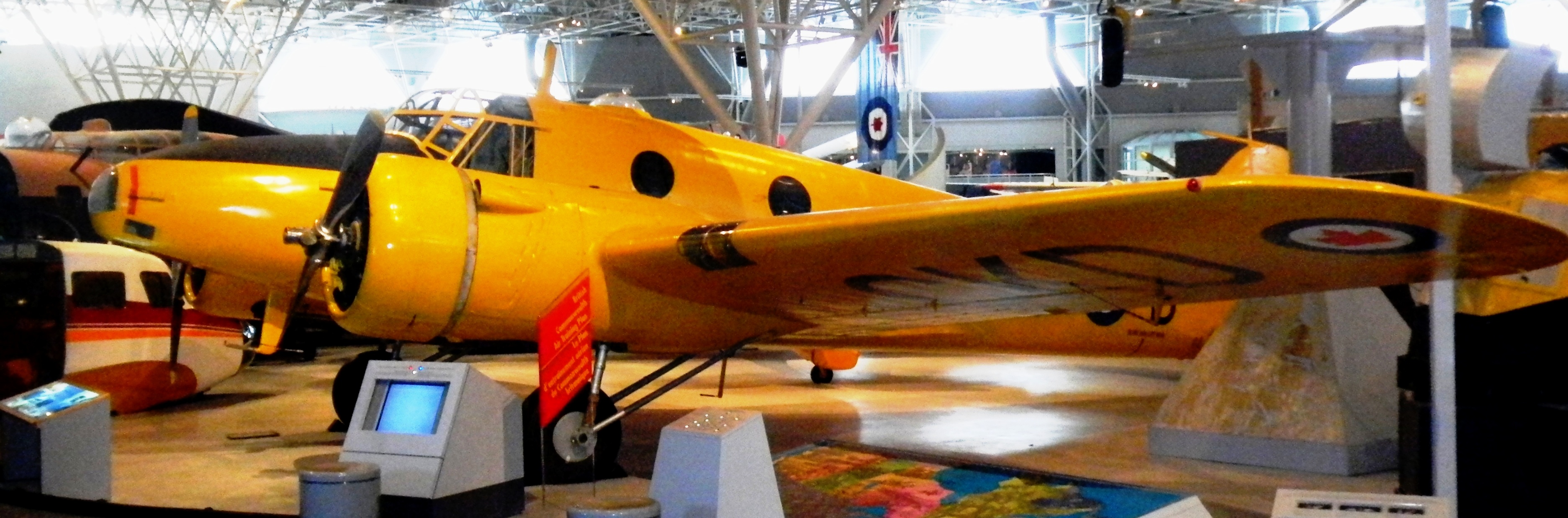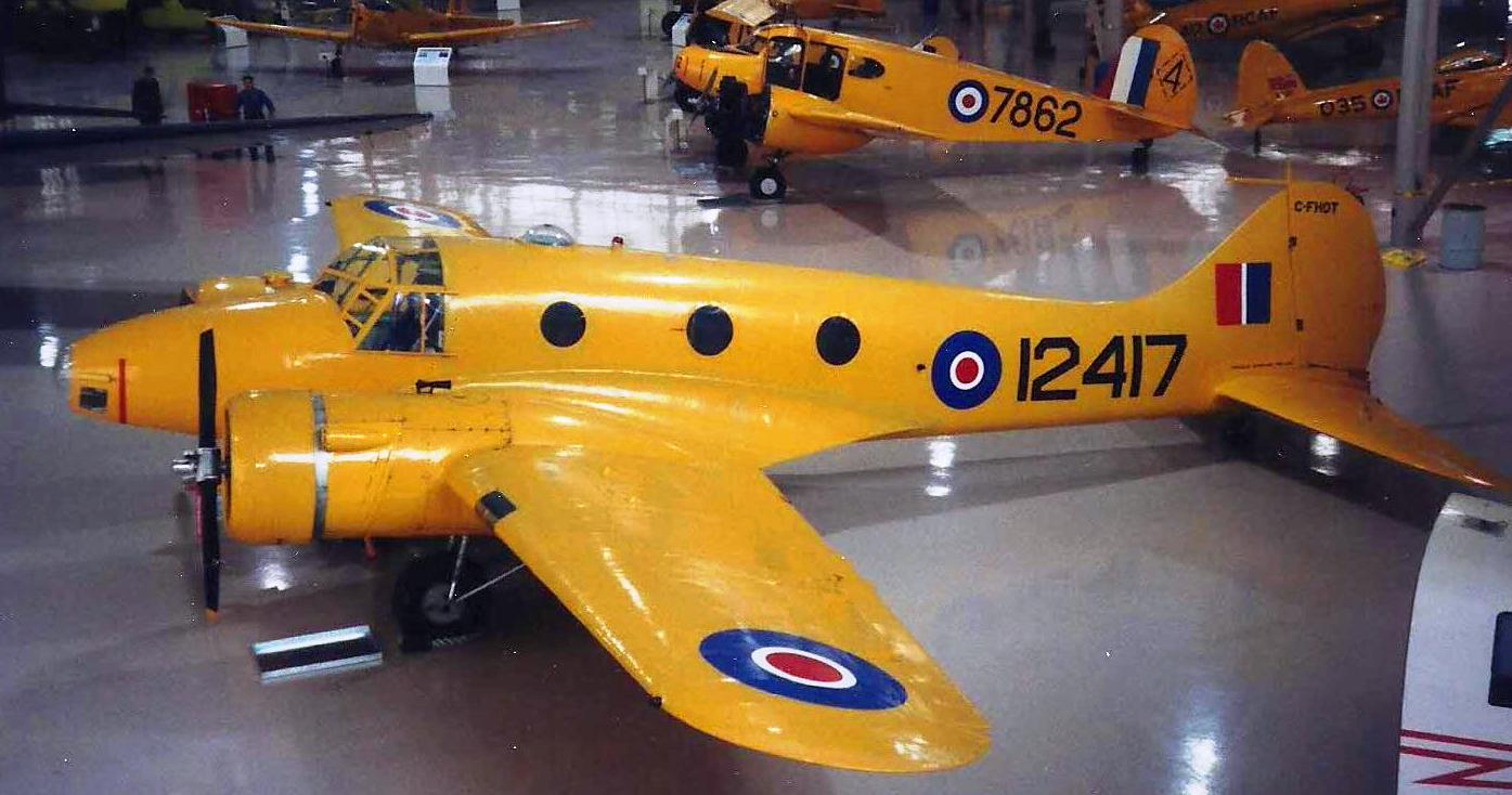 Avro 652A Anson Mk. V-P (Serial No. 12417), BRC 1567, CF-HOT.  The CWHM’s Anson was built by MacDonald Brothers in Winnipeg in 1944.  It flew with RCAF No. 7 Photographic Wing and No. 414 Squadron in Ottawa on photo survey work until the late 1940s.  In 1956, it was purchased by INCO and used for mineral surveying until 1980, when it was donated to the Museum.  The Anson is now rigged internally as a navigation trainer, which was its primary role in the British Commonwealth Air Training Plan (BCATP).  It is painted in the yellow colour common to all BCATP trainers and carries its wartime RCAF markings.  Canadian Warplane Heritage Museum, Mount Hope, Ontario.